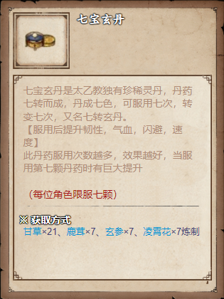 七宝玄丹是太乙教独有珍稀灵丹,丹药七转而成,丹成七色,可服用七次,转变七次,又名七转玄丹。