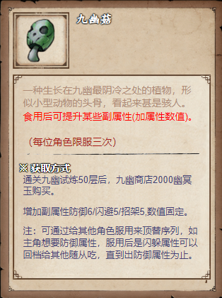 注:可通过给其他角色服用来顶替序列,如主角想要防御属性,服用后是闪躲属性可以回档给其他随从吃,直到出防御属性为止。
