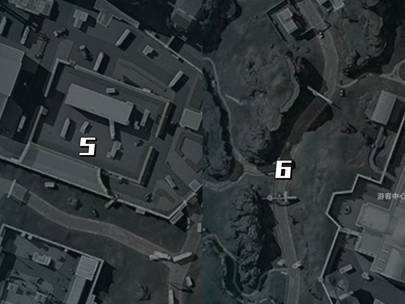 5号空投降落点位在行政楼东楼旁边的停车场,也就是保险柜任务所在地点旁边的空地上;最后6号空投降落点位在小军营和游客中心之间的公路上,具体一点就是在地图上T字路口附近。