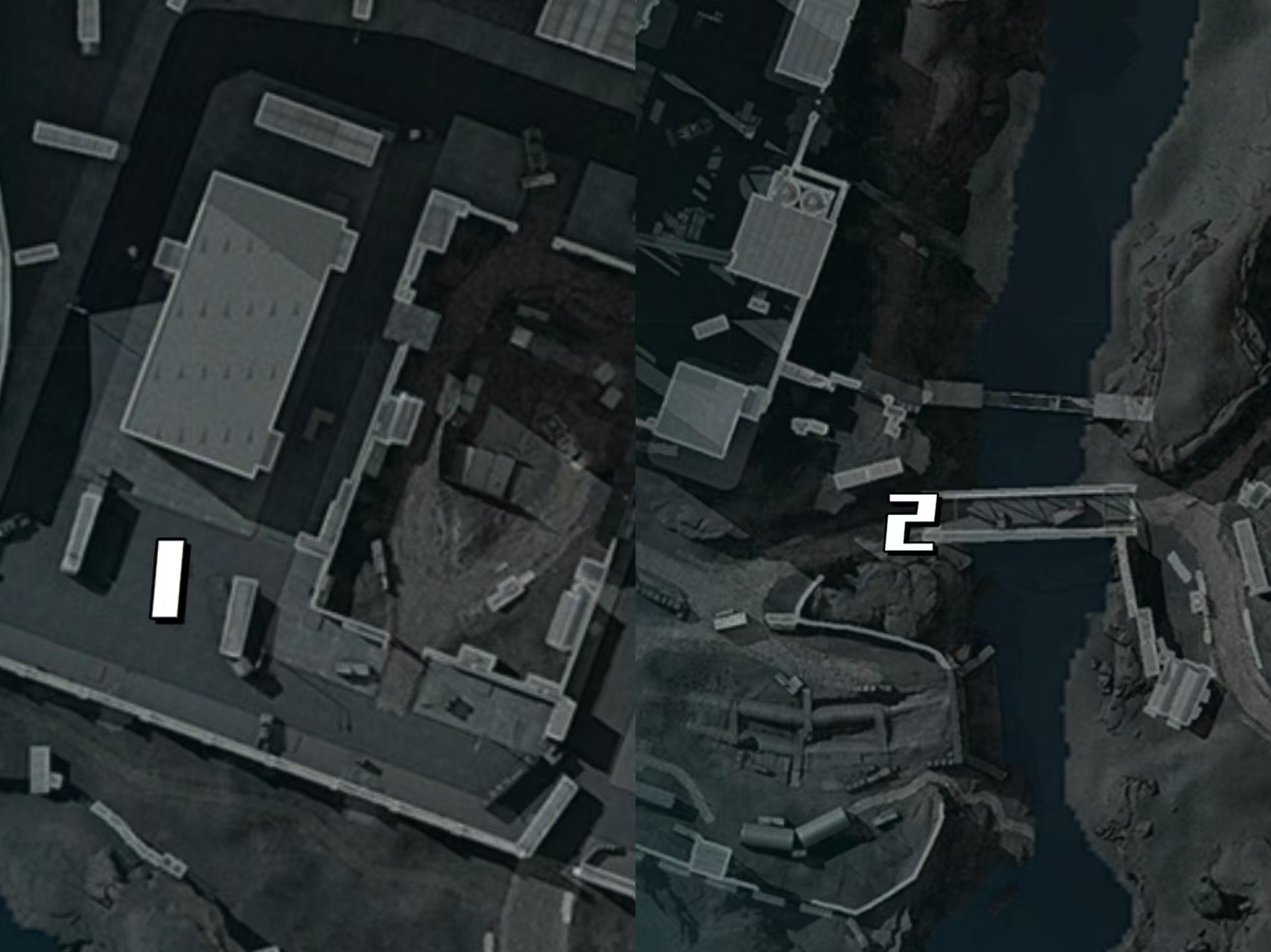 1号空投降落点位就在行政楼西侧工地旁,也就是从军营主路刚刚进入行政楼区域看到的第一个货车旁的空地上;2号空投降落点位在水泥厂旁边的桥上,具体一些就是在靠近水泥厂侧桥头空地上。