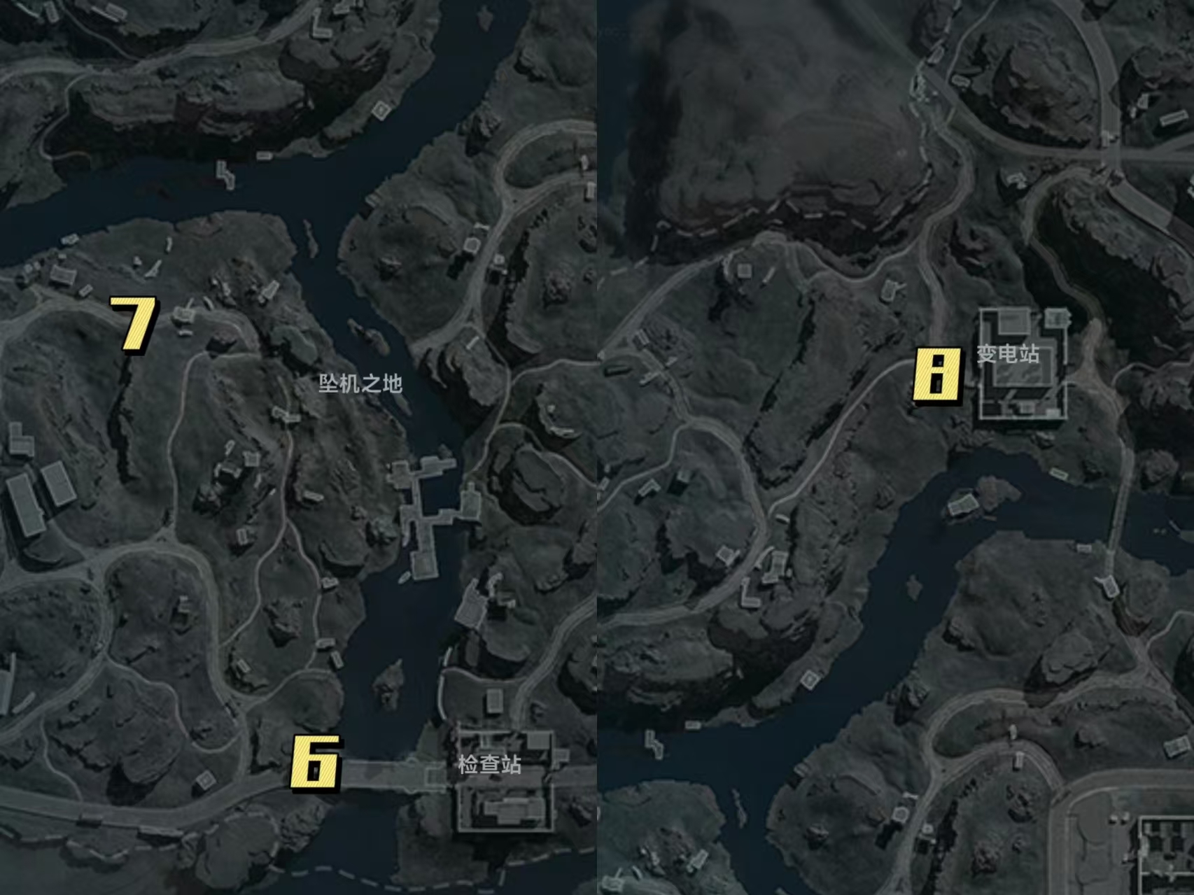6号空投点位在检查站左侧的小桥尽头;7号空投点位在沙径牧场地图方向右上角,也就是通往坠机之地的主要公路上;8号空投点位则在变电站左侧公路上。