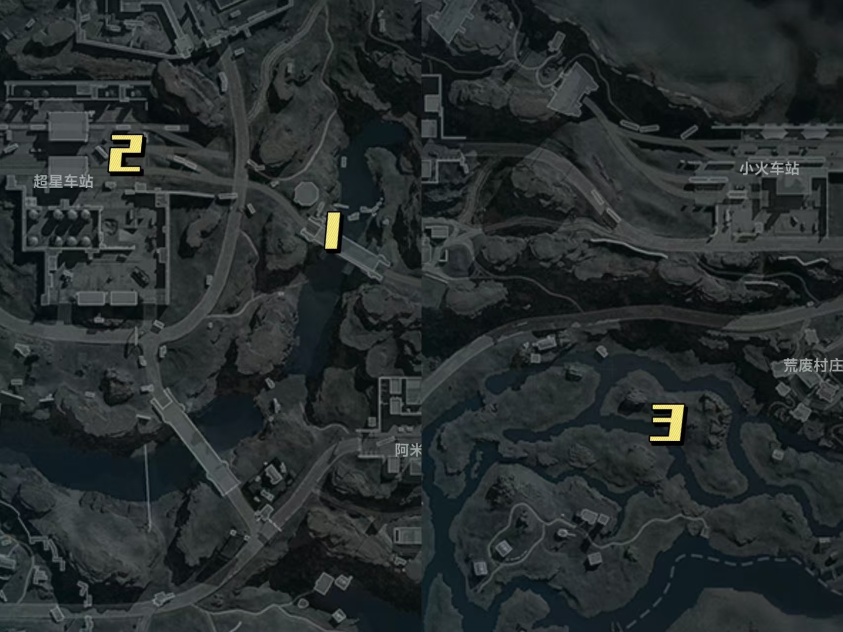长弓溪谷1号空投点位在超星车站地图区域右侧的小桥上;2号空投点位火车站两个轨道中间空地上;3号空投在荒废村庄地图方向左方向的雷区旁边。