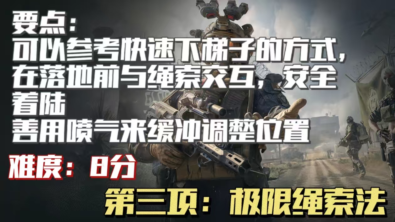 第三项“极限绳索法”算是“铁人三项”中比较简单的一项了,熟悉“快速下梯子”方法的彦祖亦菲一定非常迅速能上手这个操作,流程如下:找到合适的位置直接跳入深坑,可以利用威龙的喷气在落地前将自己位移到下滑的绳索旁边,然后快速触发绳索的交互然后落地就大功告成啦~