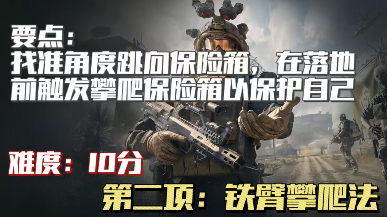 众所又周知,GTI干员们拥有一双无人能比的“铁臂”,一手“攀爬”成就了不少冥场面,所以第二项“铁臂攀爬法”就是依靠我们在下落到坑底的一瞬间攀爬上保险箱(推荐PC端操作,更容易实现)进而保护自己——简单来说就是冲着保险箱的方向奔跑掉入深坑,在马上要接触到保险箱的一瞬间触发攀爬,这项操作流程并不复杂,但是对时机和手速有一定的要求,建议在队友的看护下尝试这一项动作。