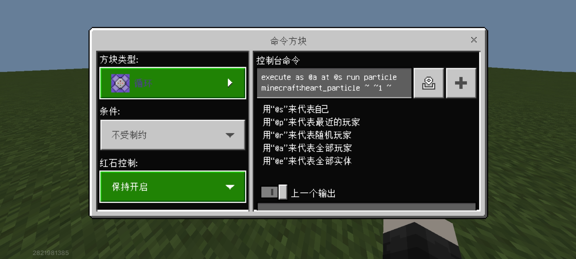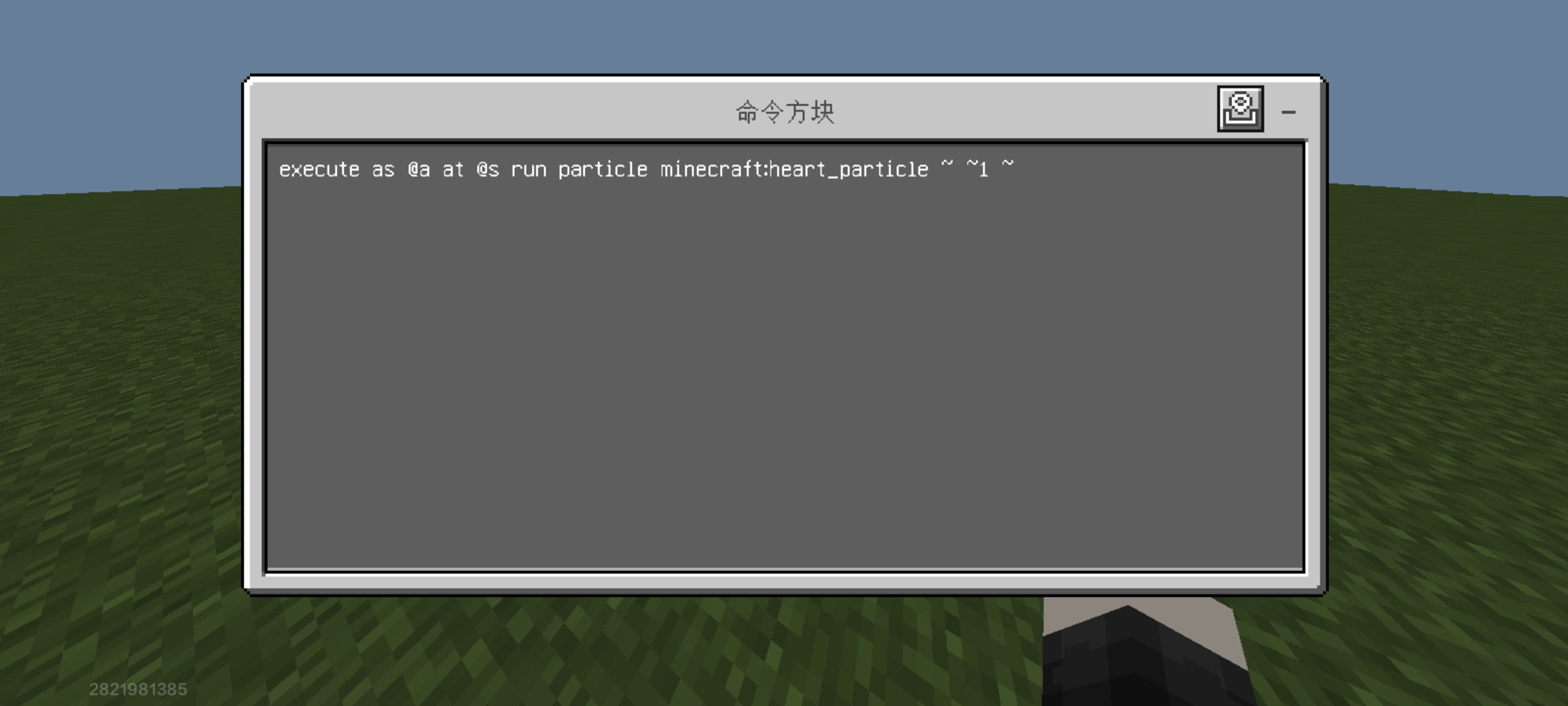 4.在编辑栏内输入execute as @a at @s run particle minecraft:heart_particle ~ ~2 ~