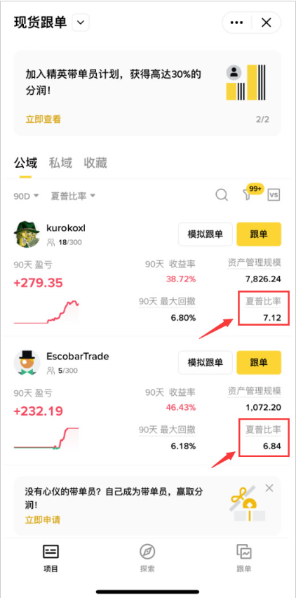 6.之后我们还需要看一看这个交易员的90天盈亏,和90天的回报率之比。你可以看到第一个交易员90天赚了275.59刀,第二个赚了232.19刀,我们就可以跟第一个人来进行跟单。