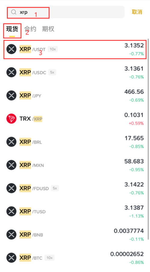 2.输入XRP,这时下拉会显示现货XRP/USDT,点击XRP/USDT。