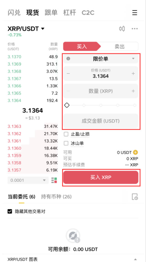 4.依次选择限价单-购买价格-购买数量-成交数量,设置好之后,点击买入XRP即可。