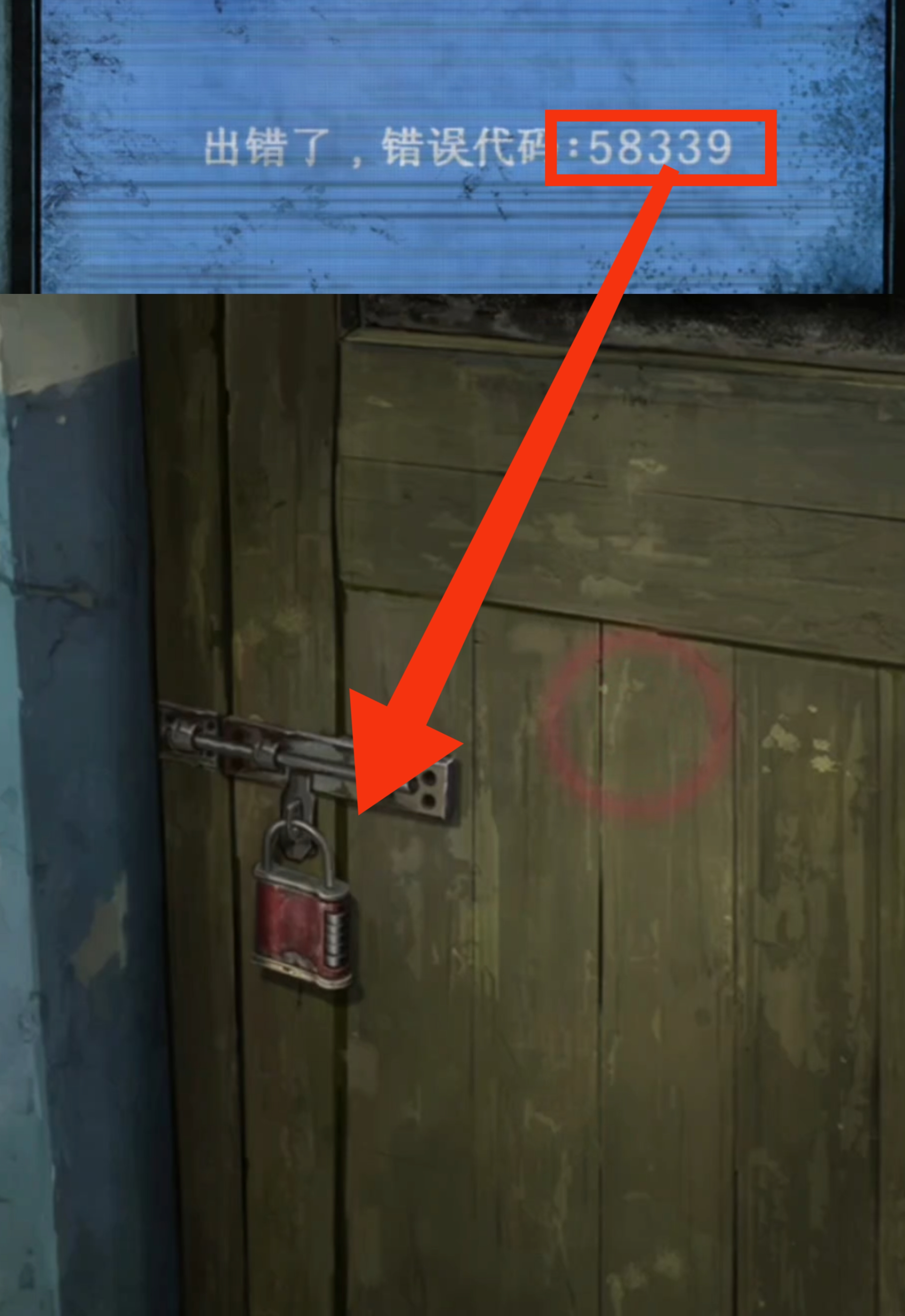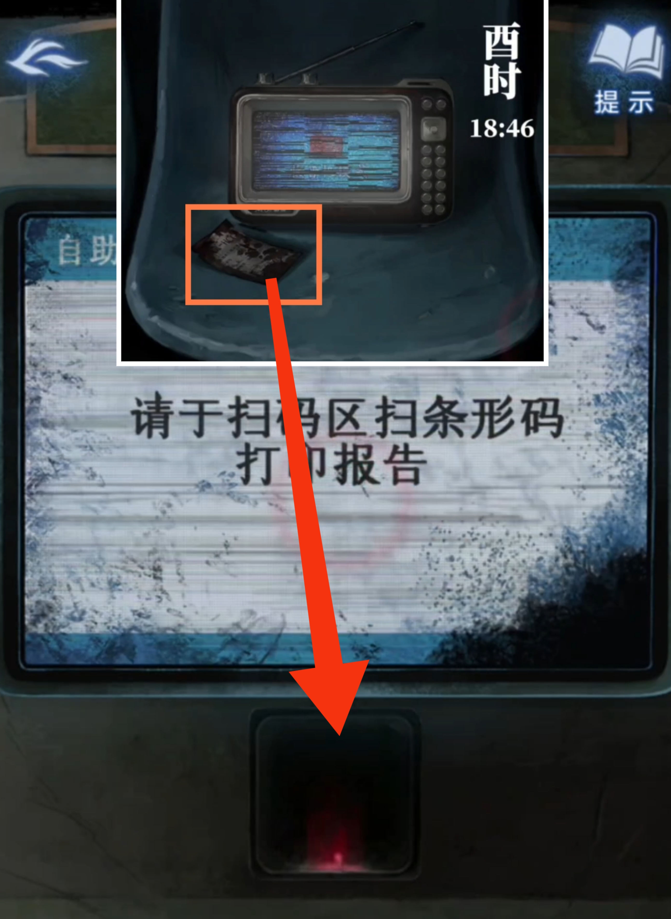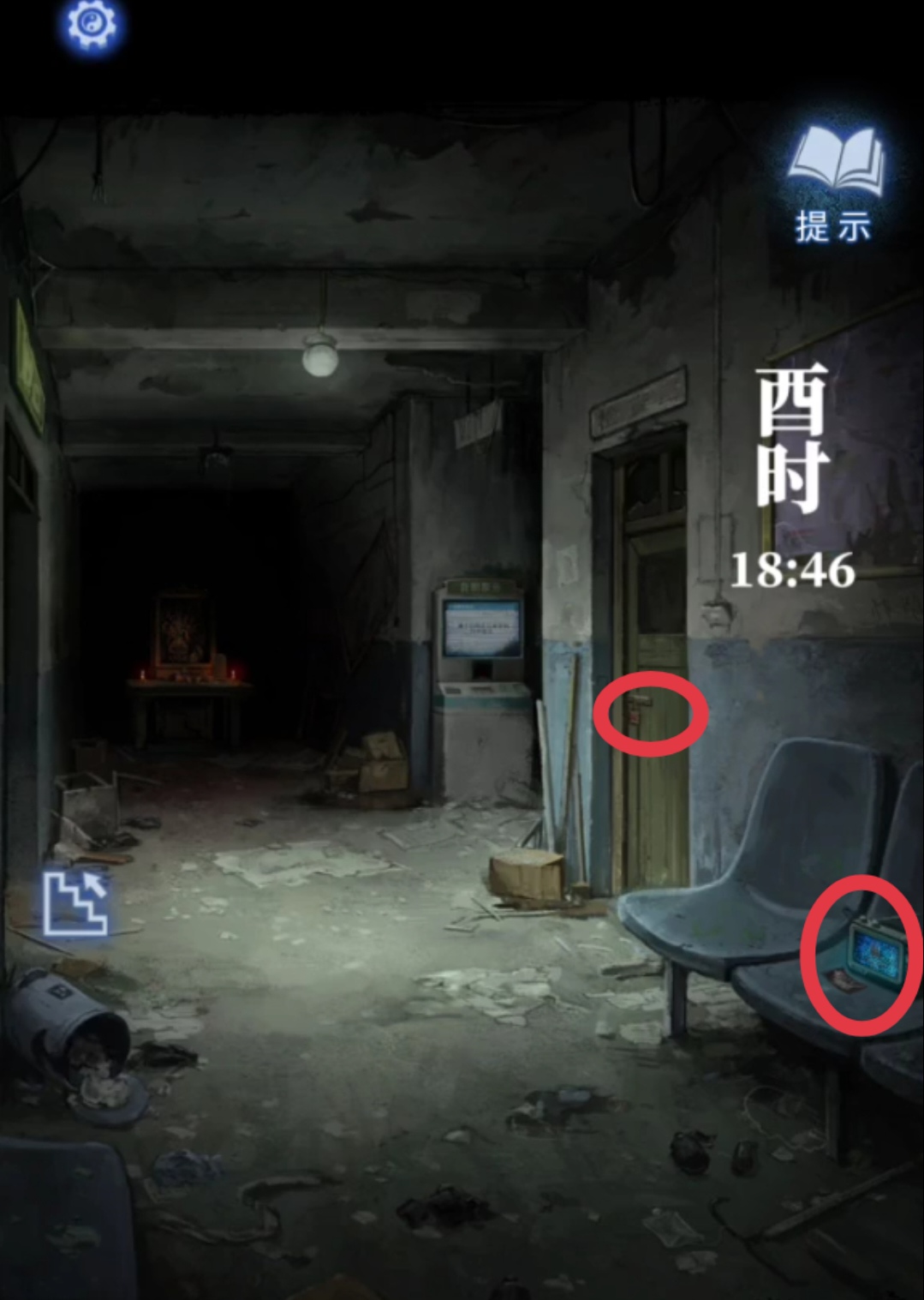 1. 来到废弃医院后,点击右边塑料椅子上的唱戏机,拿走唱戏机旁边被污染的【凭条】。返回后检查检查区的大门,从门锁上的提示得知,需要找到跟【红色】有关的【5位数密码】。
