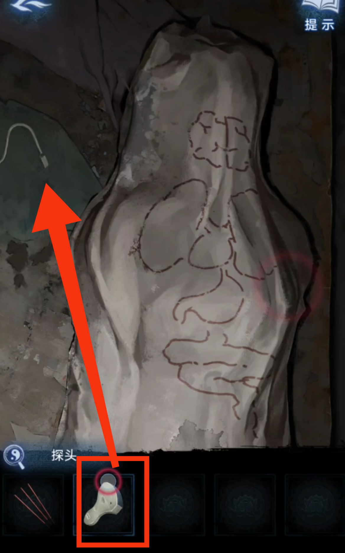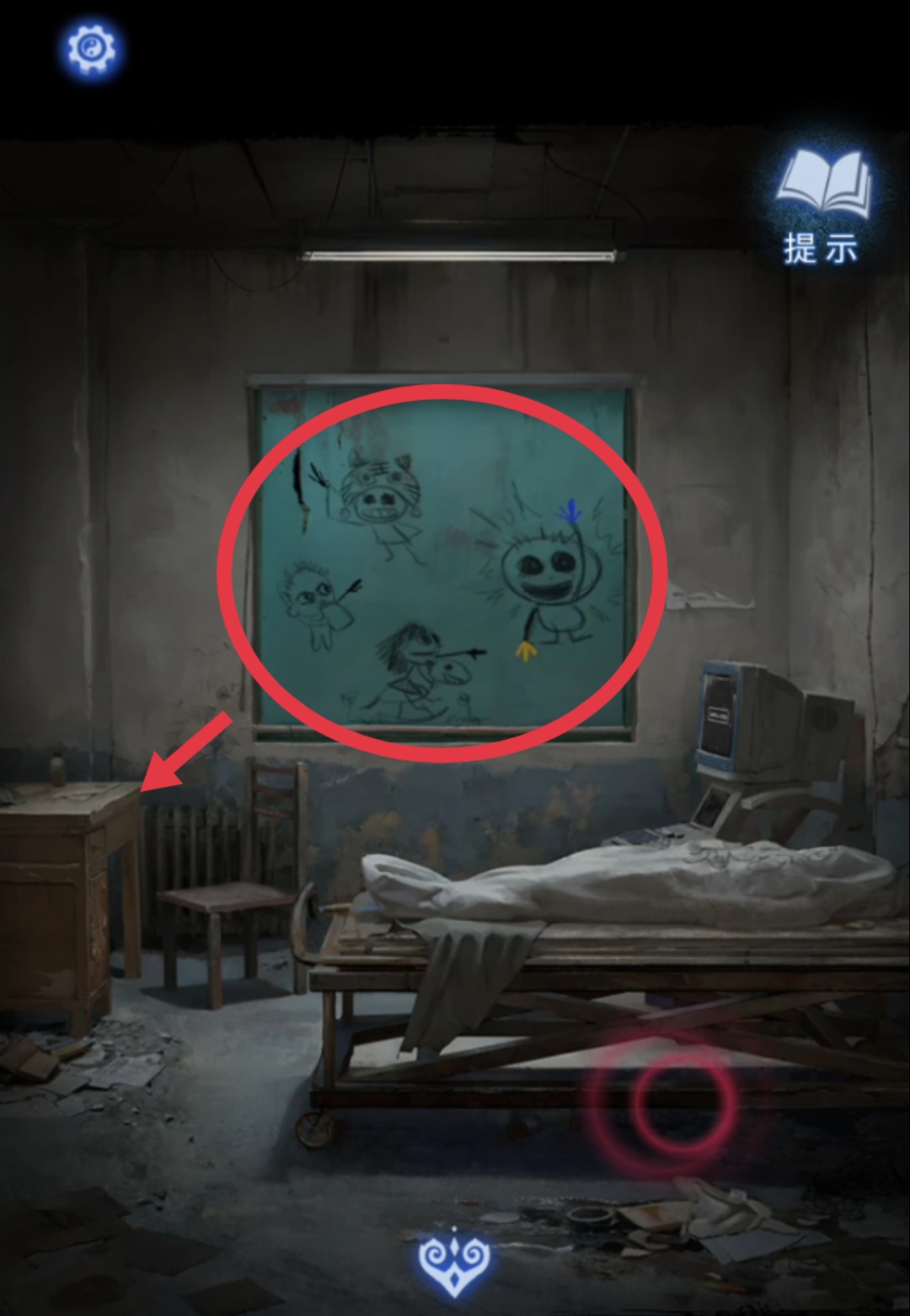 7. 在一楼走廊上,点击老太太的遗像,再把【布娃娃】放在椅子下面被粉笔画过的地方,得到【小人雕像】。把【小人雕像】放在检查区书桌那里还没有解开的谜题上,得到【探头】。