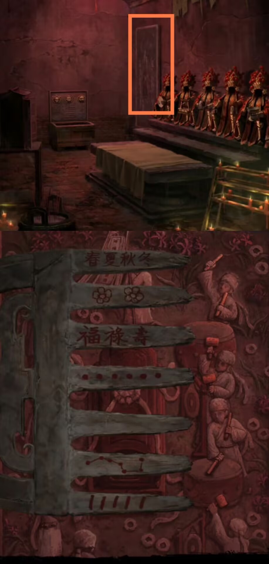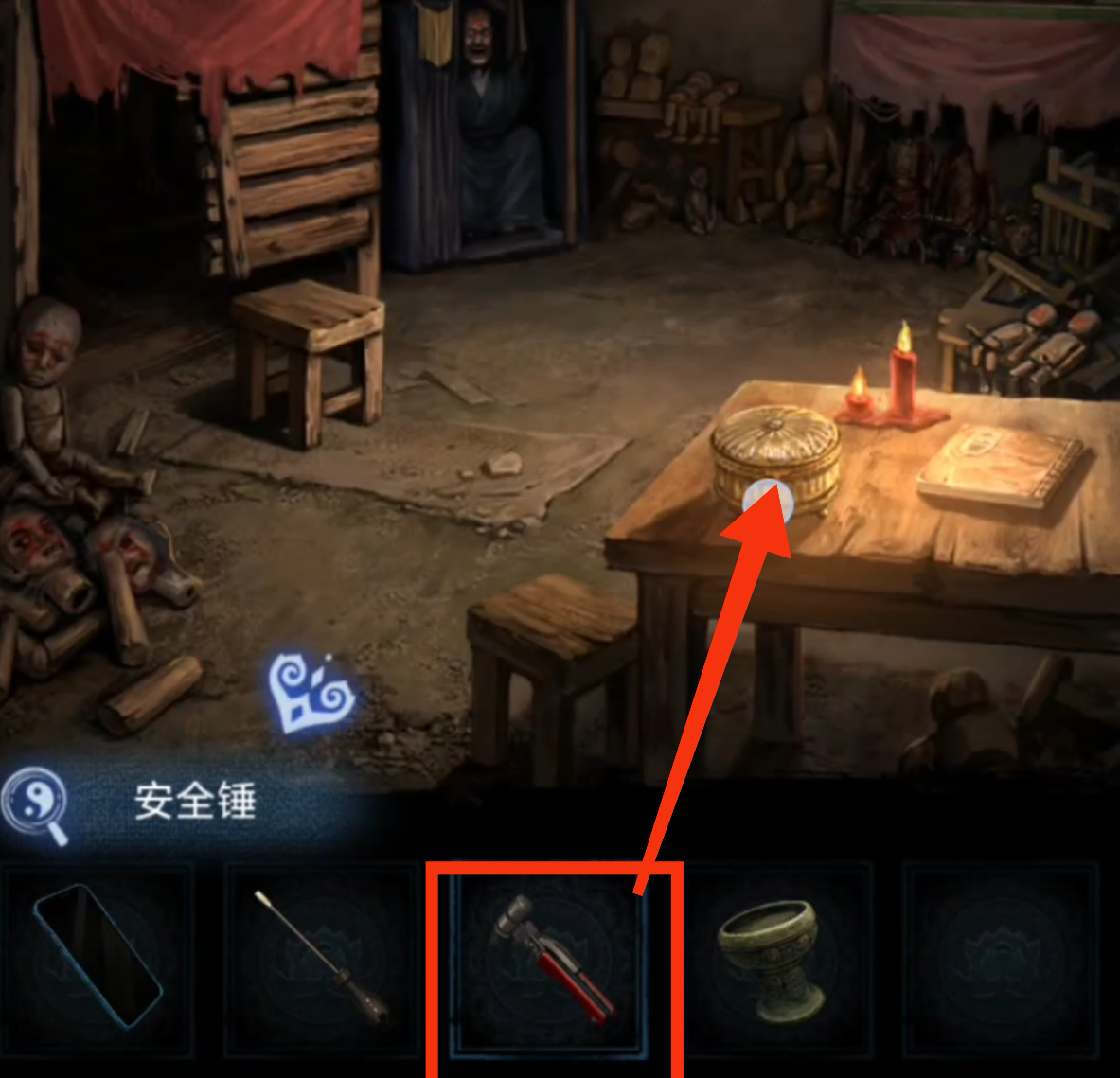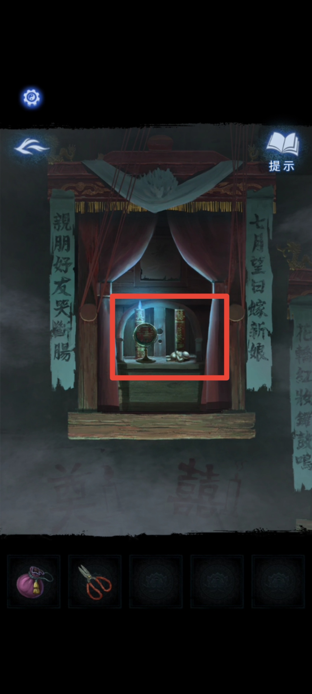 在神龛这里放上【龙凤花烛】,直接向左拉动,在最左的神龛下方可以看到点蜡烛的提示之一,然后结合神龛两边象征着红白事的对联的另一个提示,从左至右按照【点燃、不点、不点、点燃、点燃、不点、不点、点燃】来点蜡,得到【梳妆镜和无面铜人】。