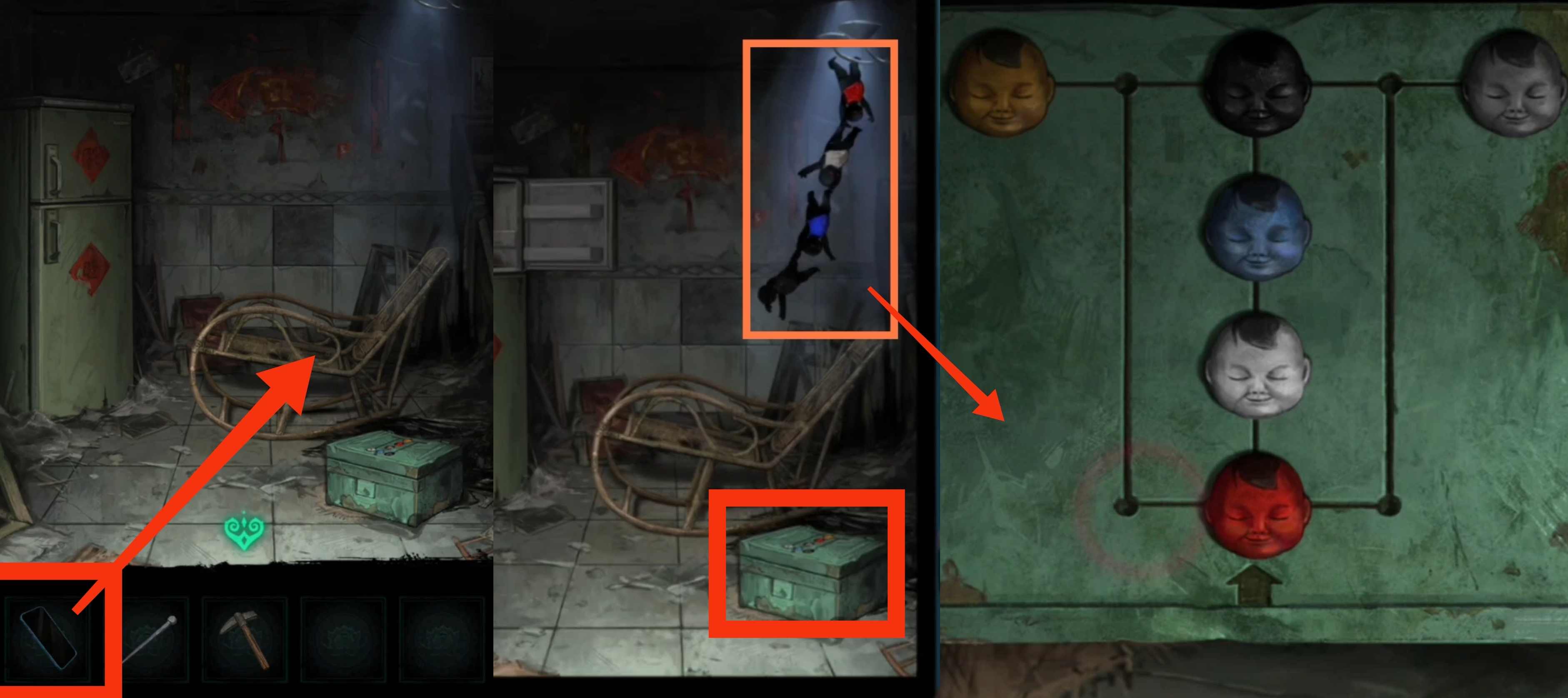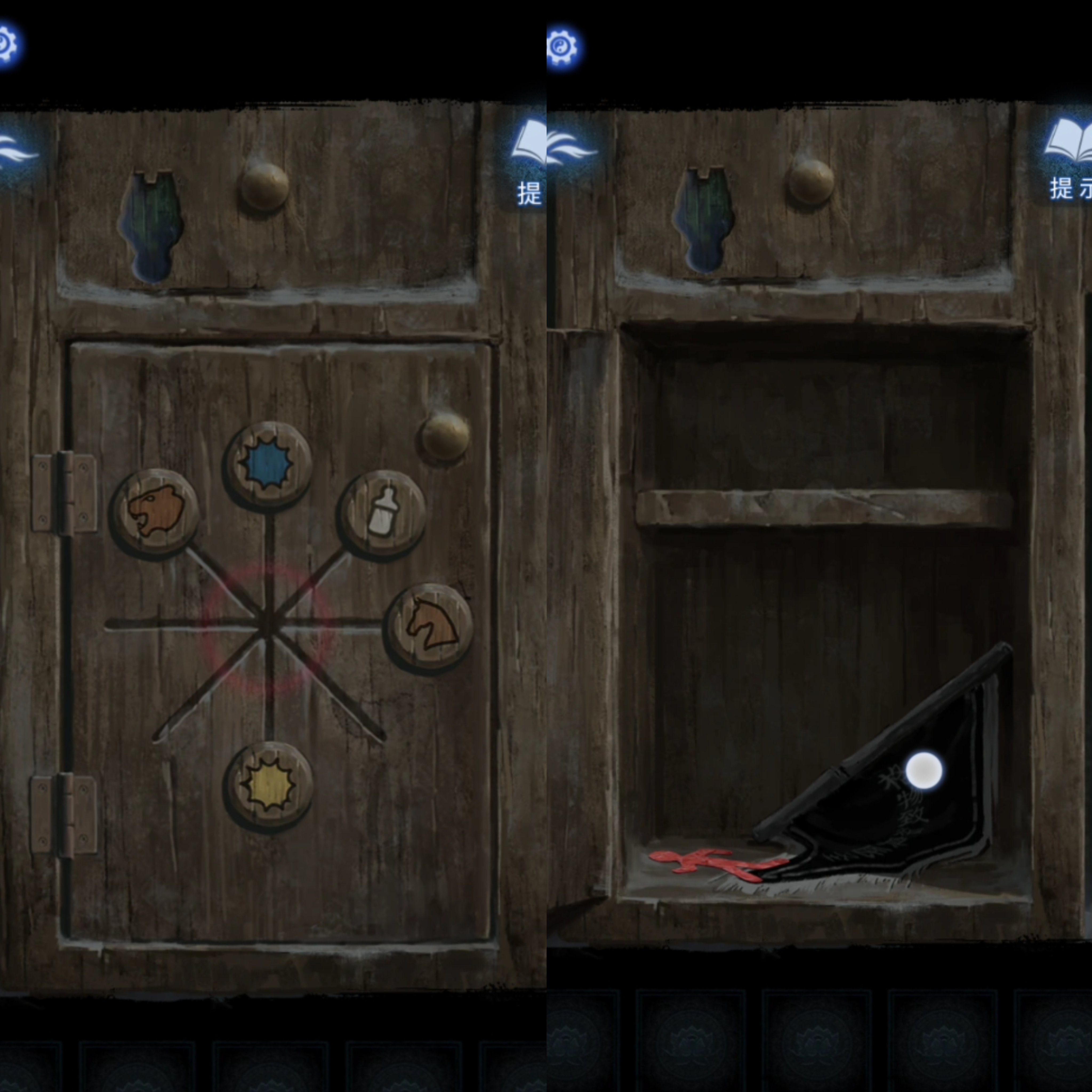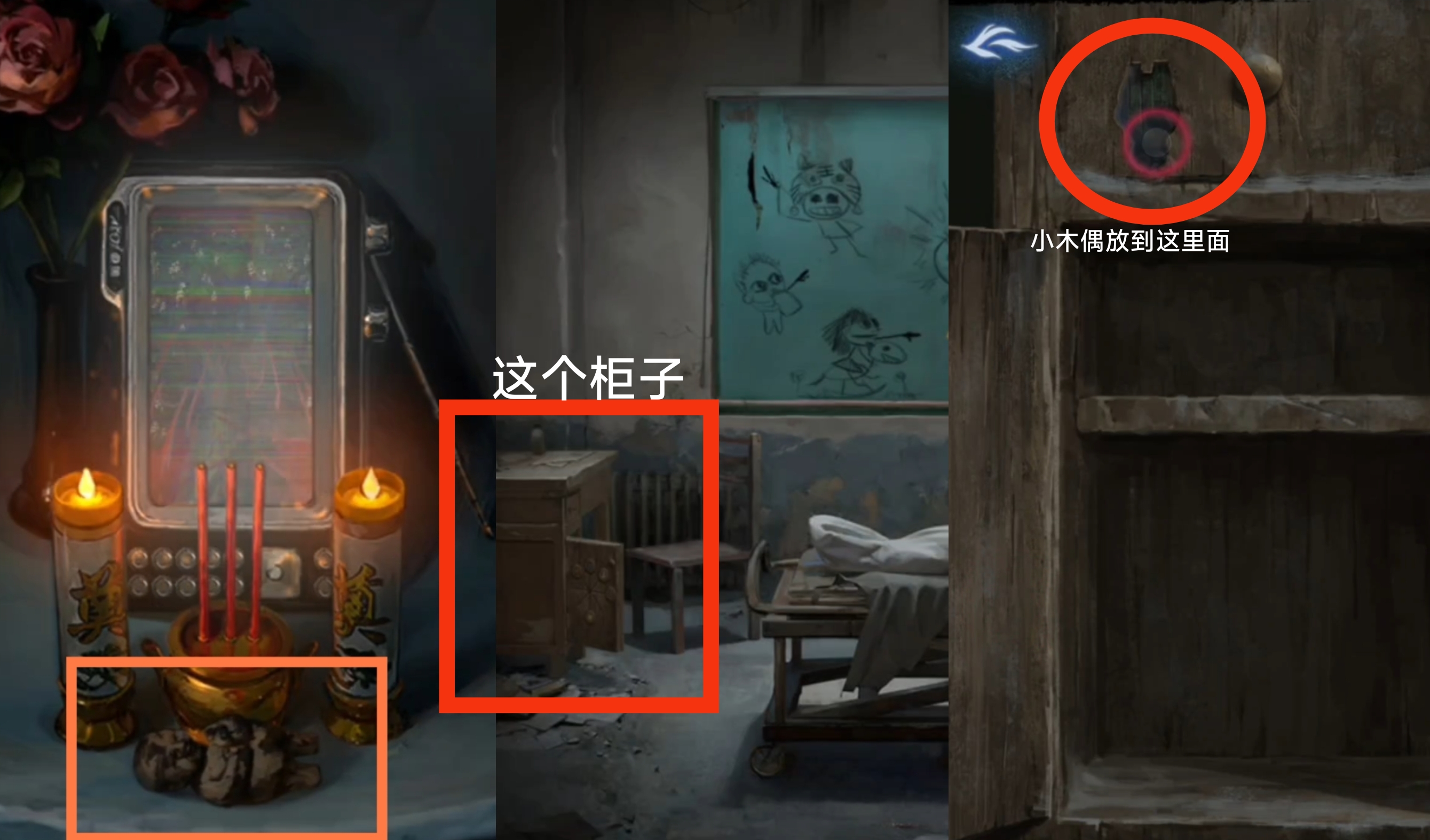 在神龛这里放上【龙凤花烛】,直接向左拉动,在最左的神龛下方可以看到点蜡烛的提示之一,然后结合神龛两边象征着红白事的对联的另一个提示,从左至右按照【点燃、不点、不点、点燃、点燃、不点、不点、点燃】来点蜡,得到【梳妆镜和无面铜人】。