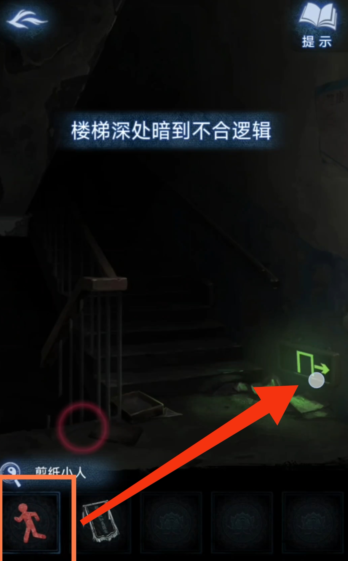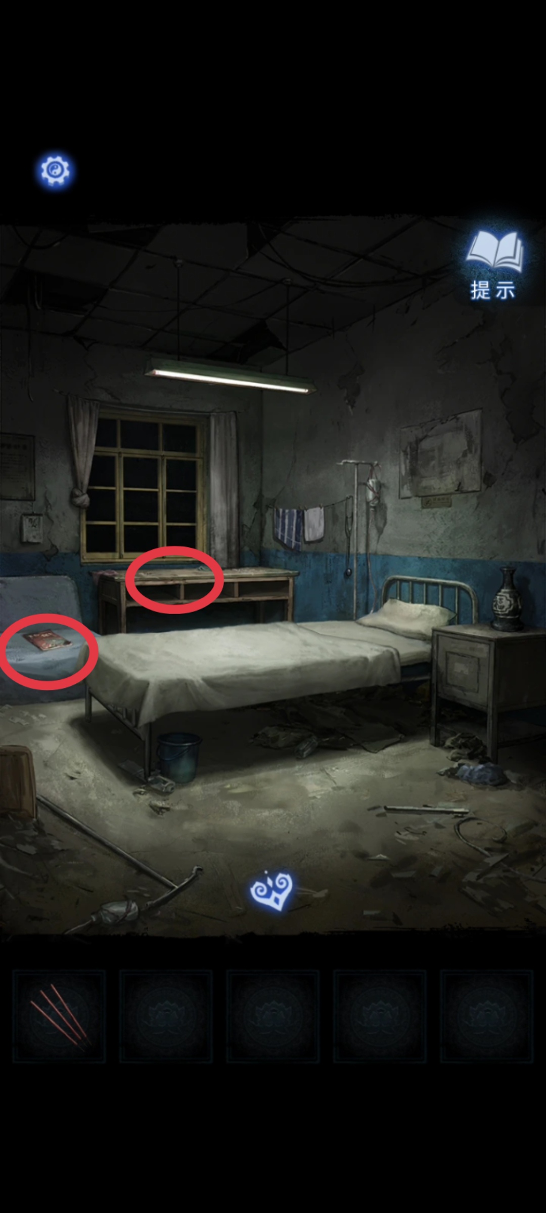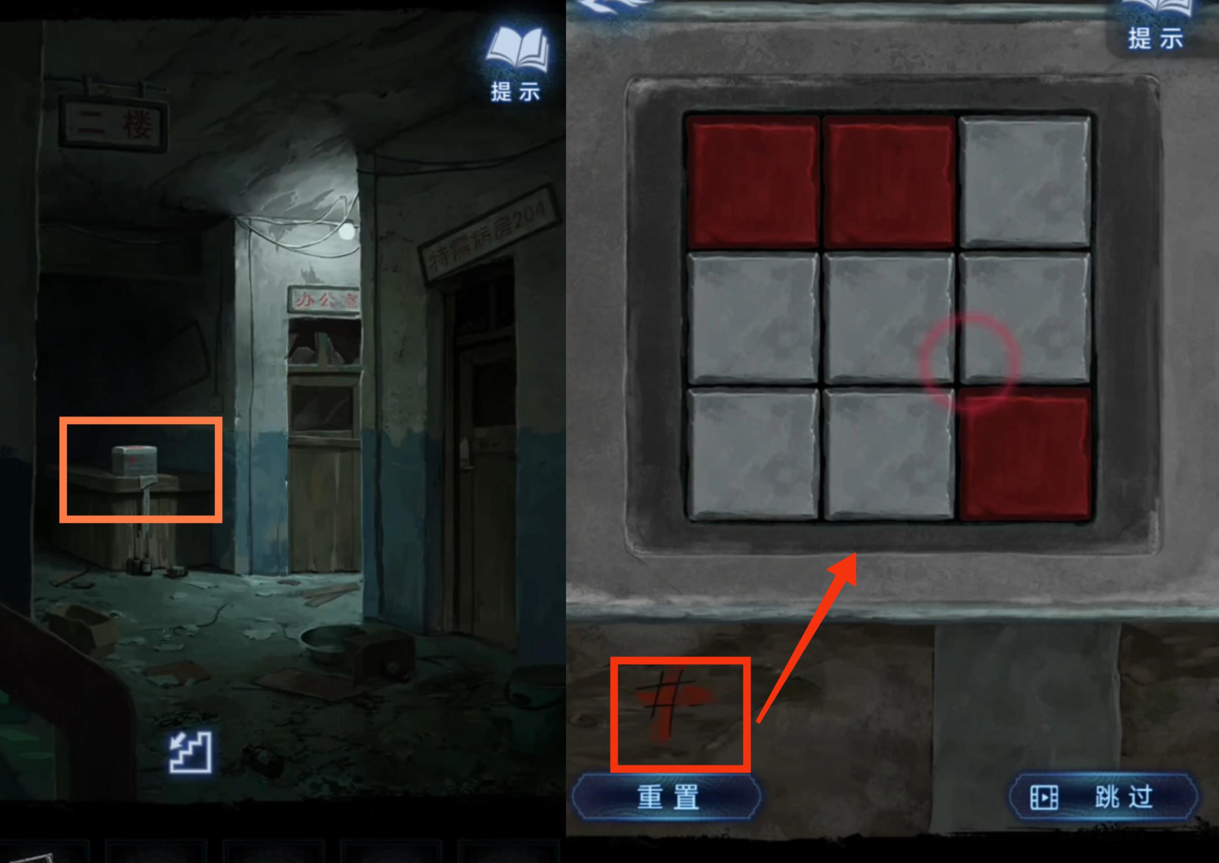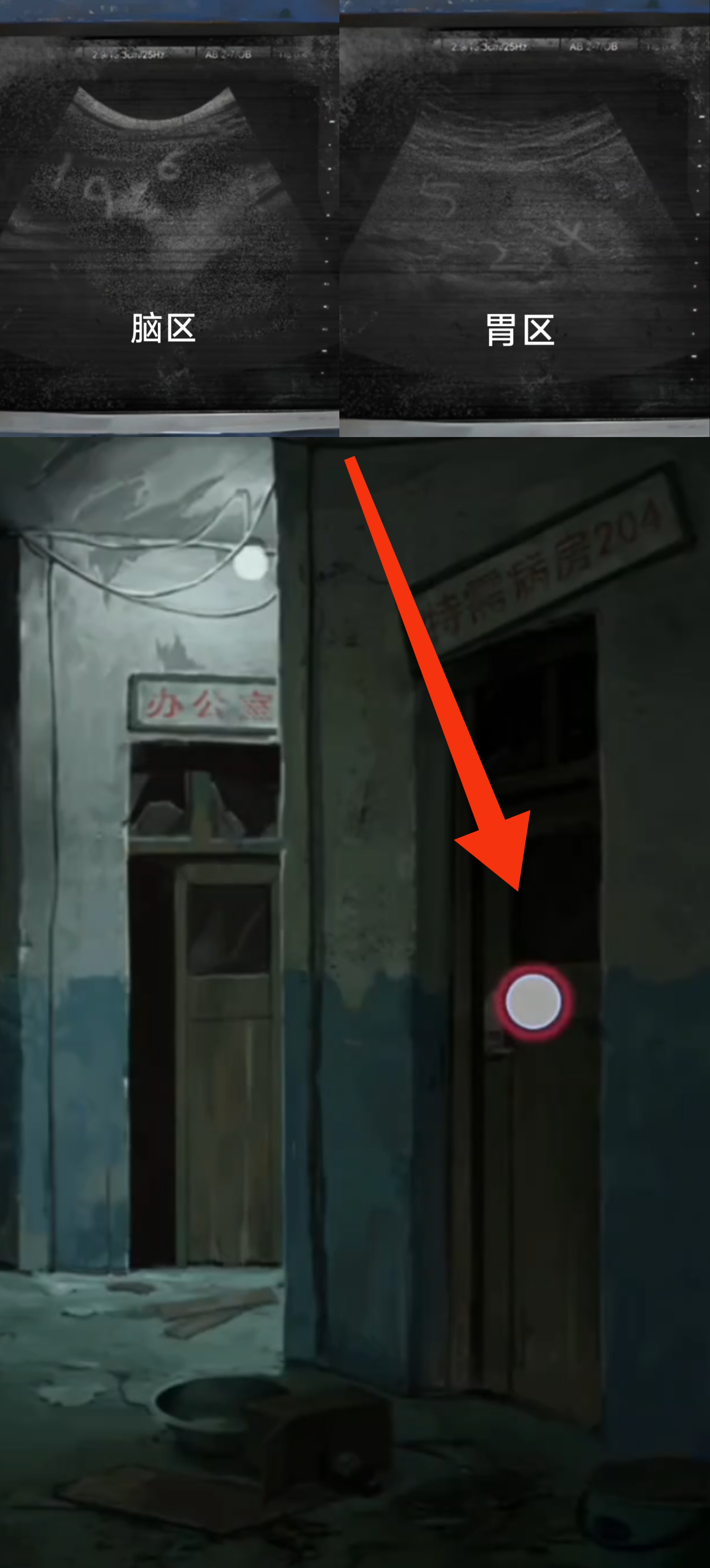 4. 回到医院走廊跟老太太互动完上楼,在楼梯间的安全出口标志上贴上【红色纸人】,就能上二楼。检查特需病房204,得到开锁提示跟【大脑和胃有关】,检查办公室,得到【需要用东西撬开木板】的提示。