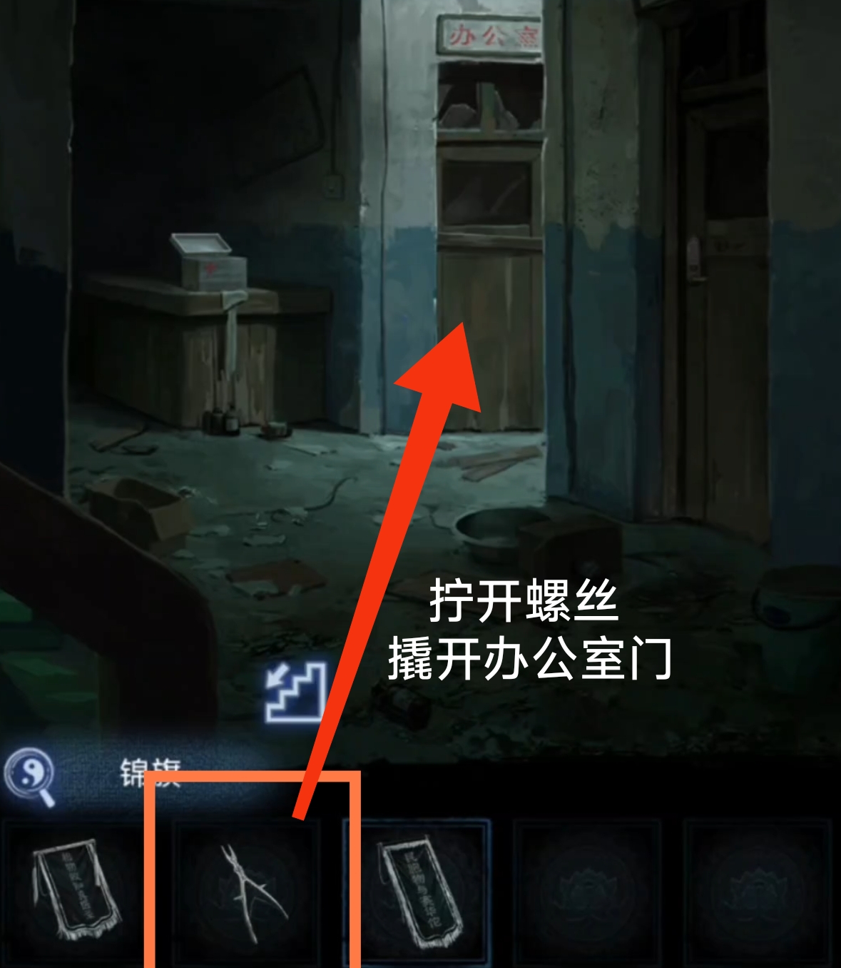 5. 然后去开二楼前台上的盒子,开盒提示按照盒子上的进行翻转操作,得到【锦旗和医用钳】。用【医用钳】撬开办公室大门的木板后进屋,检查电脑,得到需要一个【墨盒】的提示后返回。