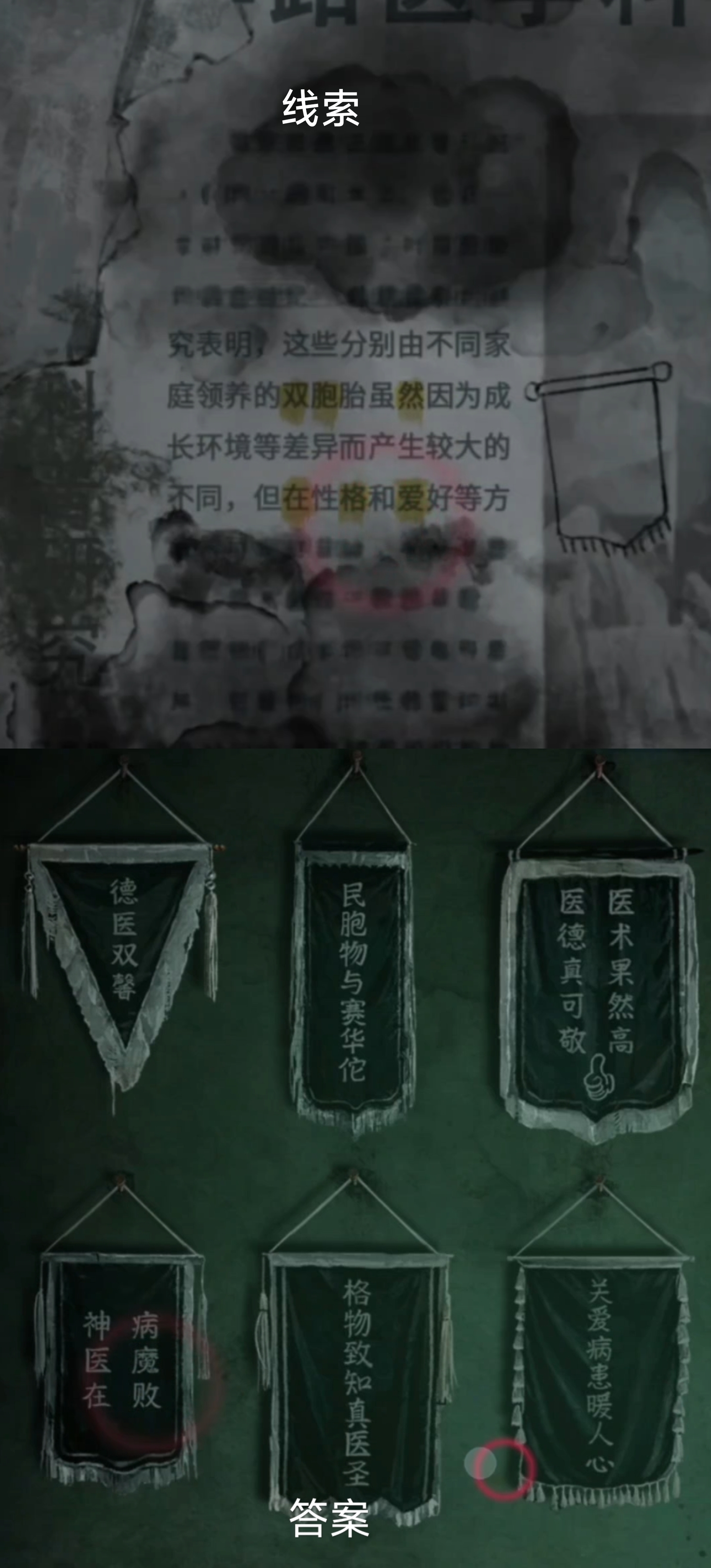 6. 点击台灯下的纸张,得到挂锦旗的【关键字提示】,返回点击墙上的锦旗,并把物品栏的锦旗给挂上,什么字挂什么位置。完成后激活与停尸柜的互动,得到【香和布娃娃】,返回一楼。