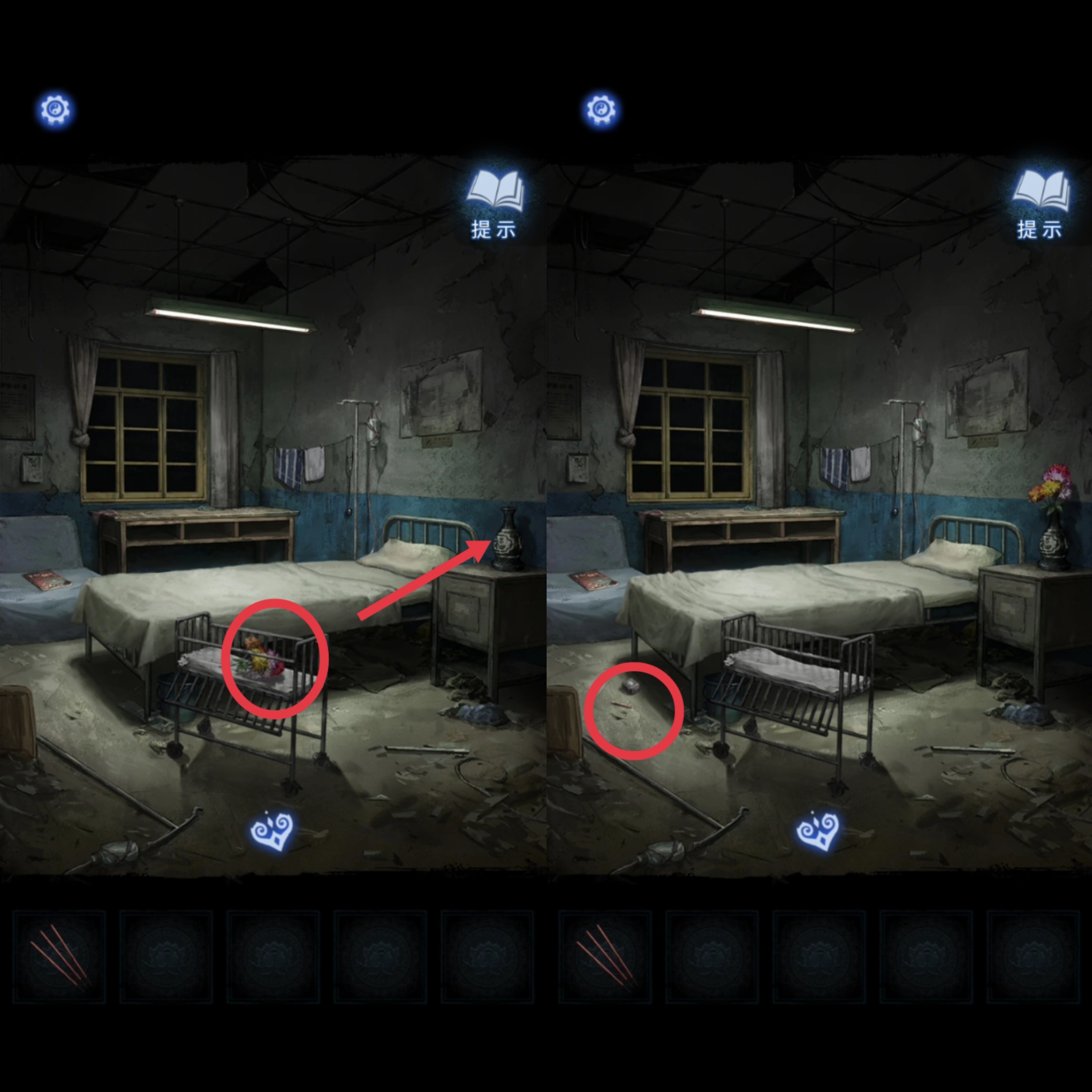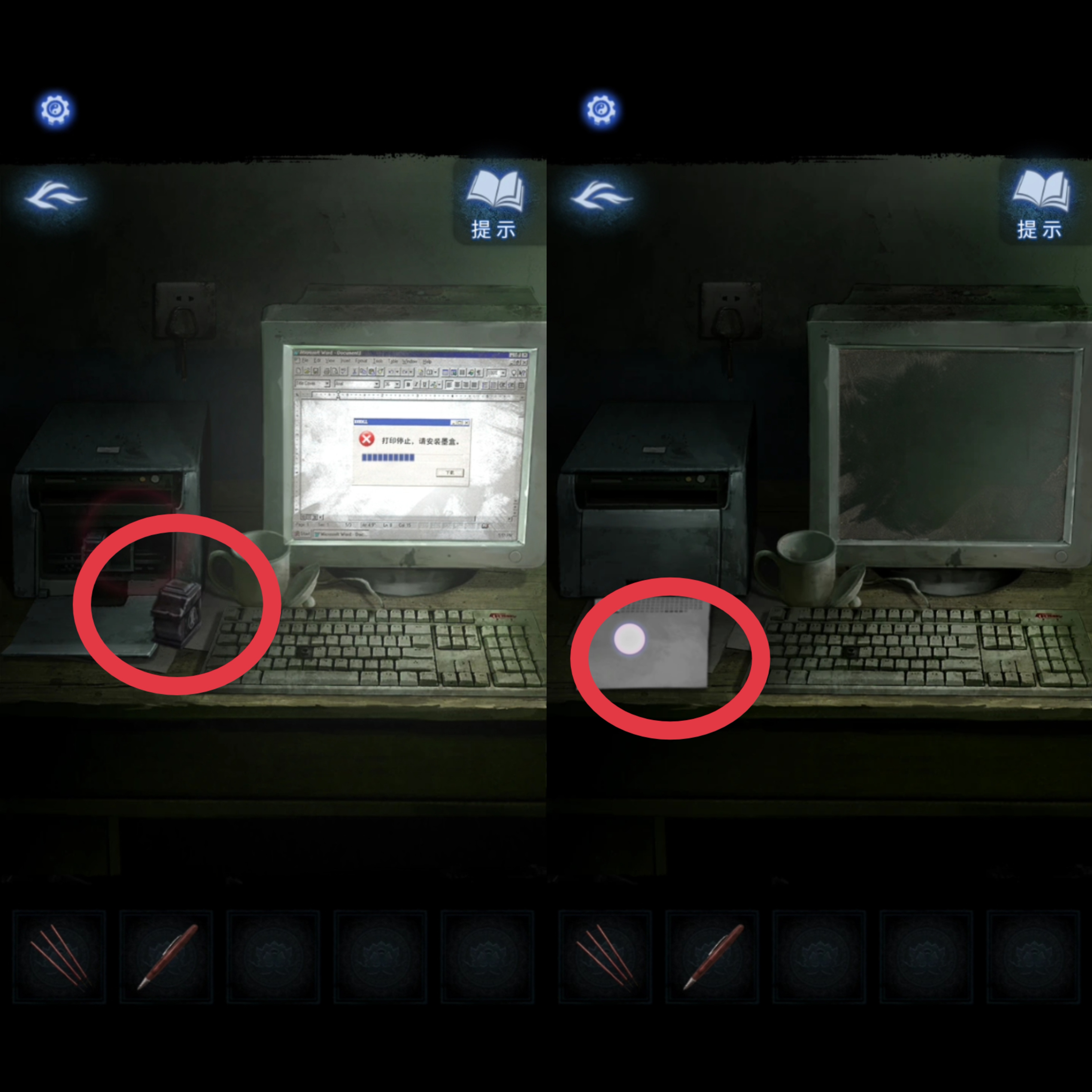 10. 剧情触发后,把小床上的【纸花】捡起,插在病床柜子的空花瓶里,得到【墨盒和圆珠笔】,接着前往办公室。在办公室给电脑安装好【墨盒】,得到【打印报告】。