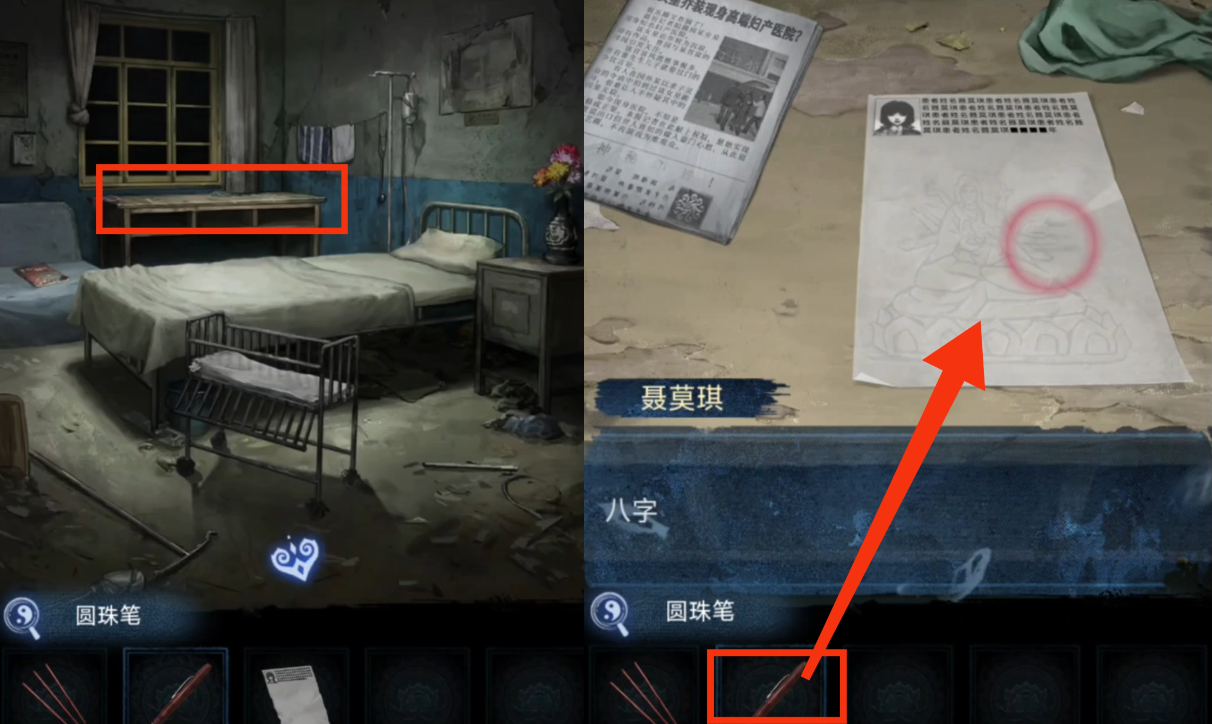 9. 前往二楼,用【196524】开启204病房。进入病房后,先与沙发上的玄秘探索杂志进行互动,然后再跟大桌上的报纸进行互动,记住大桌上的送子娘娘图案,返回。