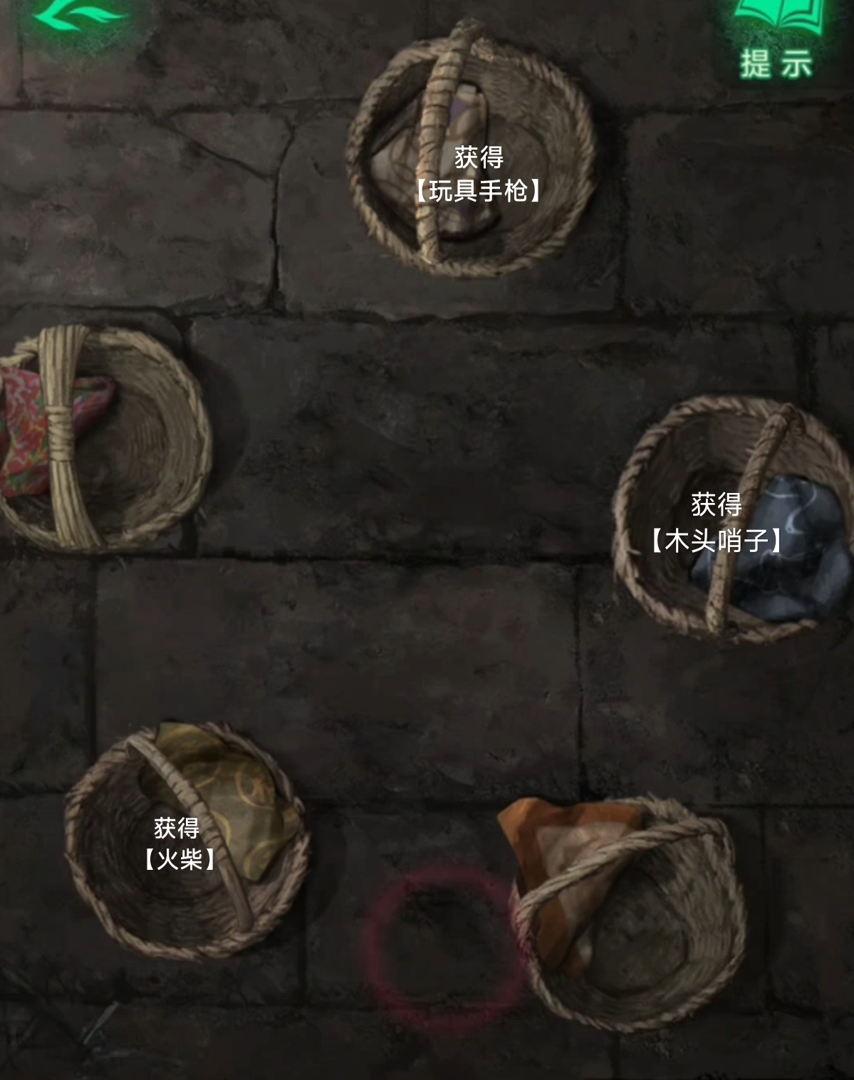 1. 动画结束后,先点击右下角的篮子们,进入小游戏解谜环节。通过地上的标记和篮子里的布的花纹,按照顺序摆好(篮子都挪开一点方便活动)。完成后,从钱篮子里拿到【玩具手枪】,从仙鹤篮子里拿到【木质哨子】,从福字篮子里拿到【火柴】。