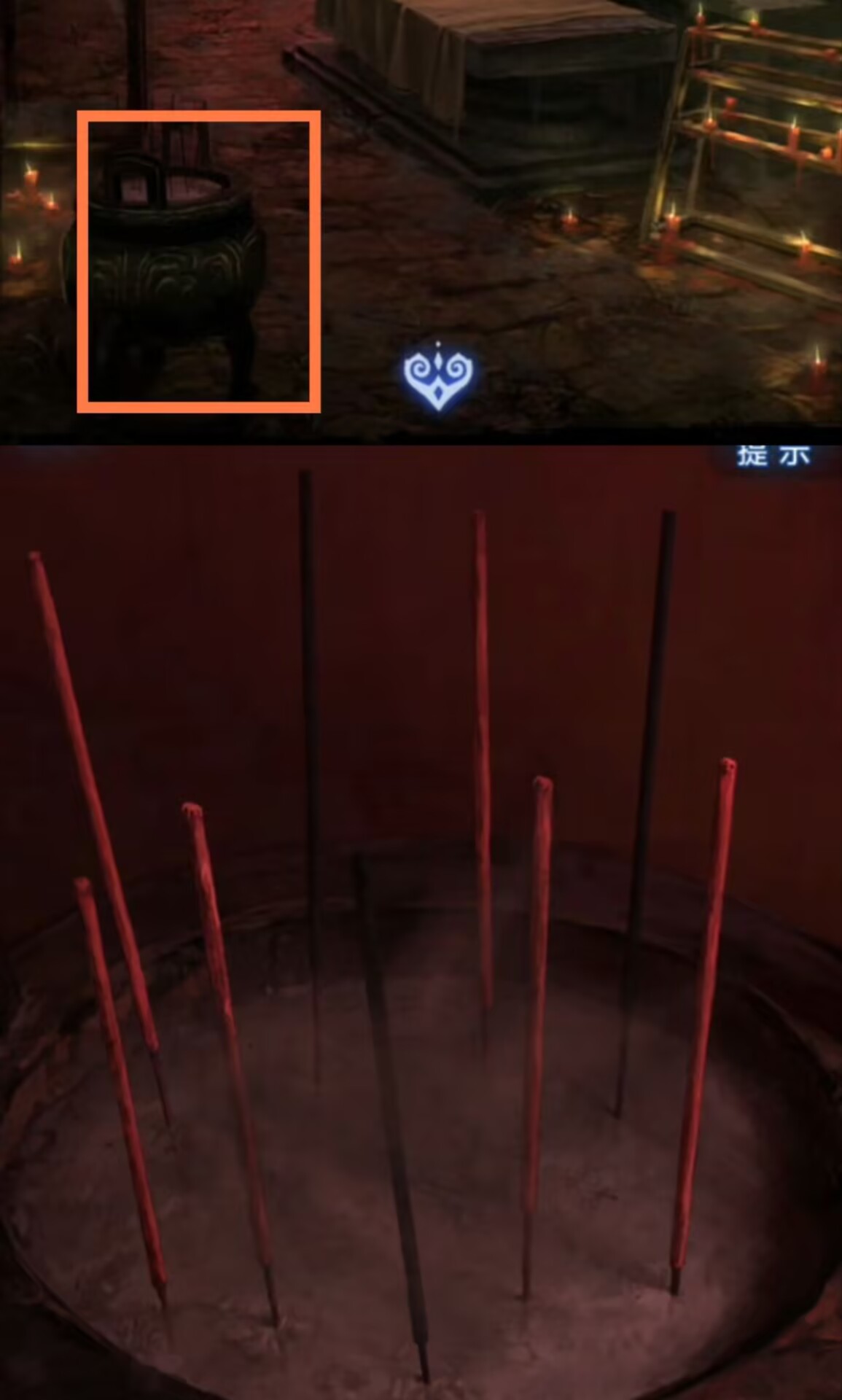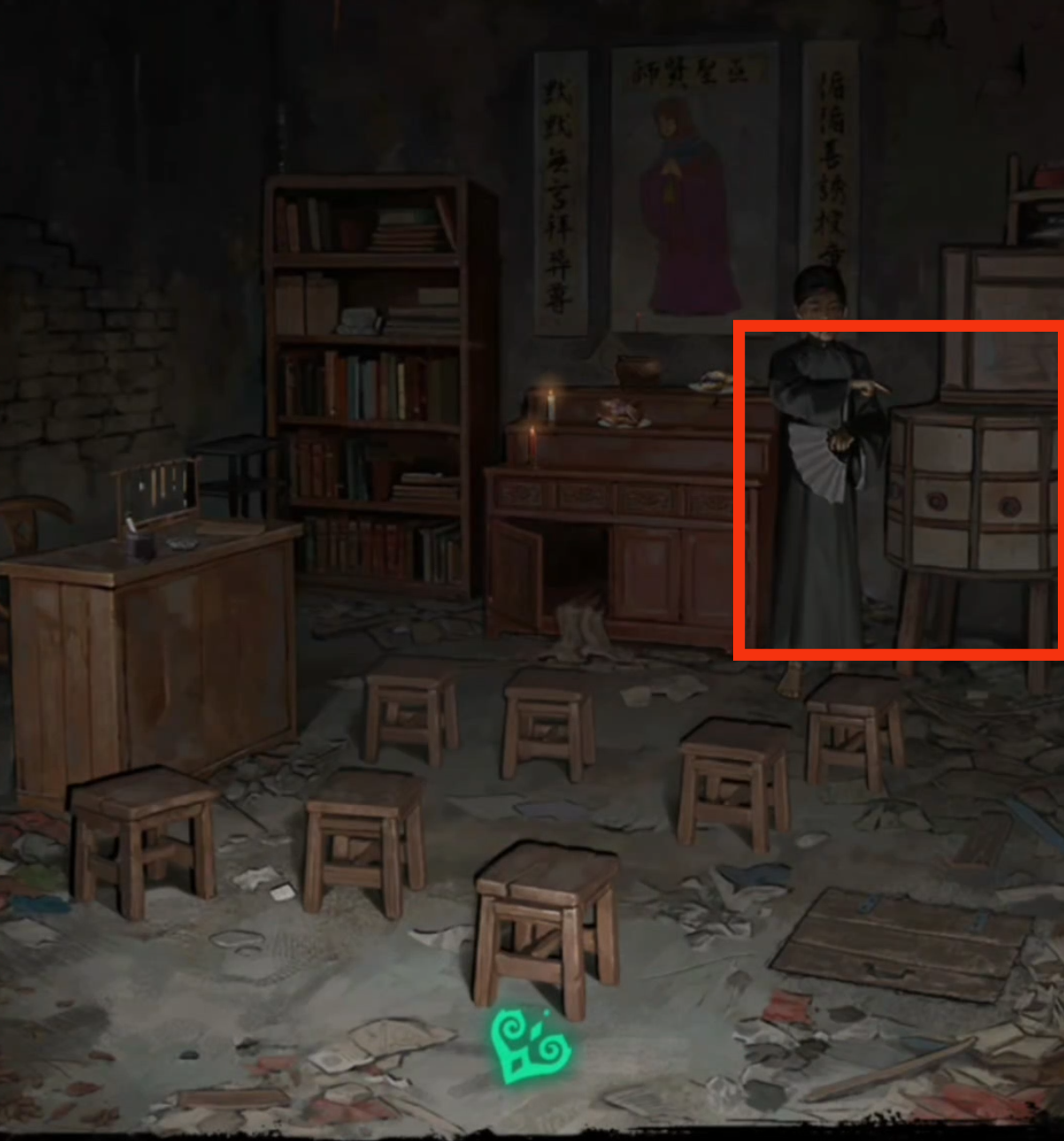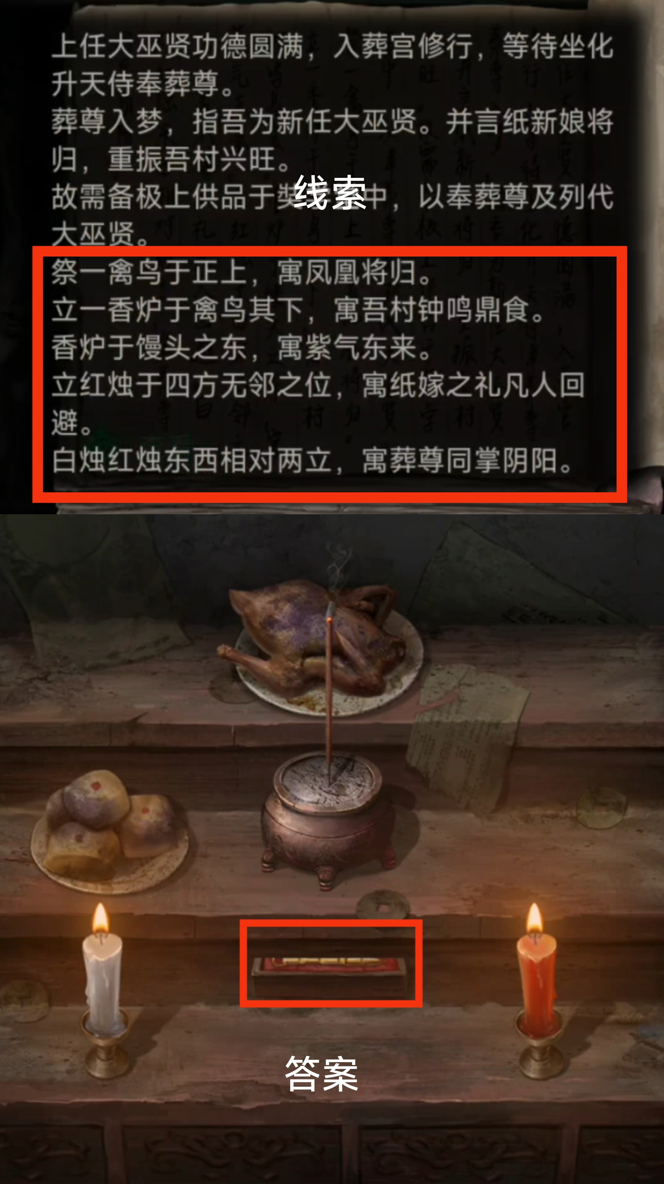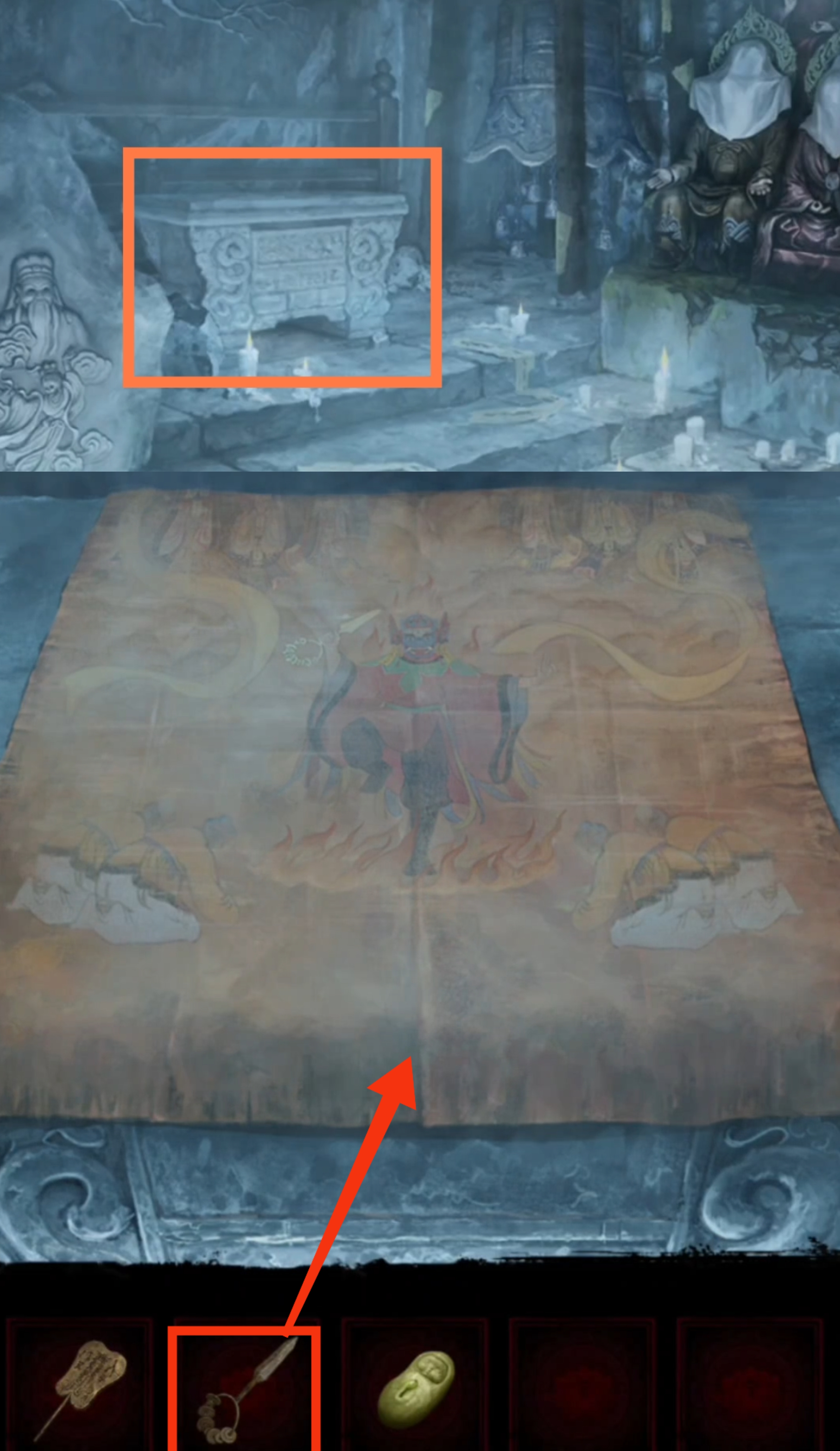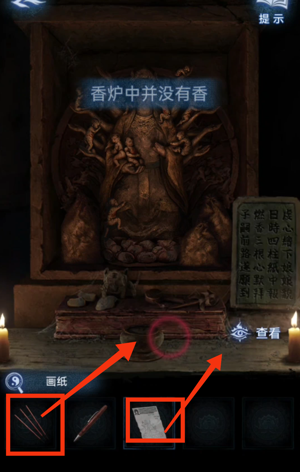 12.检查我们一直没有互动过的神龛,把【画纸】放在神龛下,再插上【香】,至此第一章内容结束。