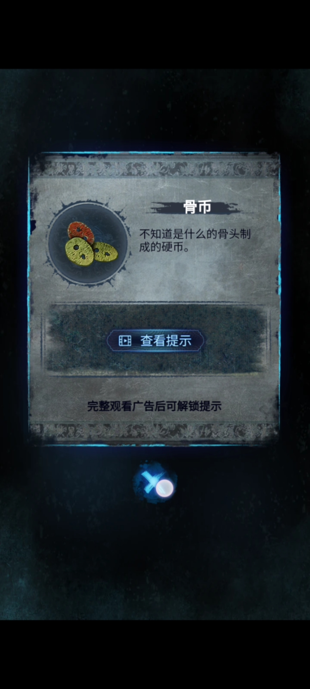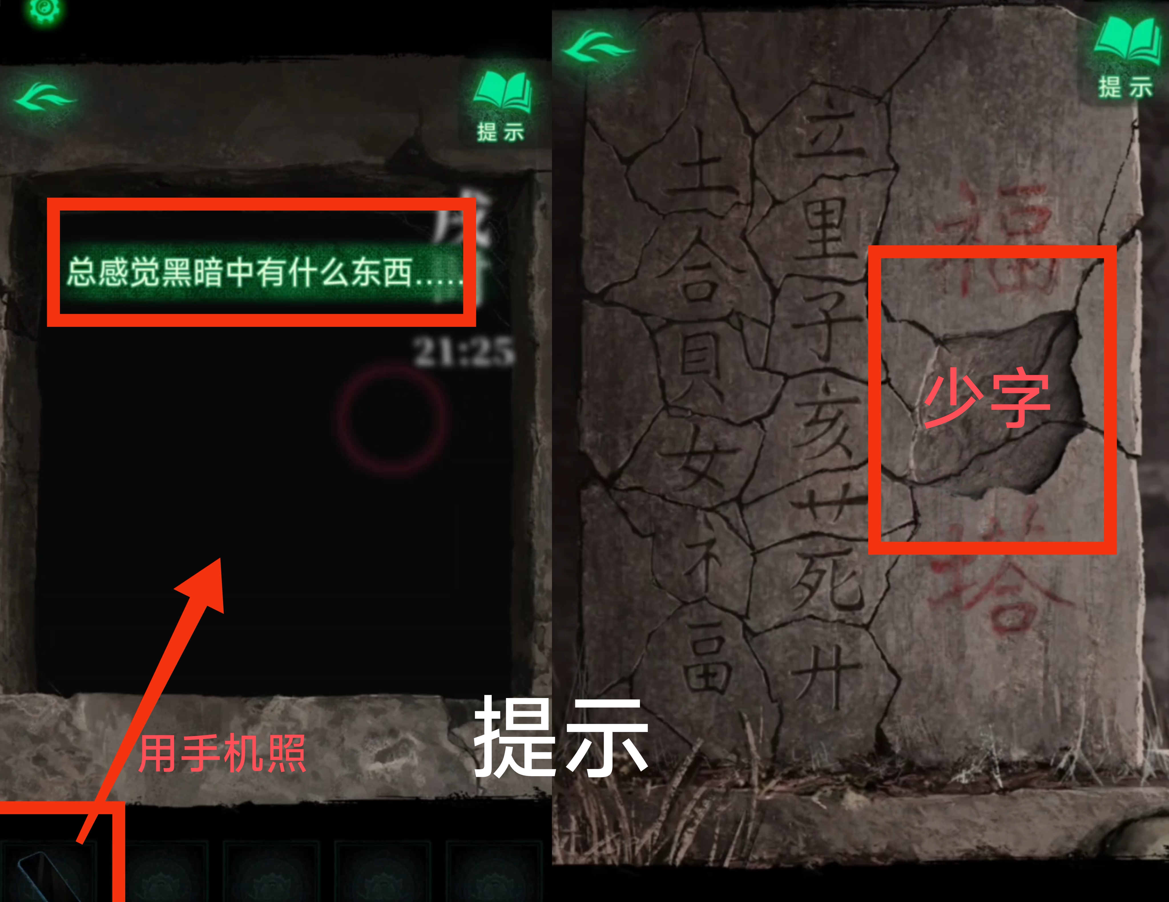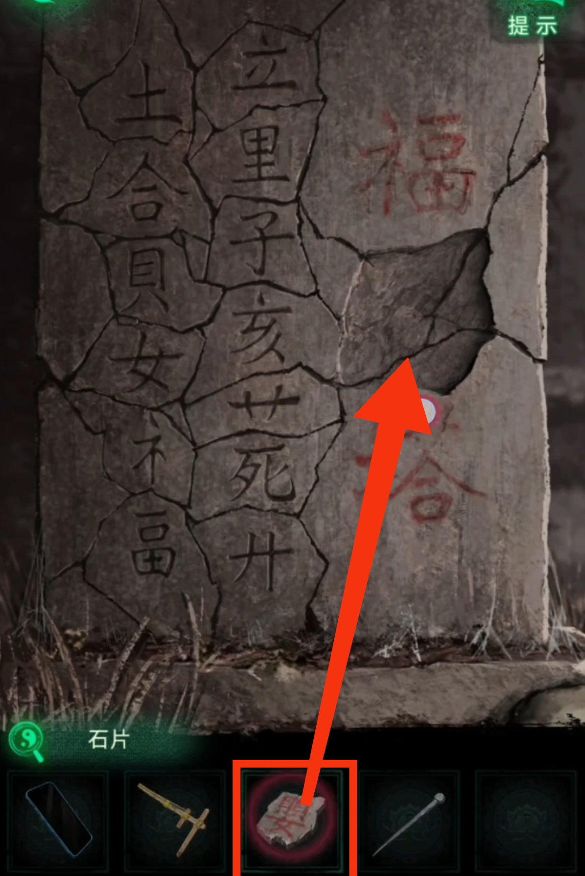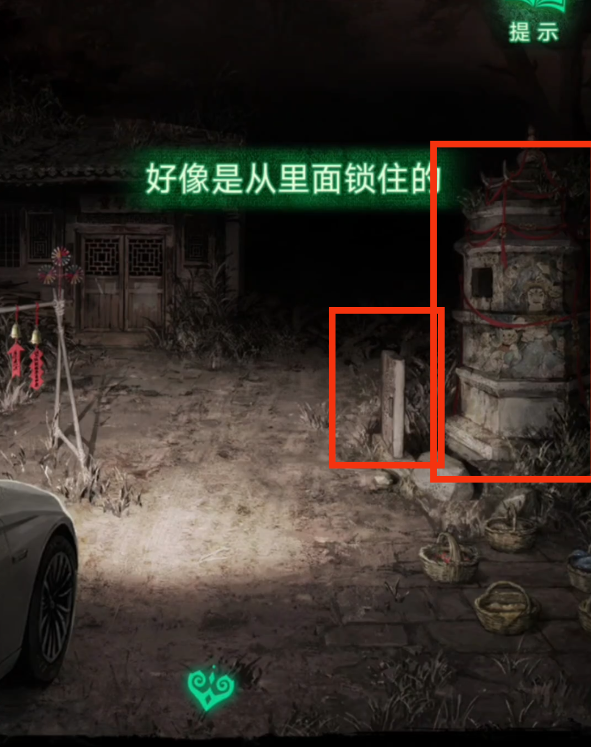 2. 检查篮子旁边的石碑,得到需要寻找一个【石片】的提示,以及用手机检查福婴塔内部,得到一个饿了的小鬼需要给它【投喂】的提示,再前往下一个场景。