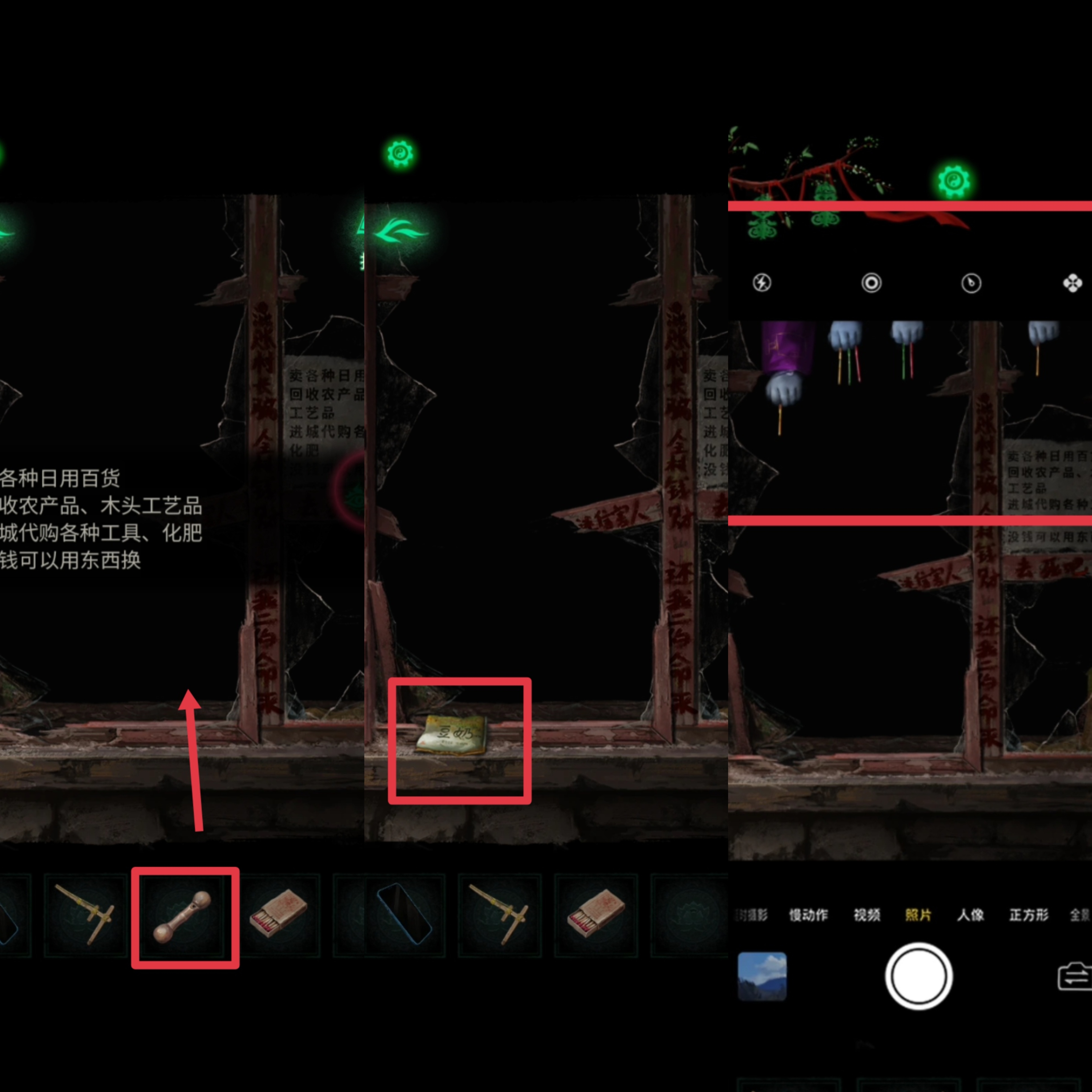 3. 进入新场景后,先检查最右侧打不开的木门,得到需要寻找一个【门神】的提示,返回点击被砸毁的小卖部,检查窗户上的告示,用【木质哨子】换取一包【豆奶】。然后用手机拍照,看到几个小鬼伸手抓彩木棍的【数量1321】的提示。