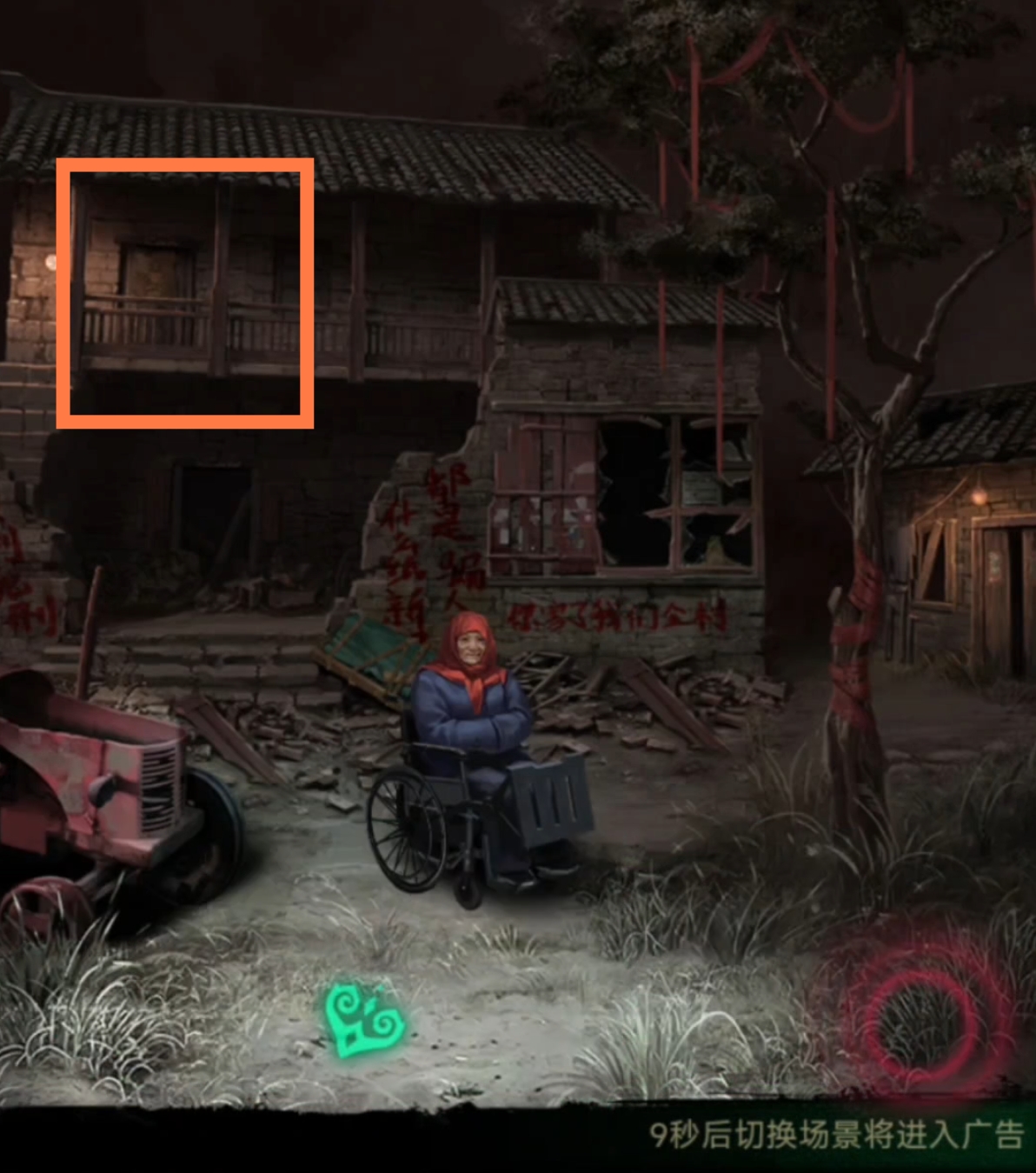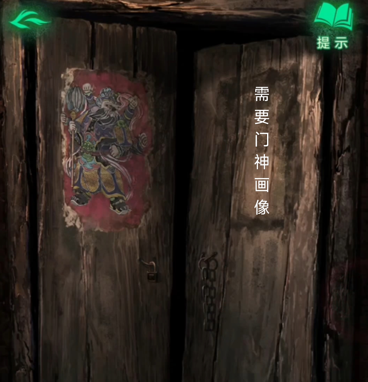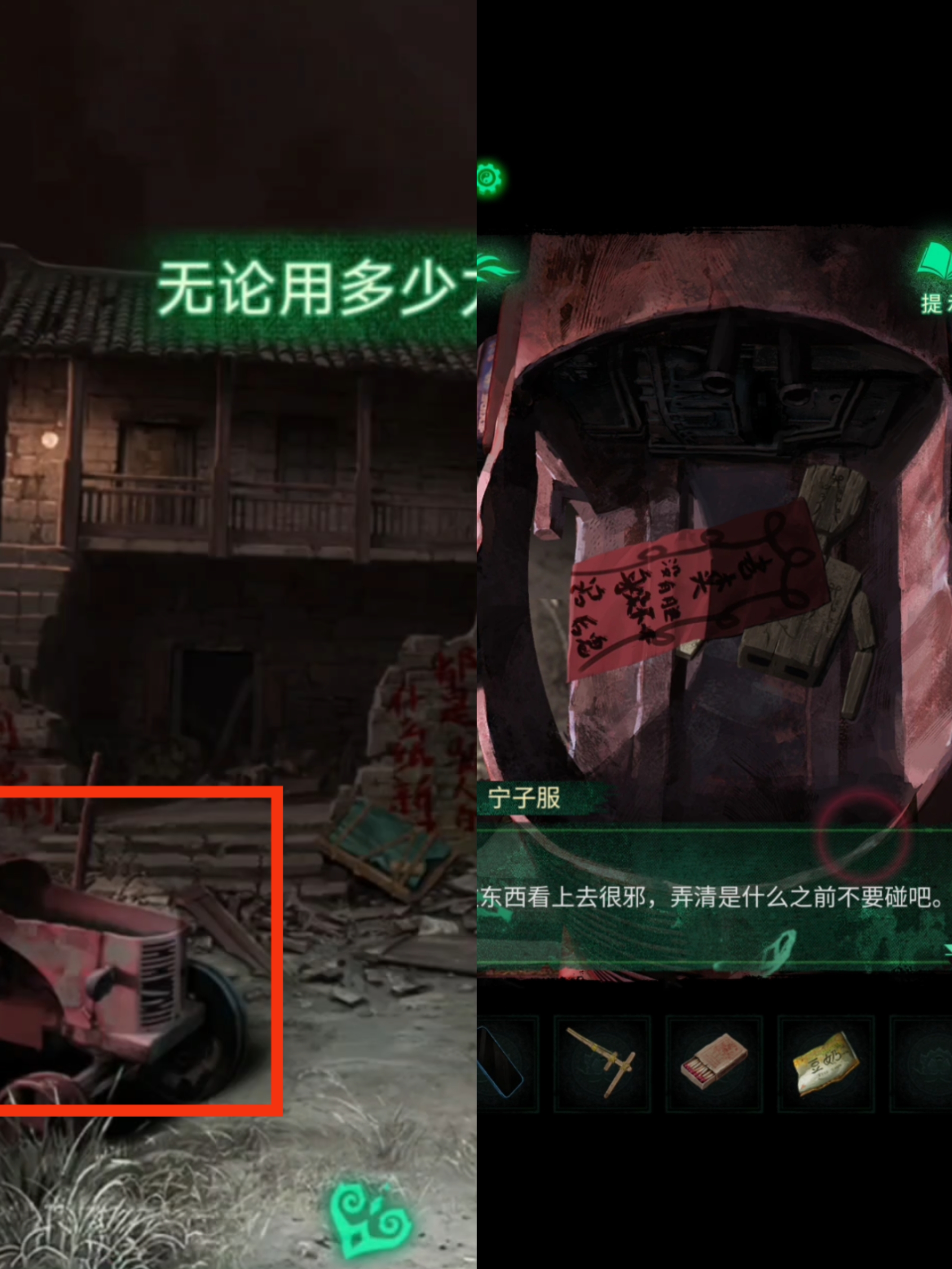 4. 返回到新场景,点击左侧的拖拉机进行互动,再回到一开始的地方,把【豆奶】投喂给小鬼,得到一张【门神】。然后我们就可以去贴【门神】,进入瓦房屋。