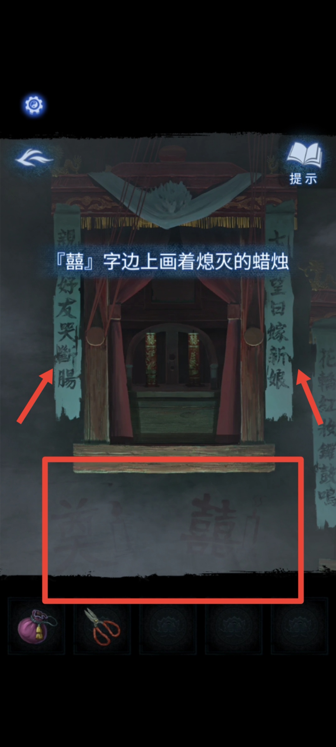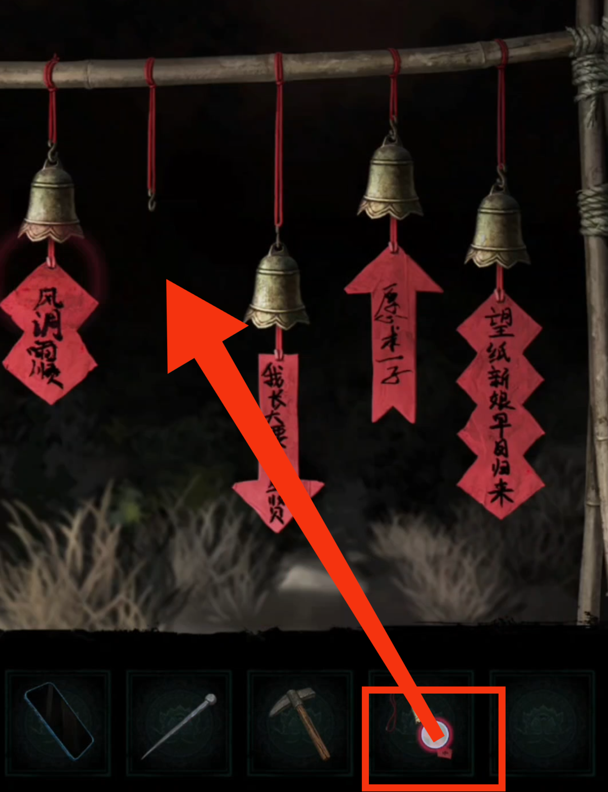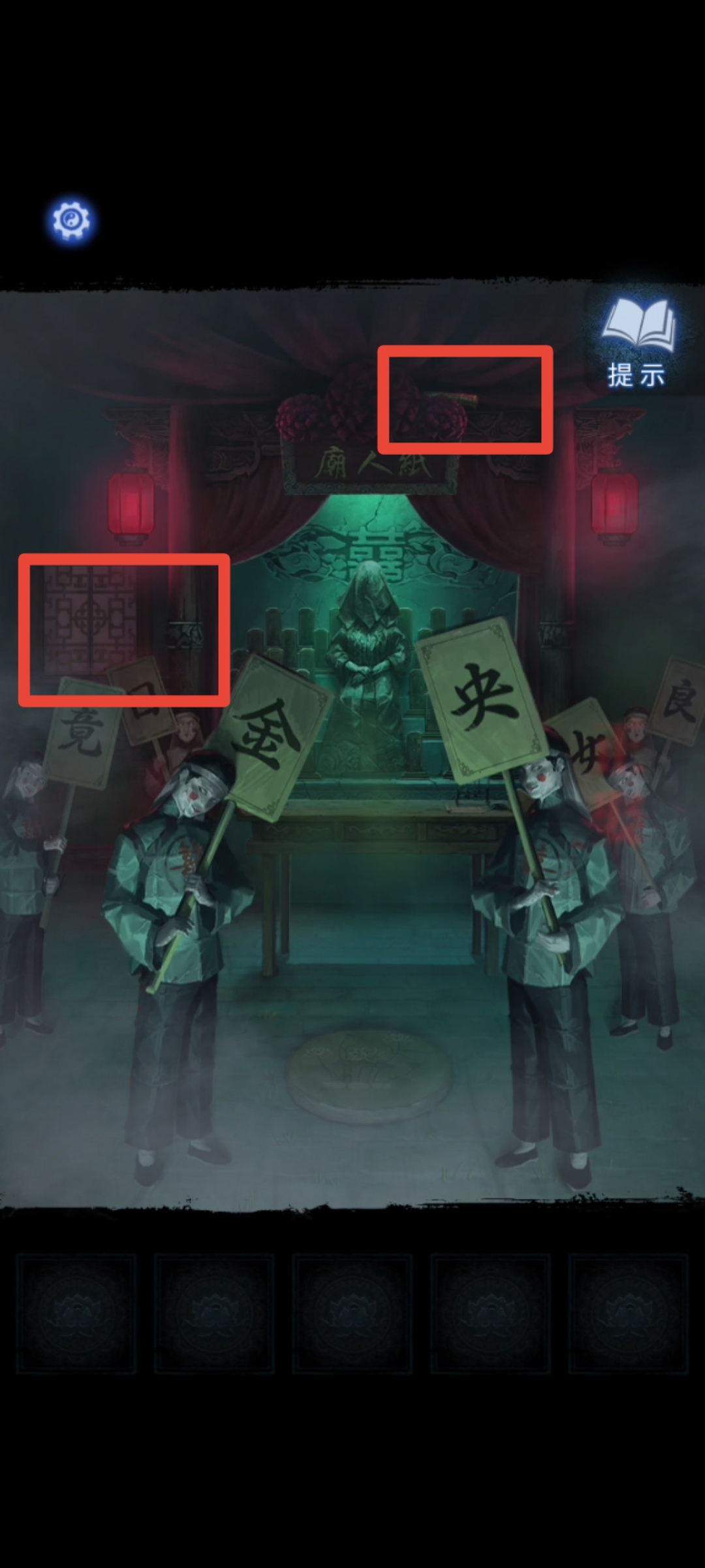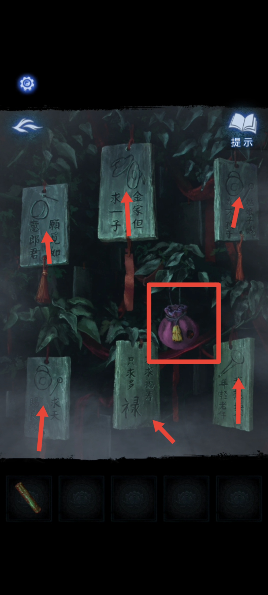 1. 在纸人庙中,先点击纸人庙牌匾右侧上方,得到【龙凤花烛】。返回后点击左侧窗户,对话结束后来到祈福树前,拿走【朱砂香囊】并记下每一个牌子上的乐器符号和字符。