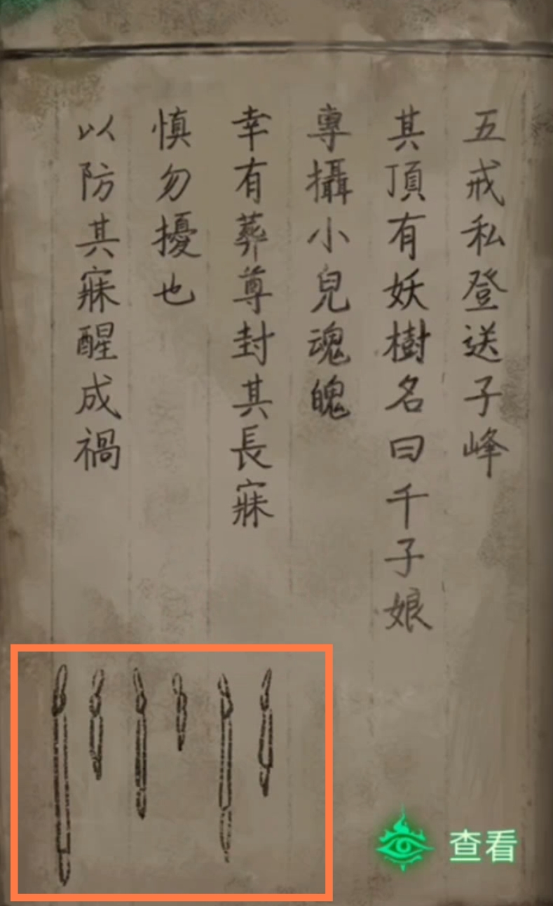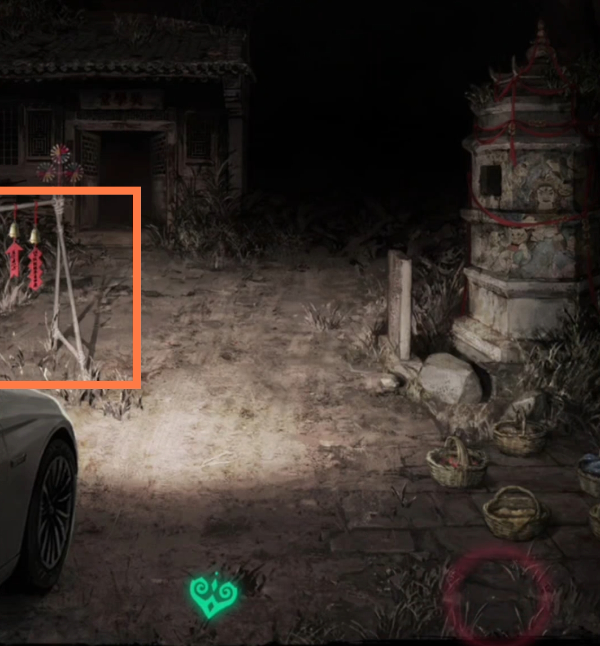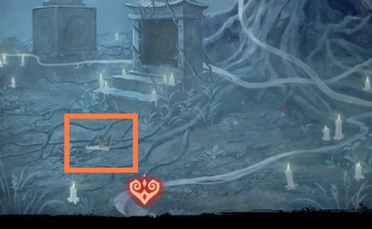 1. 在纸人庙中,先点击纸人庙牌匾右侧上方,得到【龙凤花烛】。返回后点击左侧窗户,对话结束后来到祈福树前,拿走【朱砂香囊】并记下每一个牌子上的乐器符号和字符。