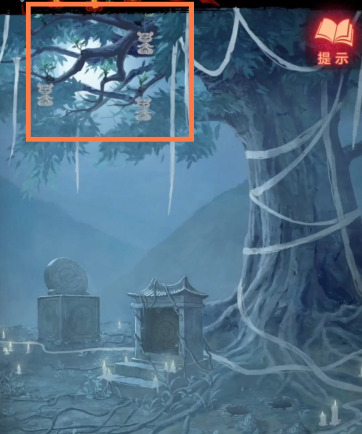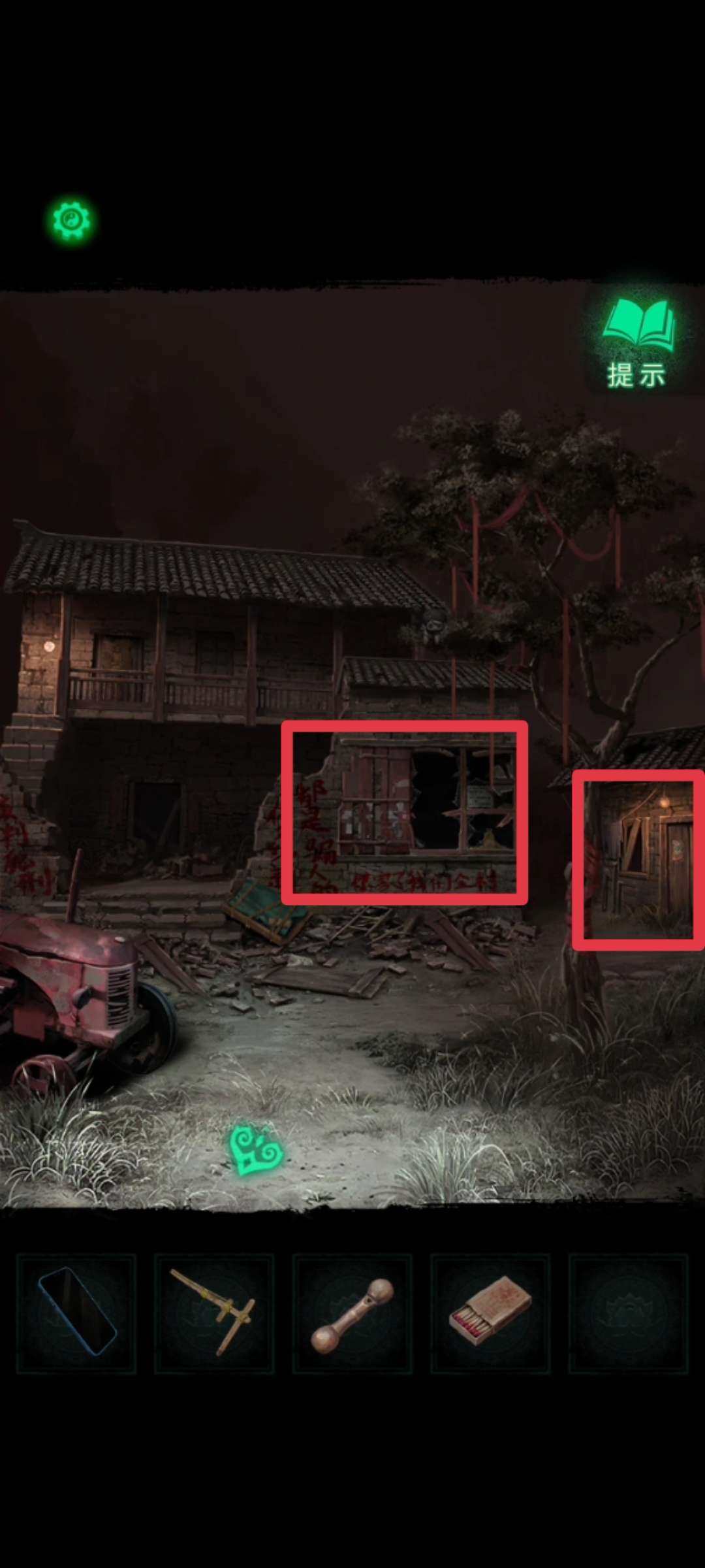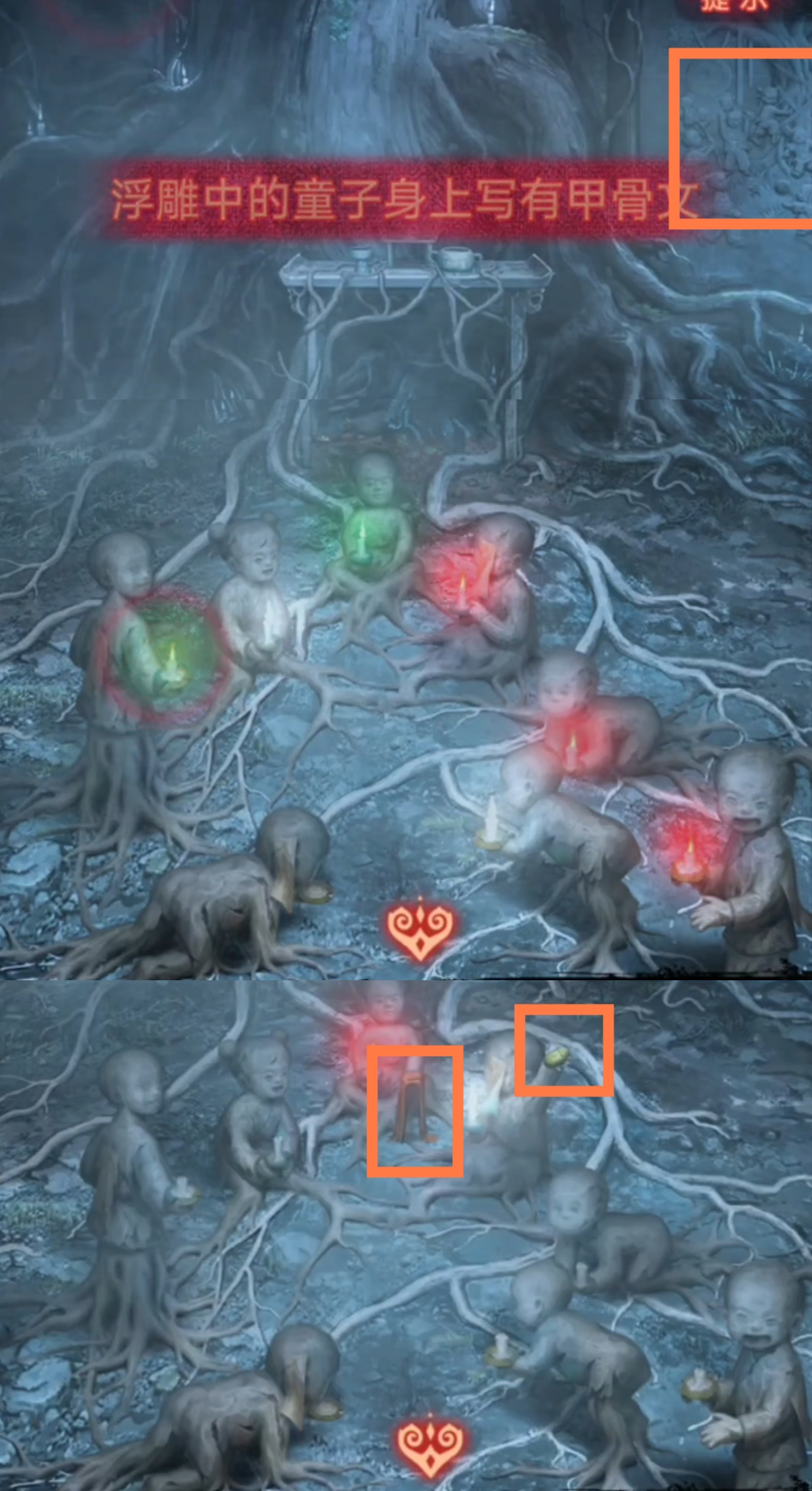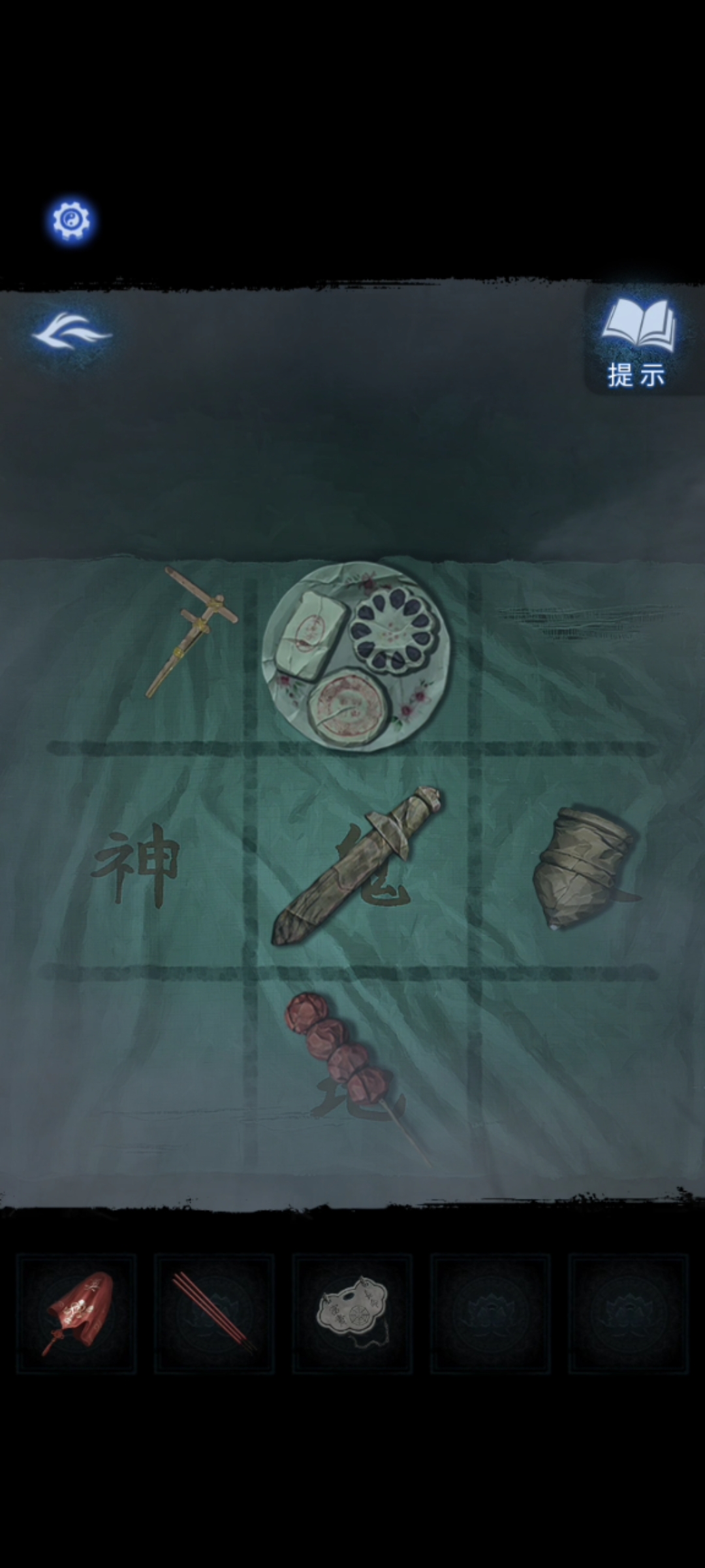 1. 在纸人庙中,先点击纸人庙牌匾右侧上方,得到【龙凤花烛】。返回后点击左侧窗户,对话结束后来到祈福树前,拿走【朱砂香囊】并记下每一个牌子上的乐器符号和字符。