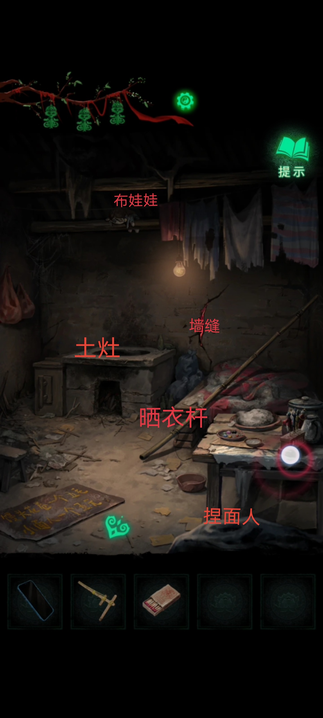 5. 在瓦房屋内,先点击最近的木桌,让宁子服捏个面人后拾取床铺上的【晾衣杆】。查看墙缝,得到一个尚未能拿到的红绳信息,返回查看房顶上的【布娃娃】,再到土灶那里进行检查。