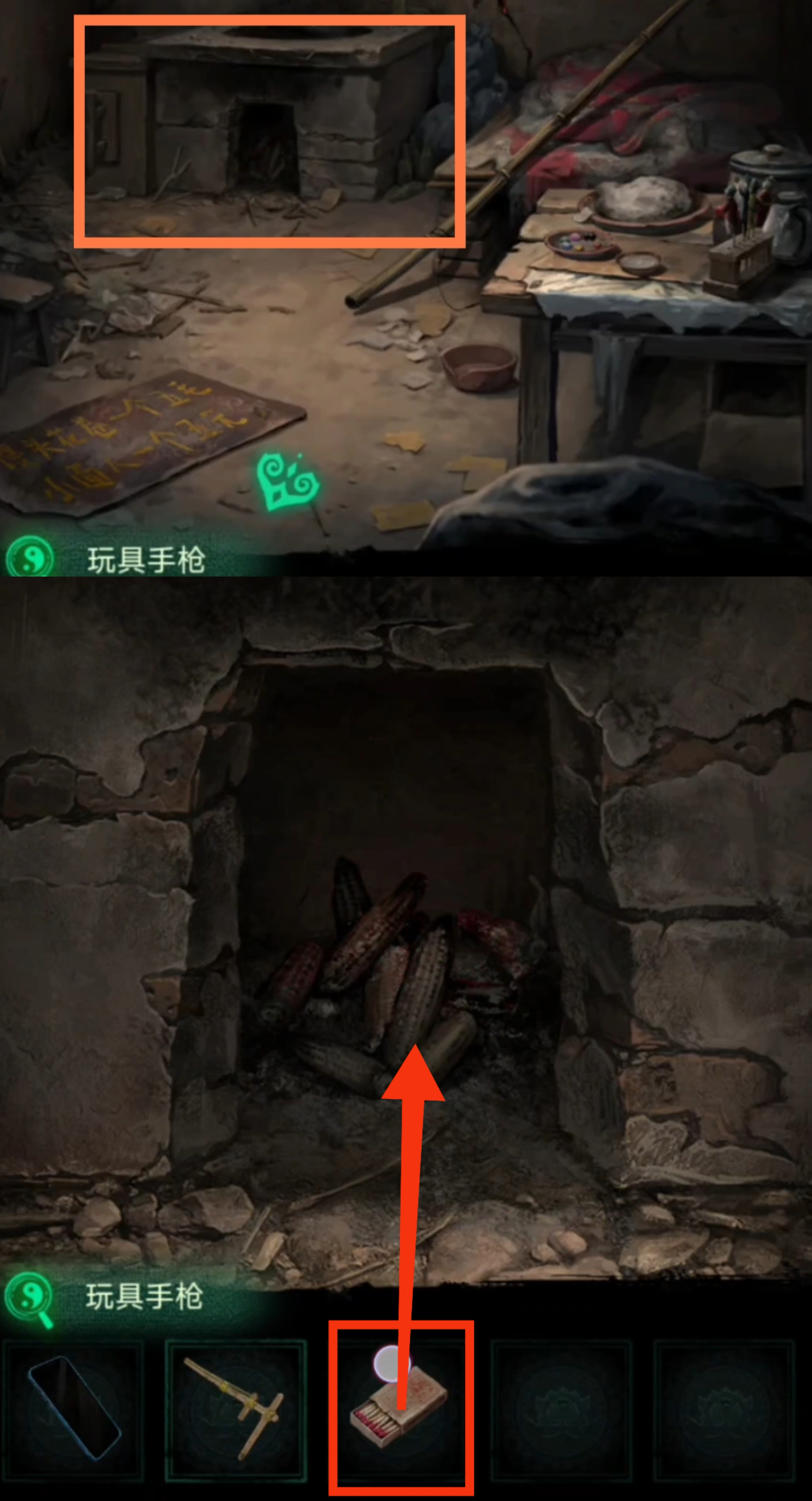 6. 用【火柴】先点燃灶里的柴火,然后与旁边的风箱互动,通过步骤3在村长小卖部的拍照互动的提示,拉动风箱的拉杆,把火彻底点燃后返回到瓦房屋内场景。