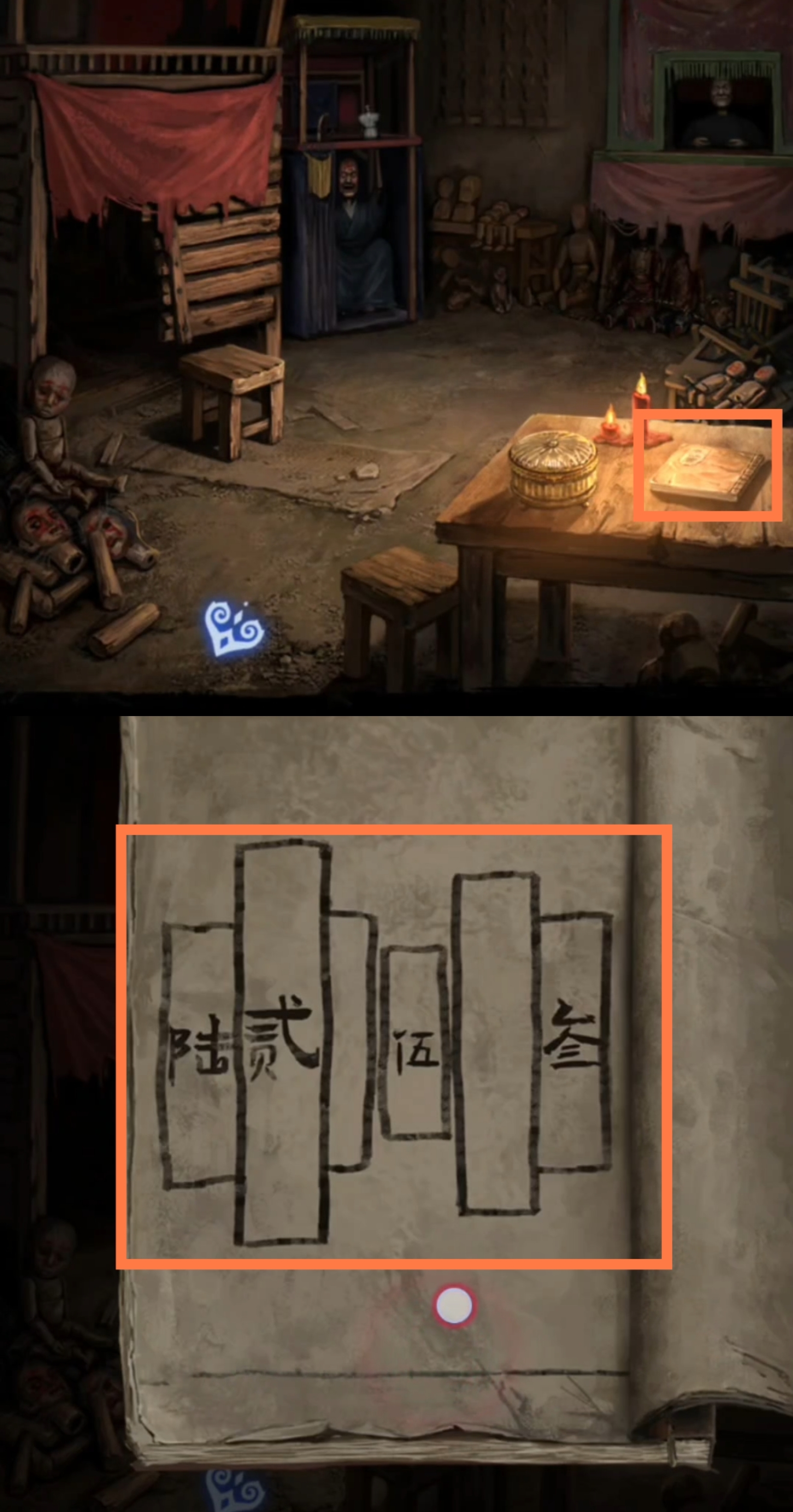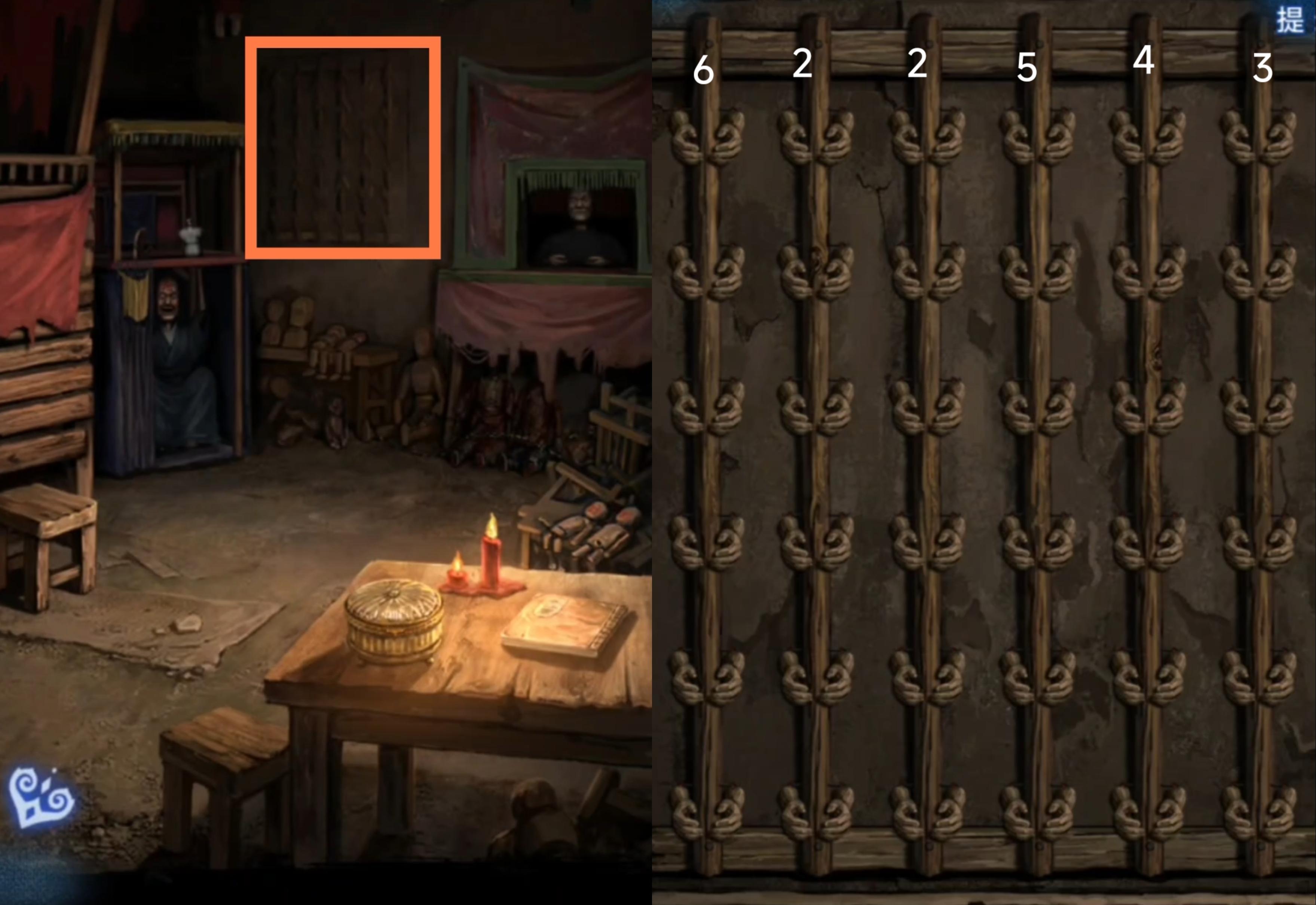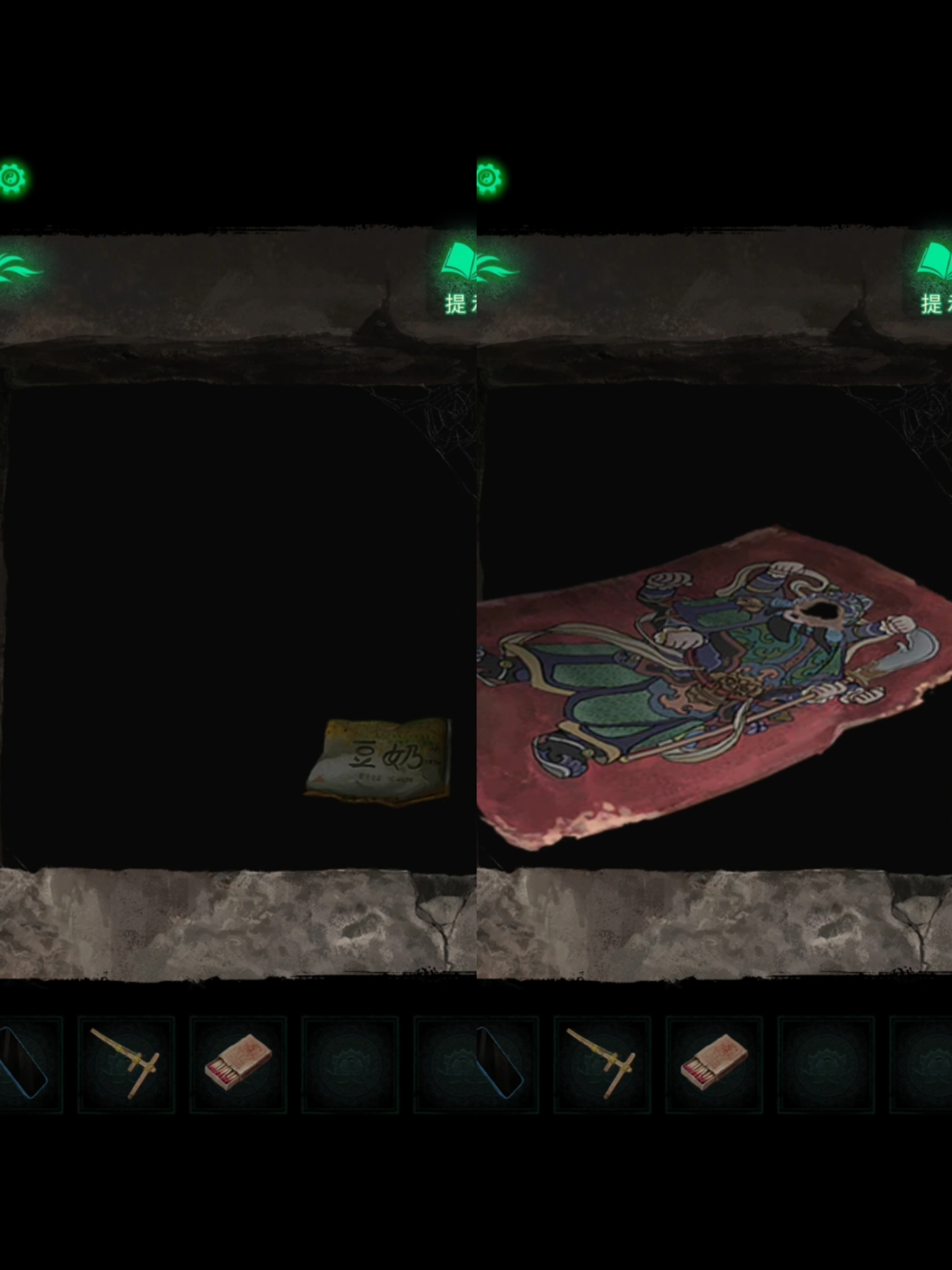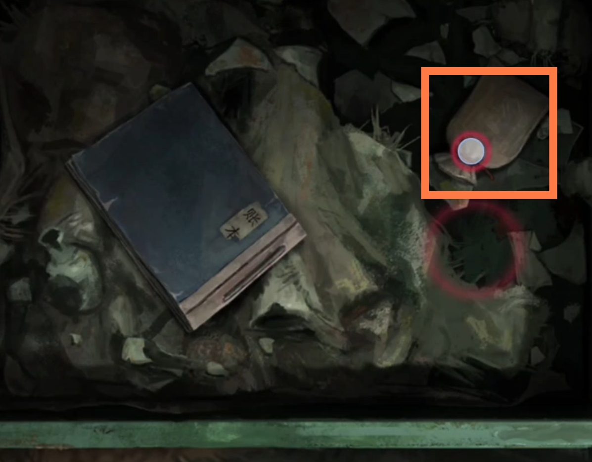 9. 进入弃煞牢场景,调查右前侧桌子上的书,翻页后获得残缺数字线索【62空5空3】。结合上一步骤中在小树林中找到的数字线索,组合得到完整数字线索【622543】。点击后侧墙壁,根据刚刚得到的完整数字线索,依次调整,拾取【浆糊和符纸】,【小桃木剑】