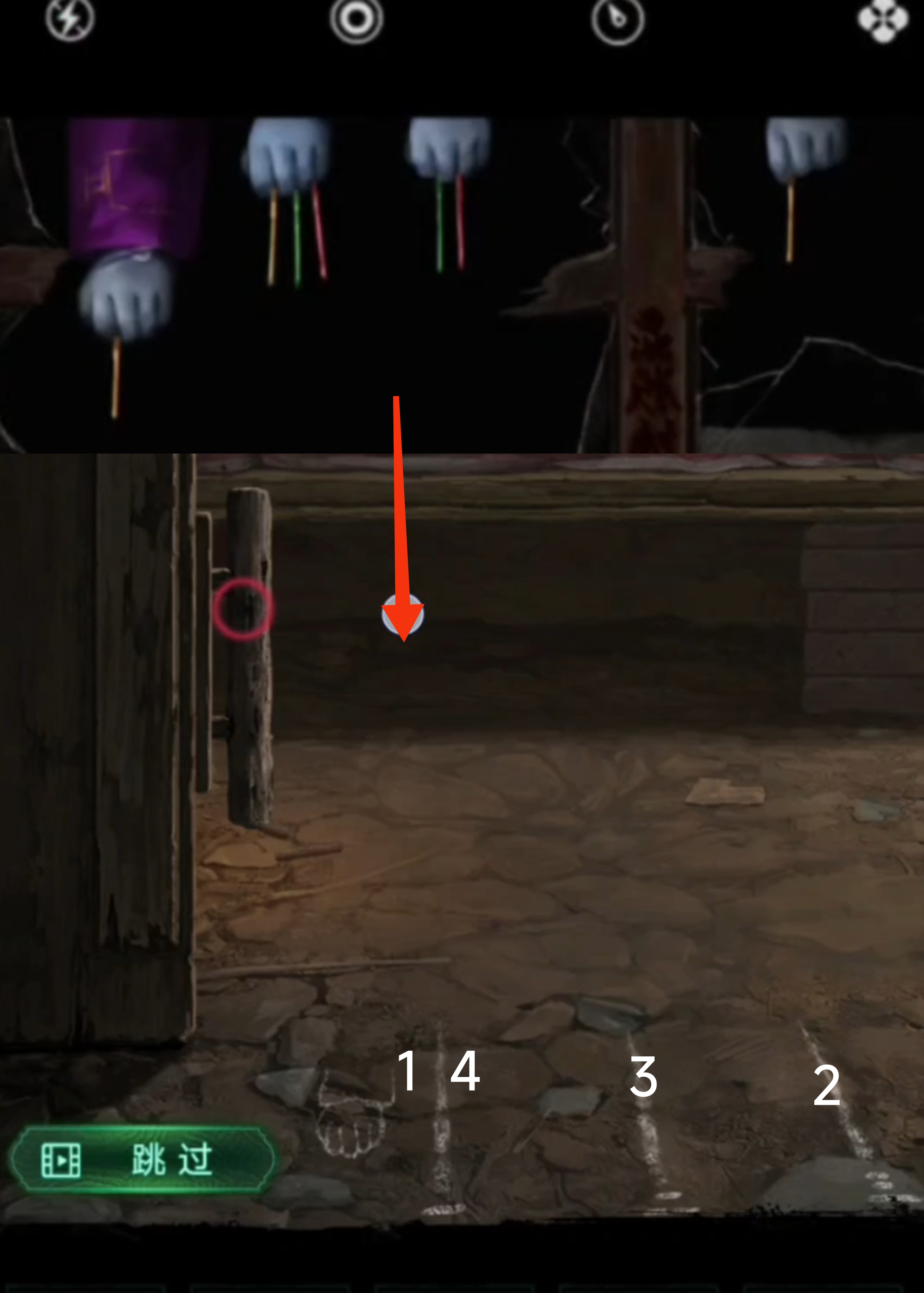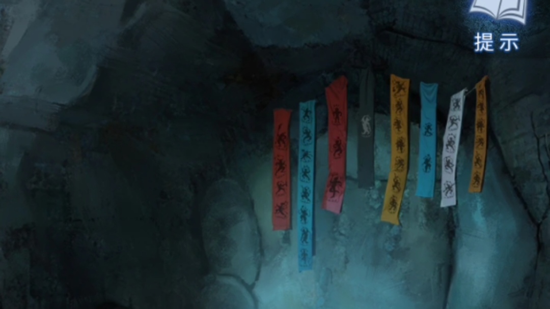 4. 返回车辆场景,点击进入山洞,注意观察布条颜色和布条上跳舞小人数量,从小到大排序,获得颜色顺序线索【黑蓝红红白黄黄蓝】。