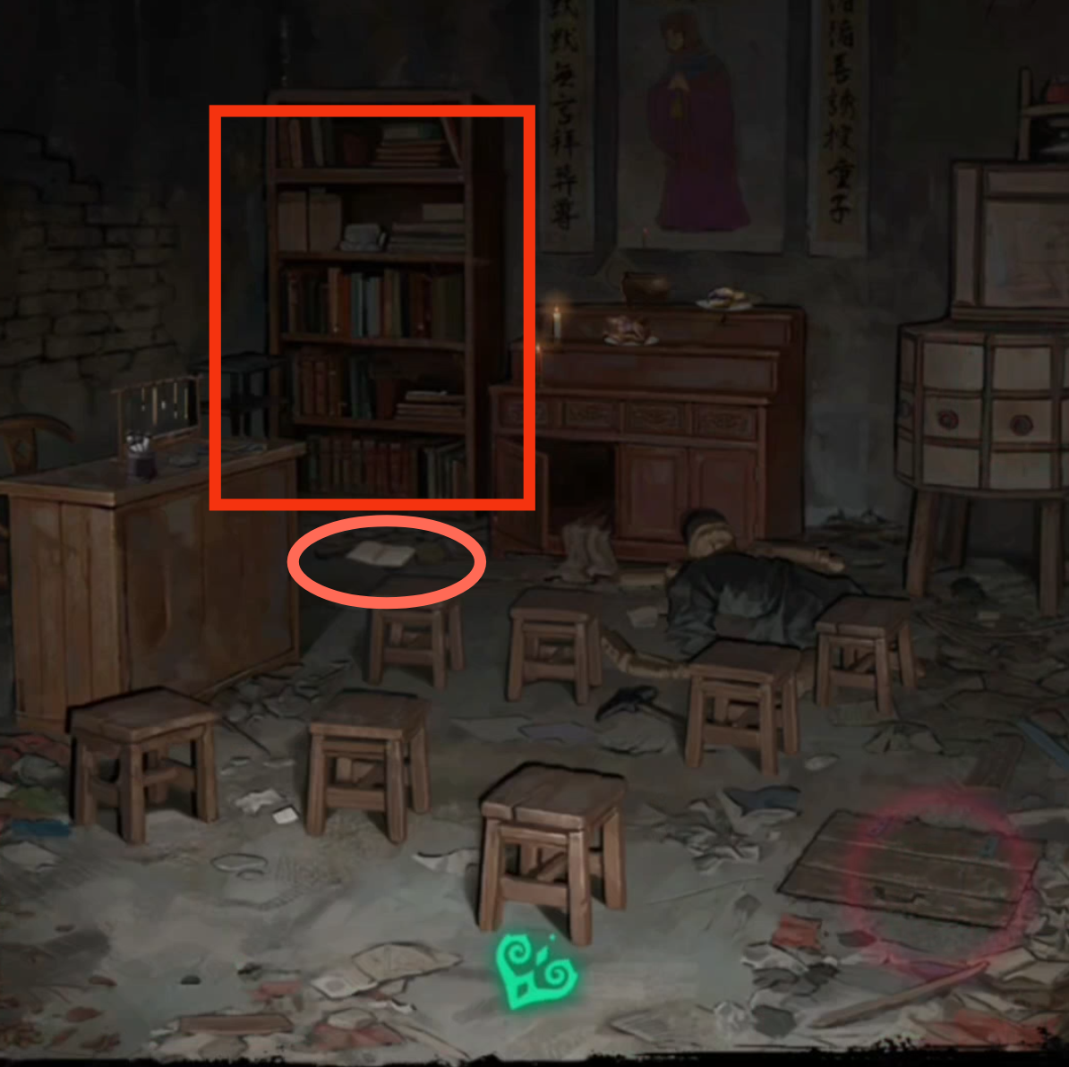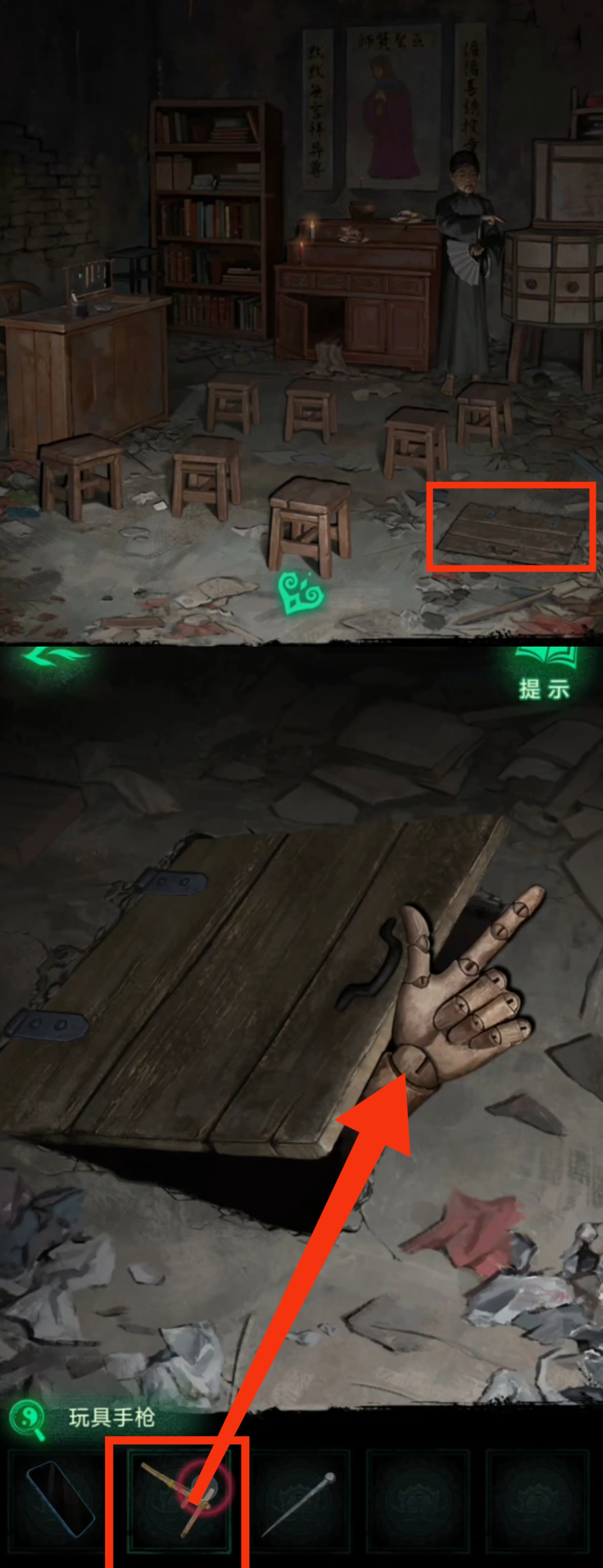 9. 进入学堂,先与右下角的地下室门互动,根据木头人手比枪的姿势,把物品栏的【玩具手枪】给它,会得到一把【直尺】。紧接着回到瓦房屋内,用【直尺】在墙缝中把【红绳】勾出来,再回到学堂。