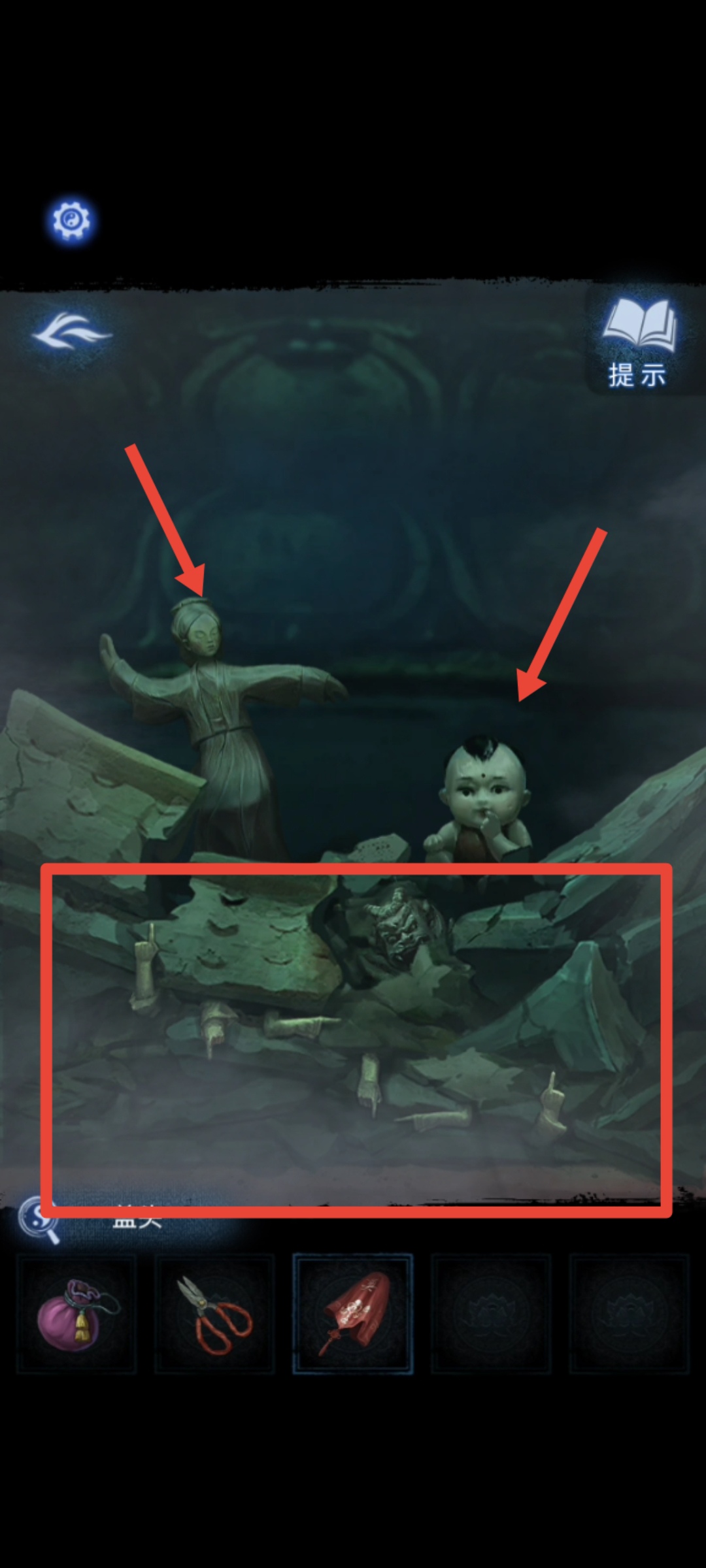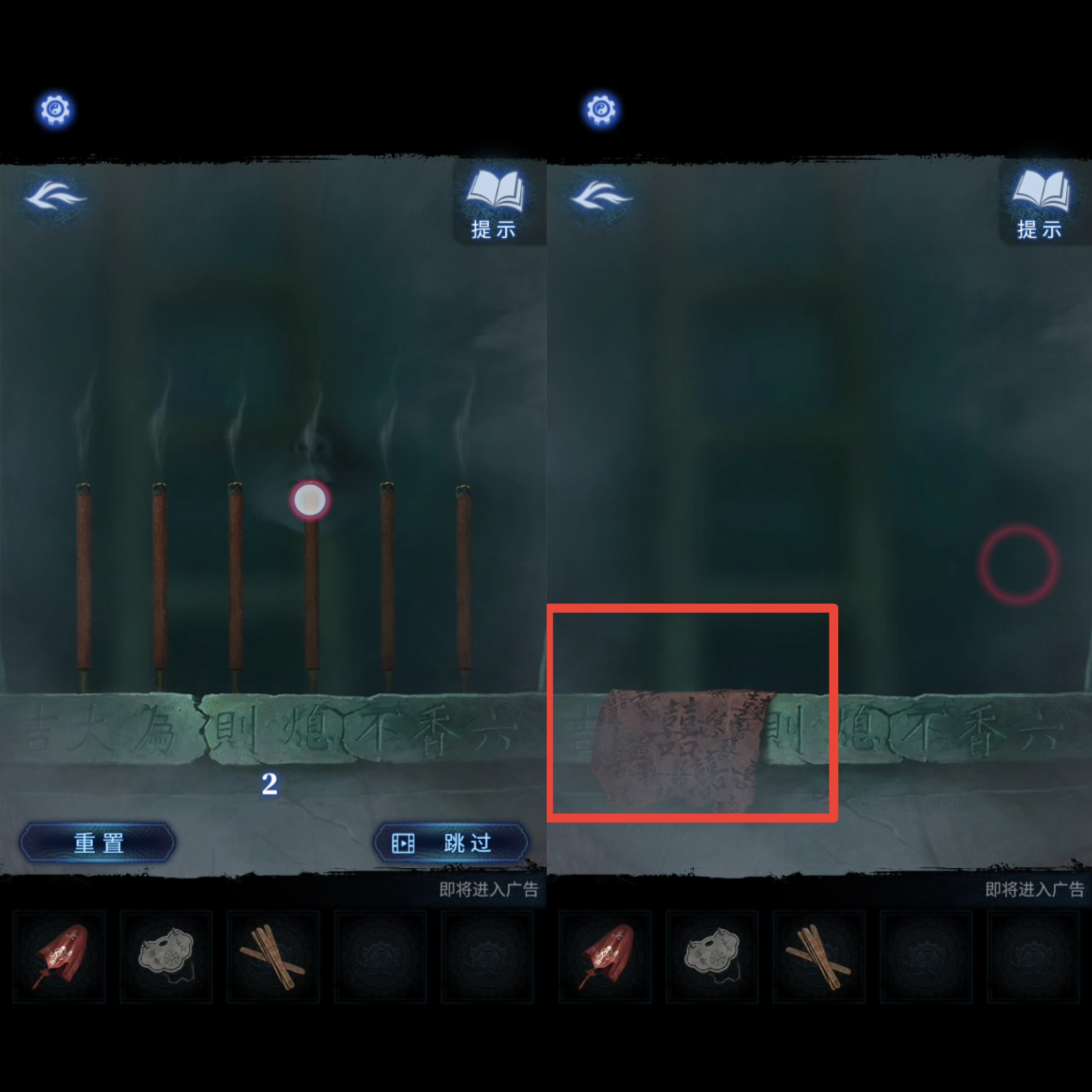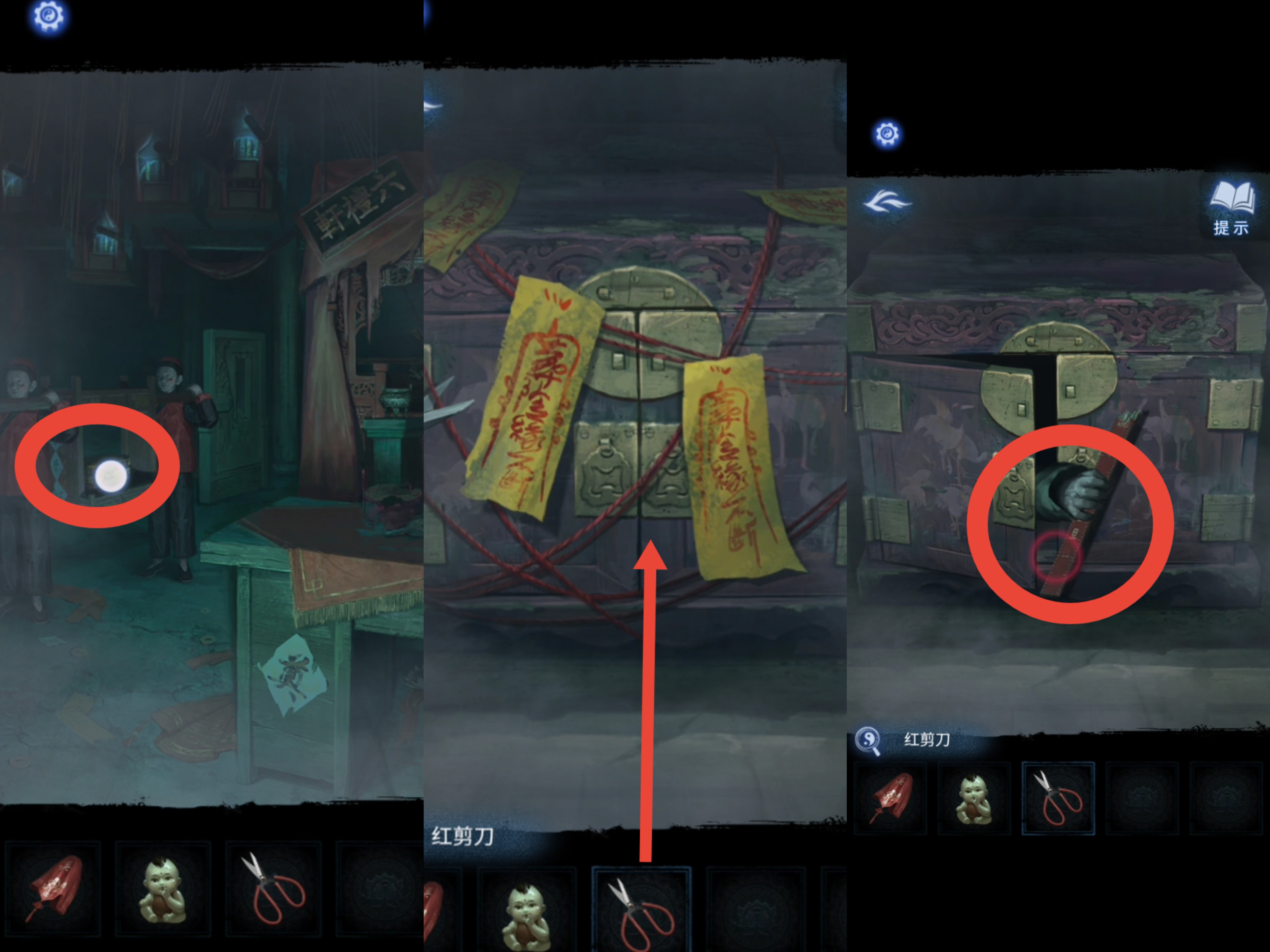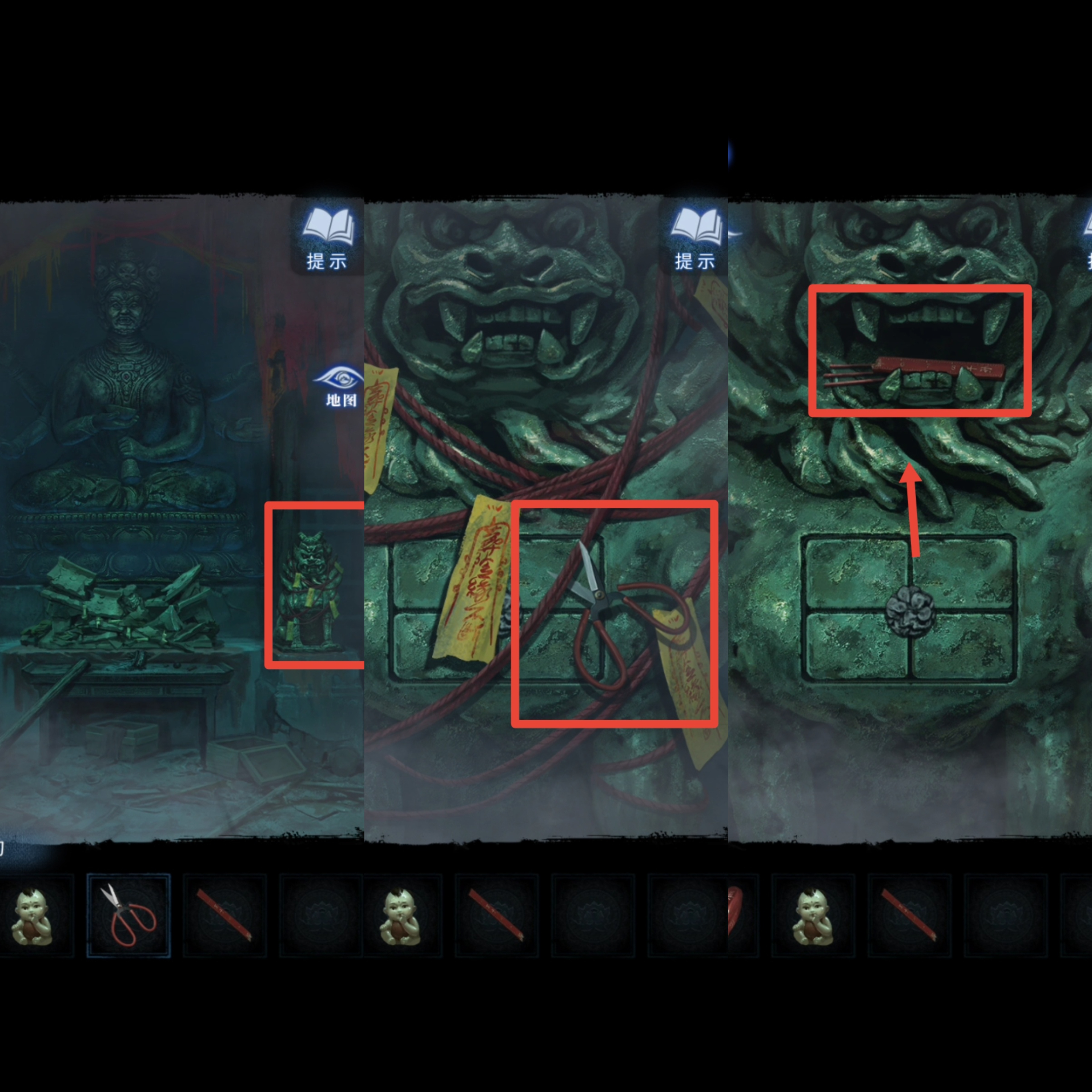 8. 点击送礼的纸人,用【红剪刀】剪掉箱子上的红绳咒法,得到【半截尺子】。返回地图进入奉奘祠,用【红剪刀】与右侧符咒石狮子互动,然后根据步骤5的手指方向提示移动石板上的按钮,得到【三根香和另一把半截尺子】,尺子会自己合起来,成为【子孙尺】。