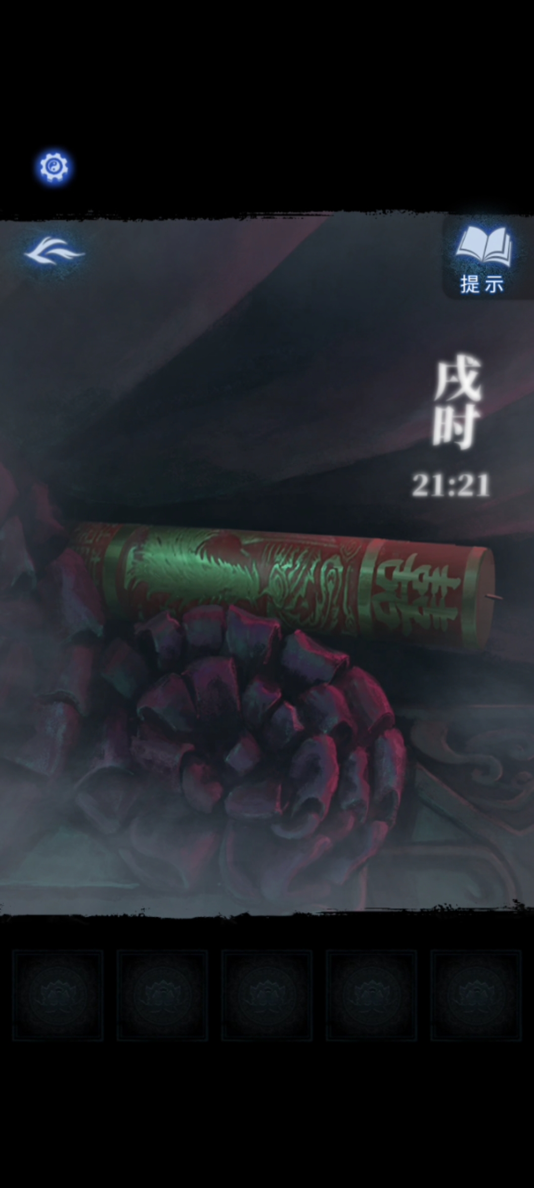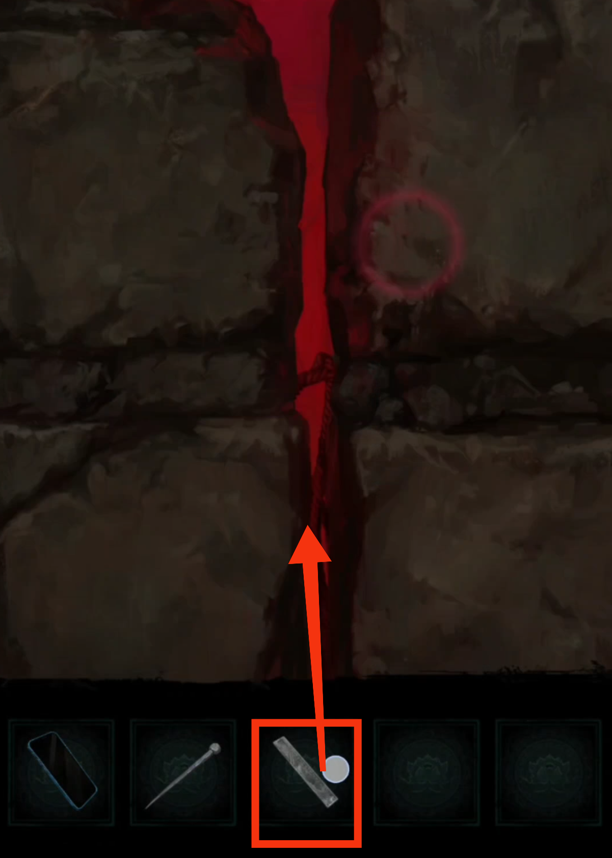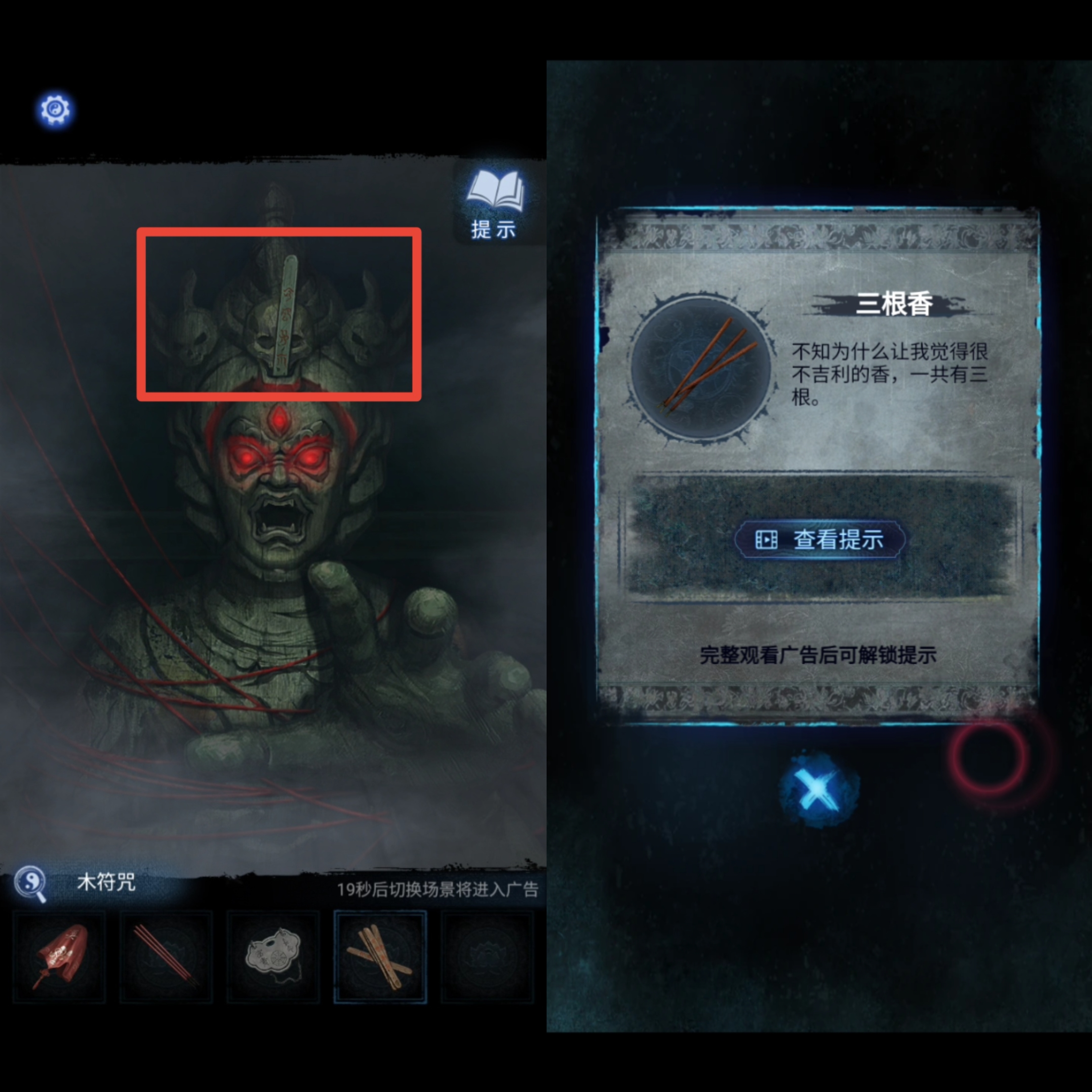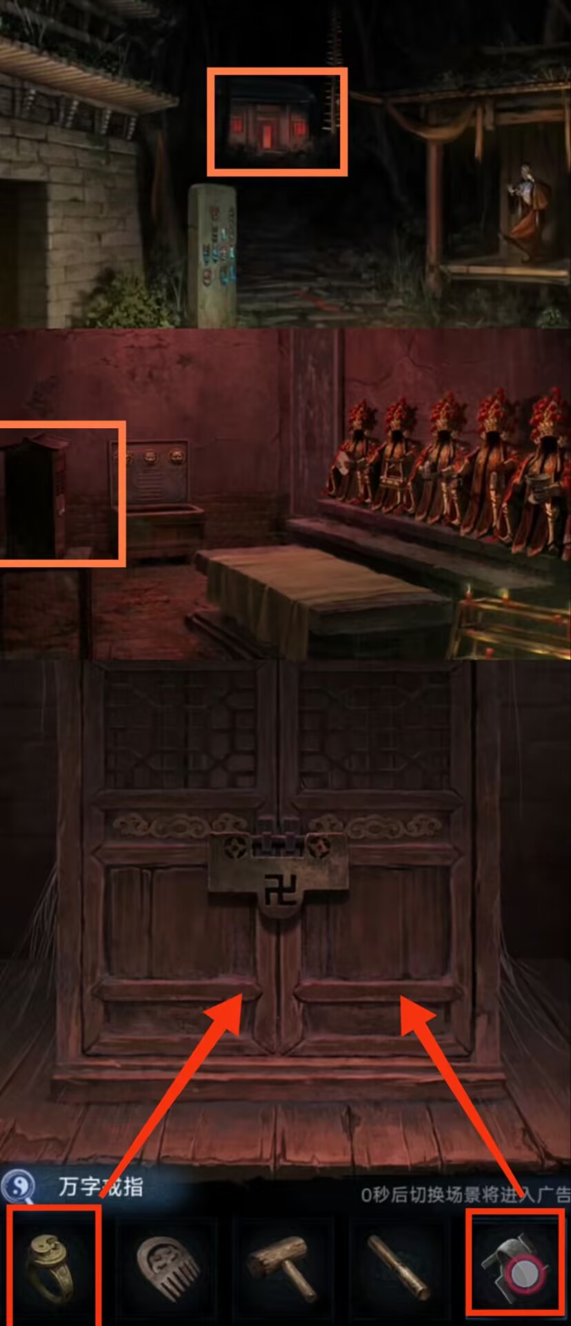8. 点击送礼的纸人,用【红剪刀】剪掉箱子上的红绳咒法,得到【半截尺子】。返回地图进入奉奘祠,用【红剪刀】与右侧符咒石狮子互动,然后根据步骤5的手指方向提示移动石板上的按钮,得到【三根香和另一把半截尺子】,尺子会自己合起来,成为【子孙尺】。