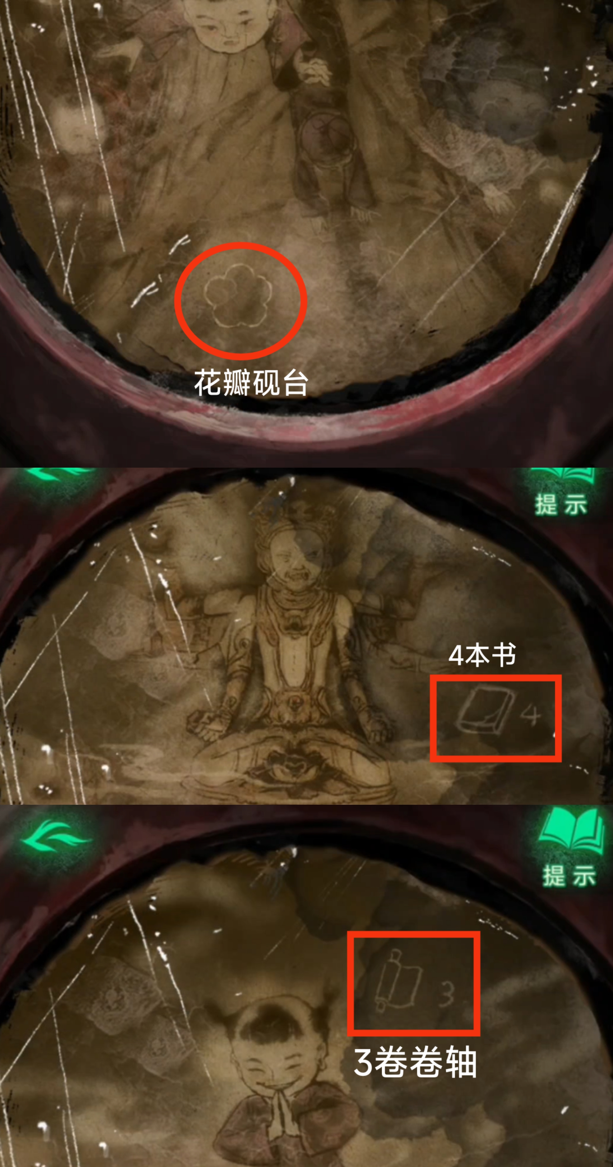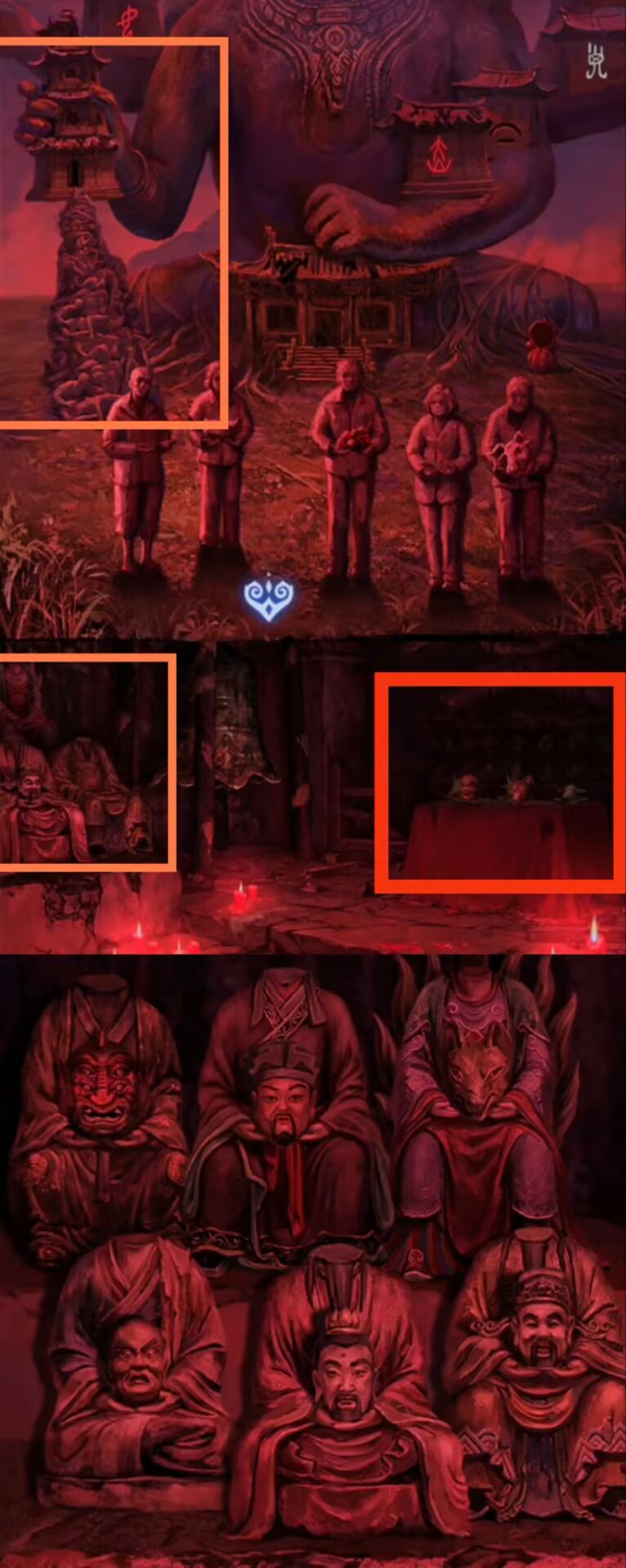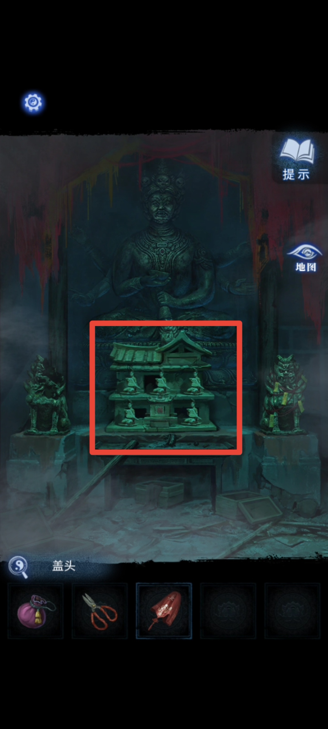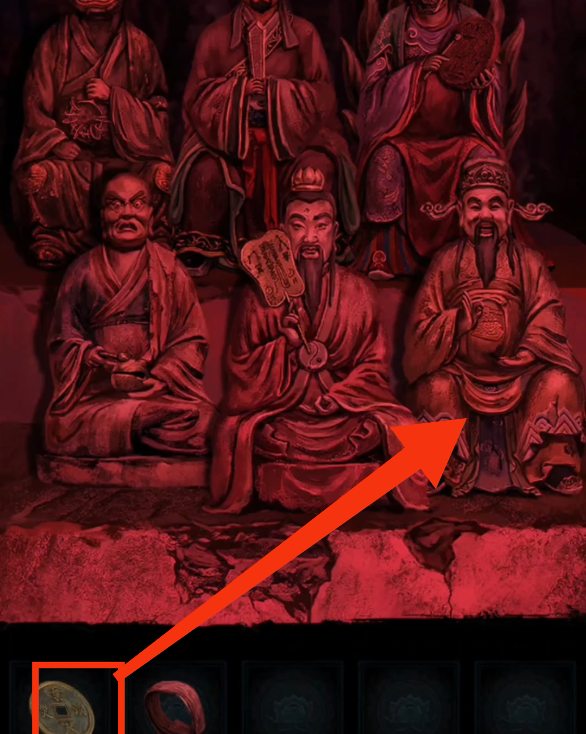 12. 切换至红色视角,进入塔内,调查神像,放置【大铜钱】。按照上一步骤中观察到的顺序,依次点击对应神像。拾取【三牲首像】。