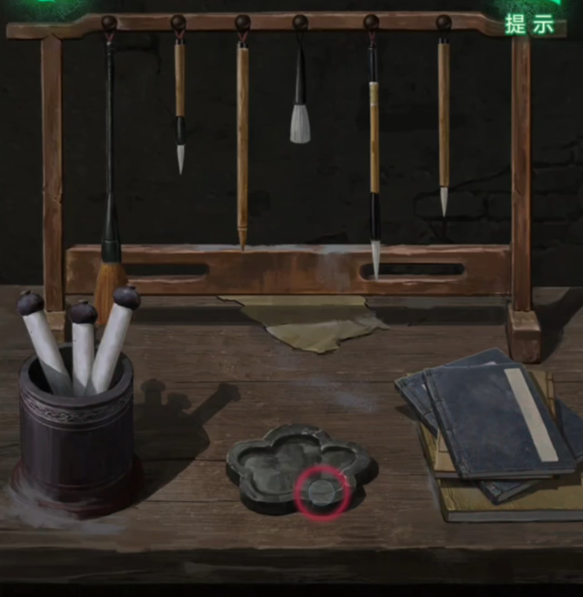 11.跟左侧的书架互动,根据掉下来的书上的内容提示,记下【毛笔摆放顺序】。然后去学堂左边的书案上,按照西洋镜的特殊标记和书上的毛笔摆放顺序复原书案上的物品数量和位置,得到【祈福风铃】。