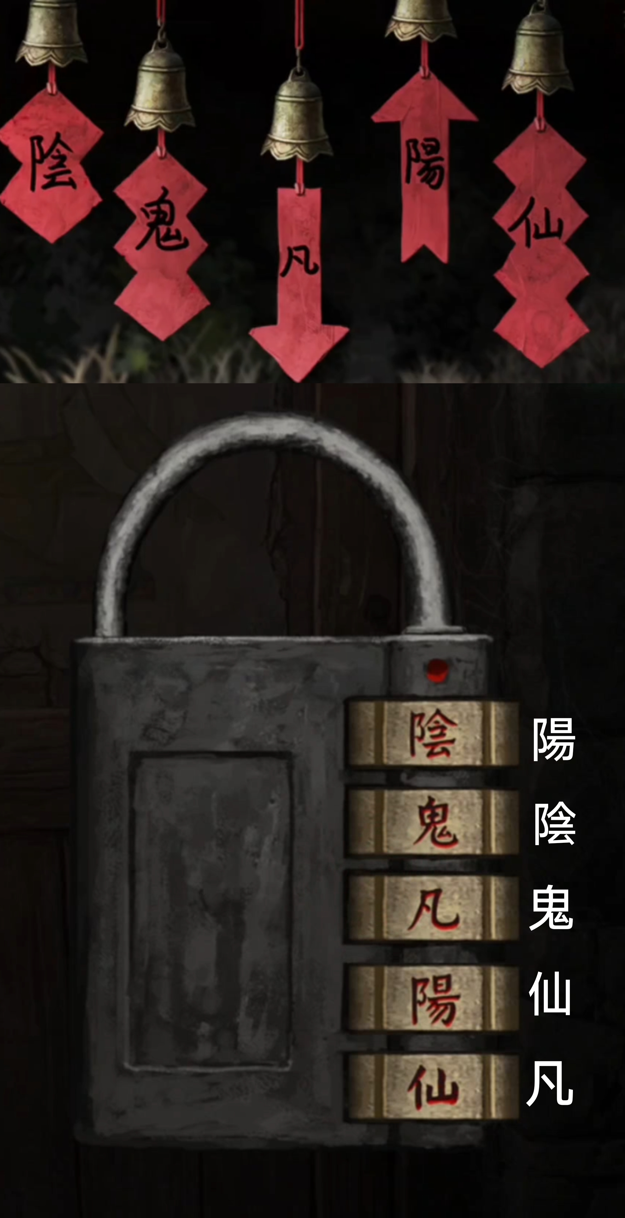 12.回到停车的场景发展剧情后,点击风车架,把【祈福风铃】挂上去,得到【阴鬼凡阳仙】的文字位置提示(箭头代表字的首尾位置,阳在最上面,凡在最下面,其他的字根据几个组合起来的方块数,像阴就是阳的下面,位于第二)。