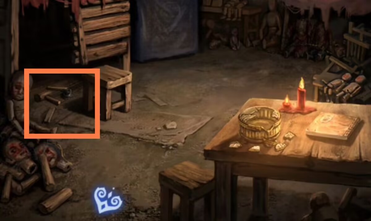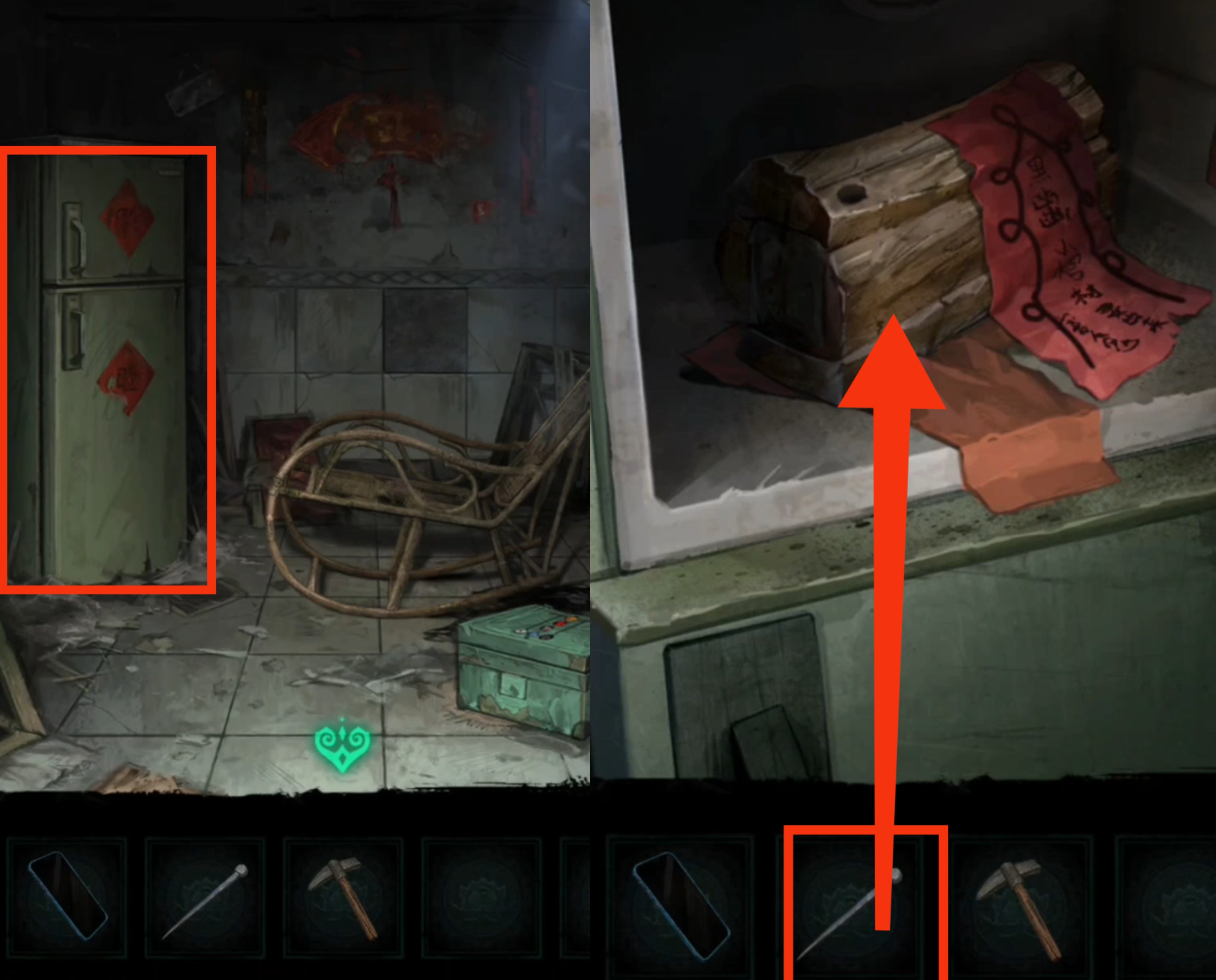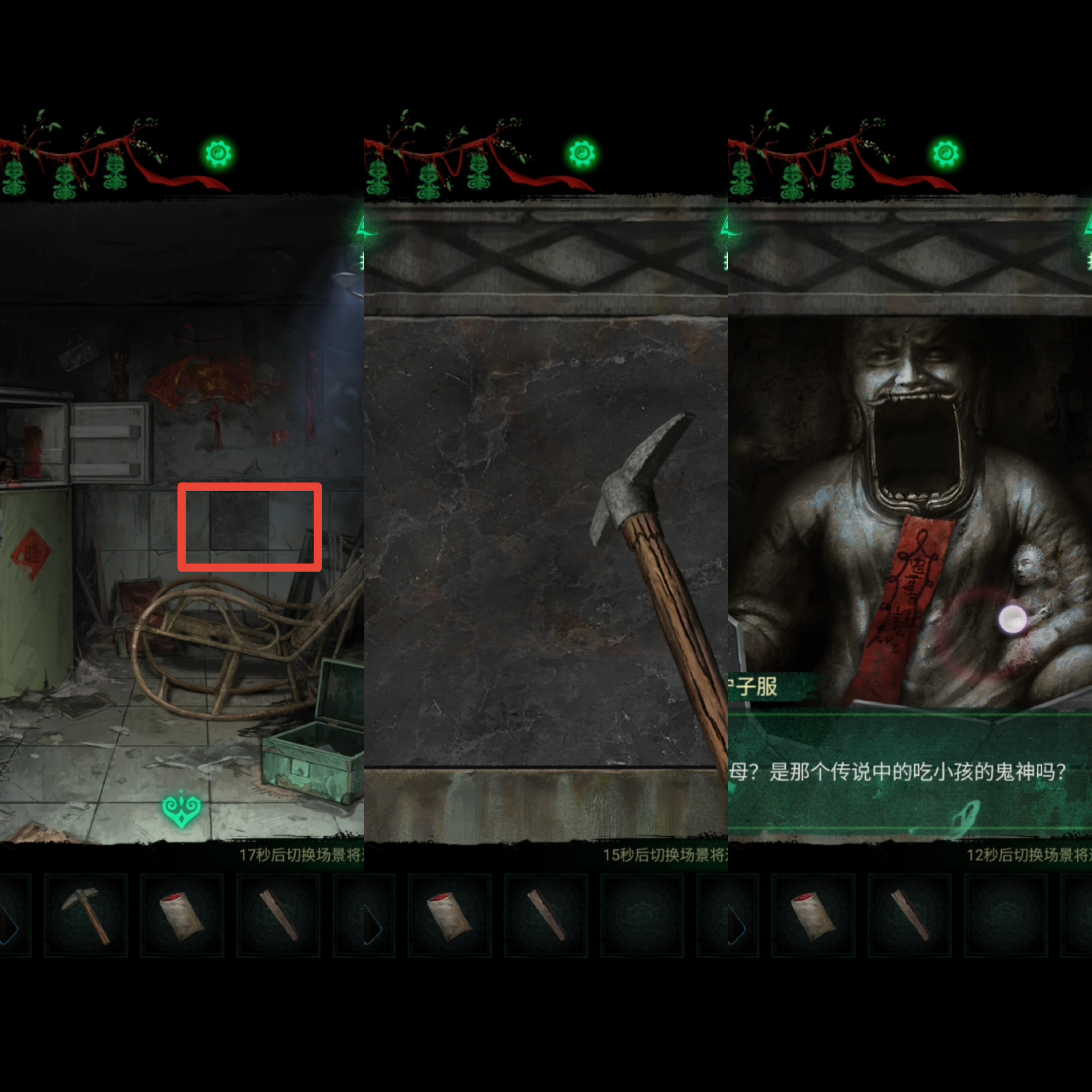 15.打开房间冰箱上层,给冰箱里的棺材插入【棺材钉】,得到一根短木条(拖拉机里木人缺失的一条腿)。然后返回,找到房间中间部分一块灰色瓷砖的位置,使用【锤头】,发现鬼子母,并得到它不能食用朱砂的提示。
