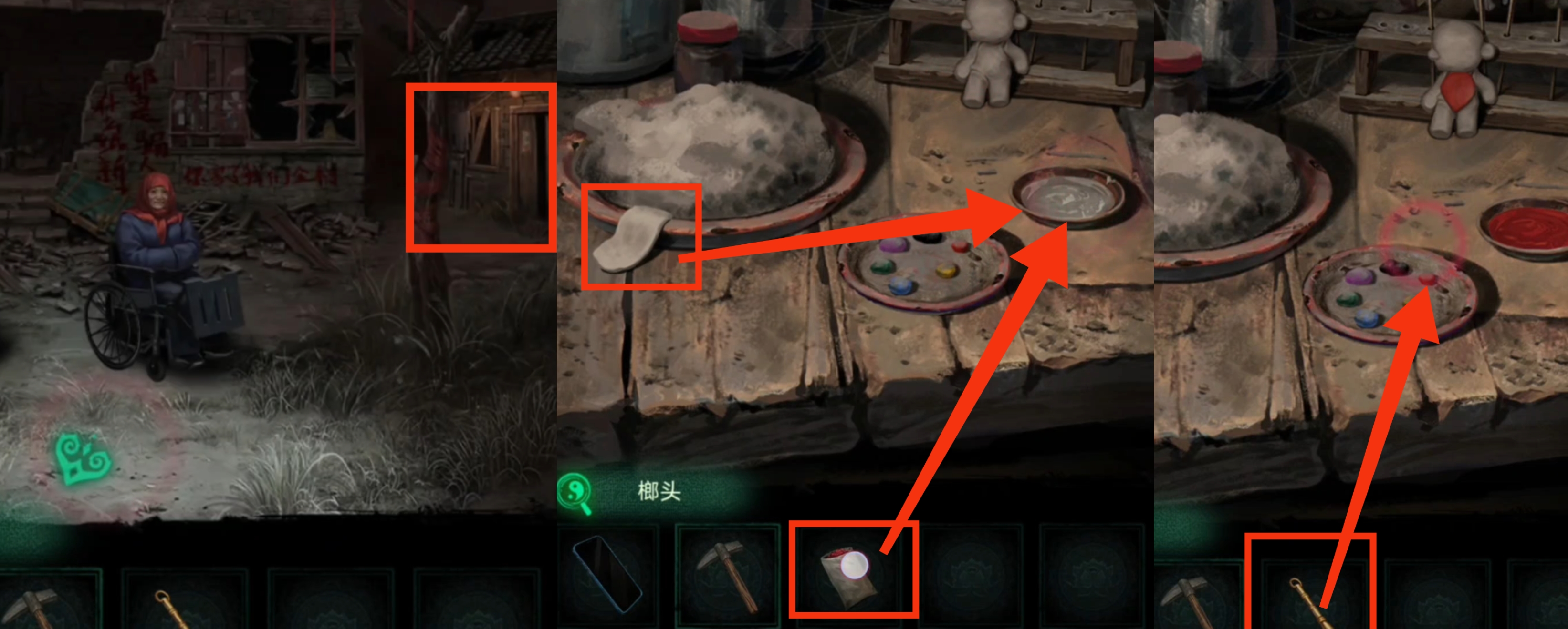 17.与瓦房屋中有面人的桌子互动,把【朱砂】倒在有水的碗里,再把【金笔】蘸颜料把面人做好,就得到一个可以喂食给鬼子母的带有朱砂的【面人】。