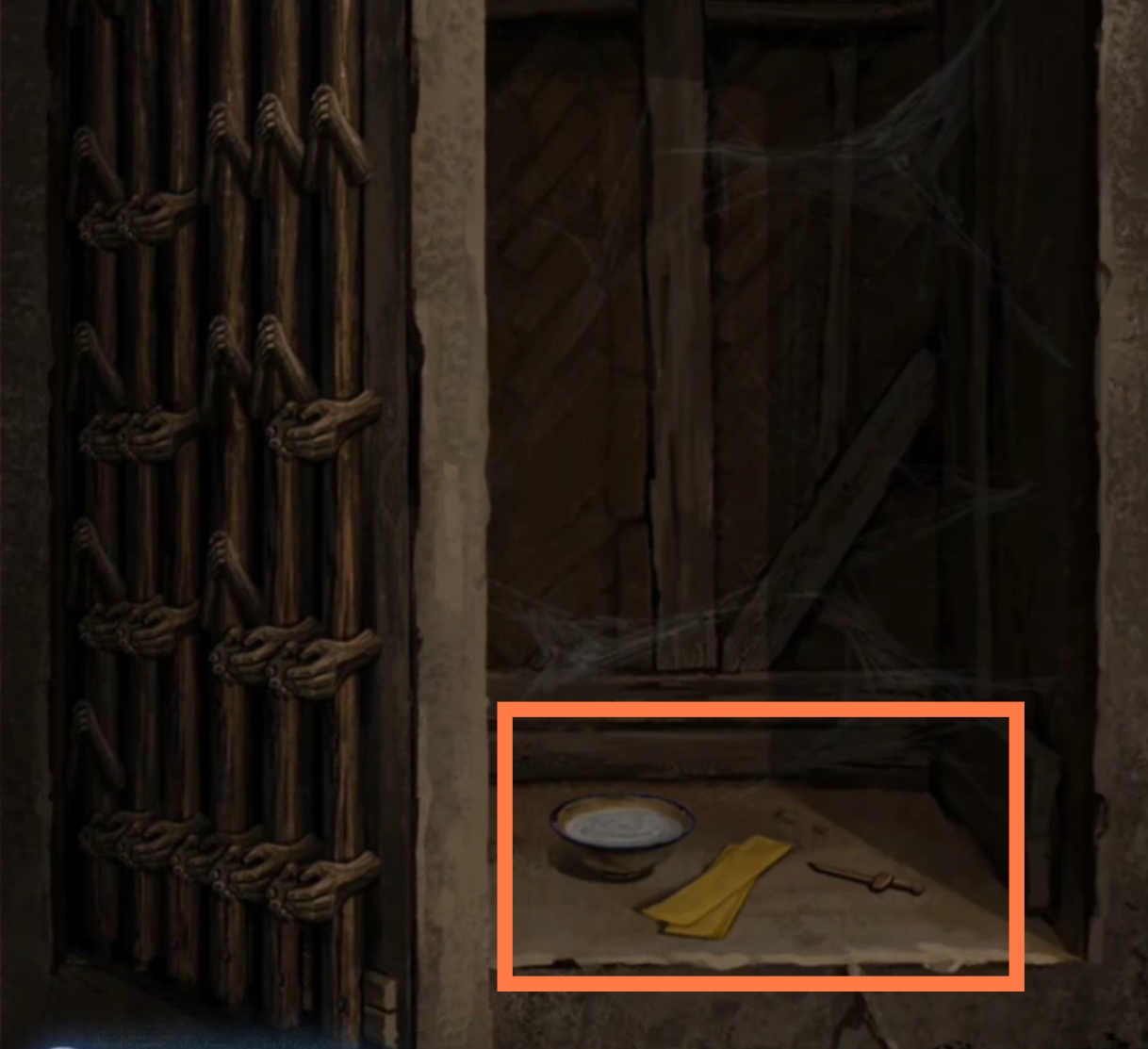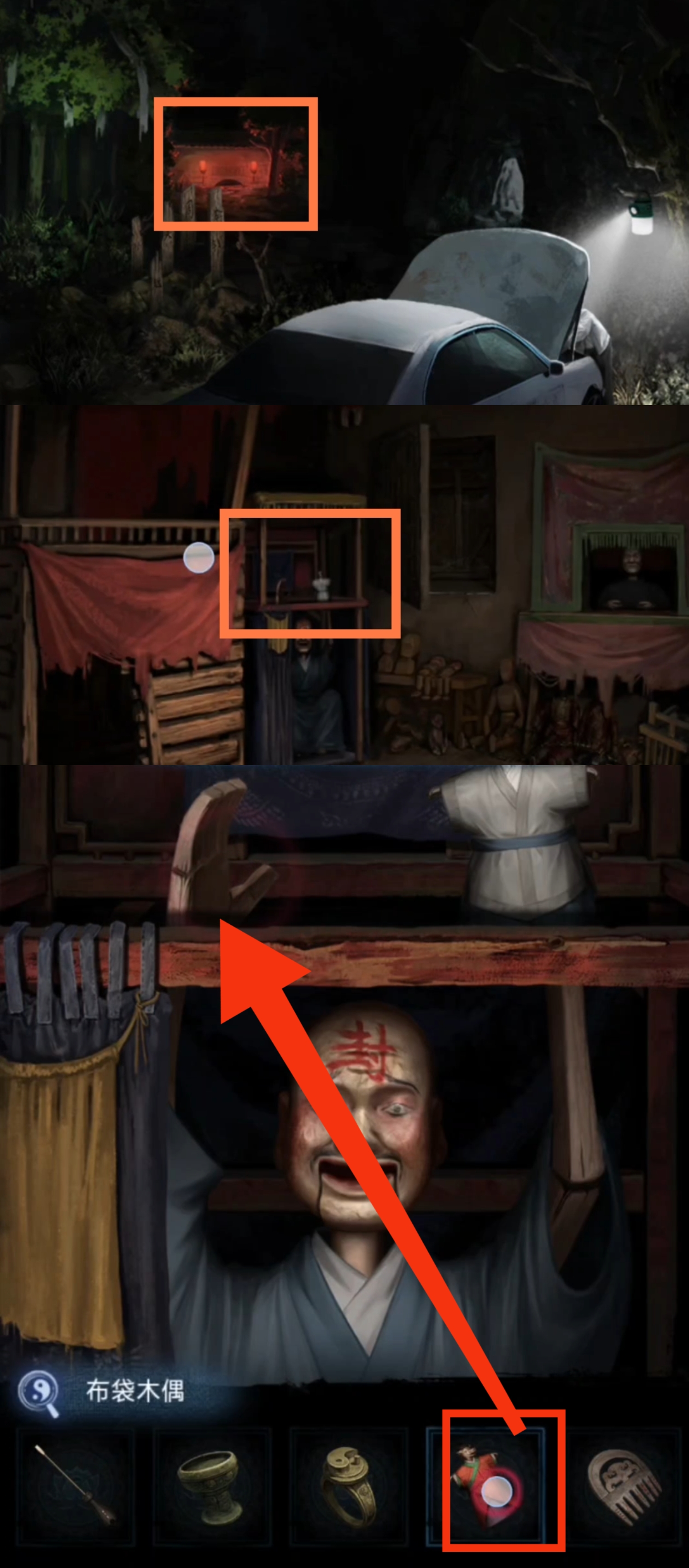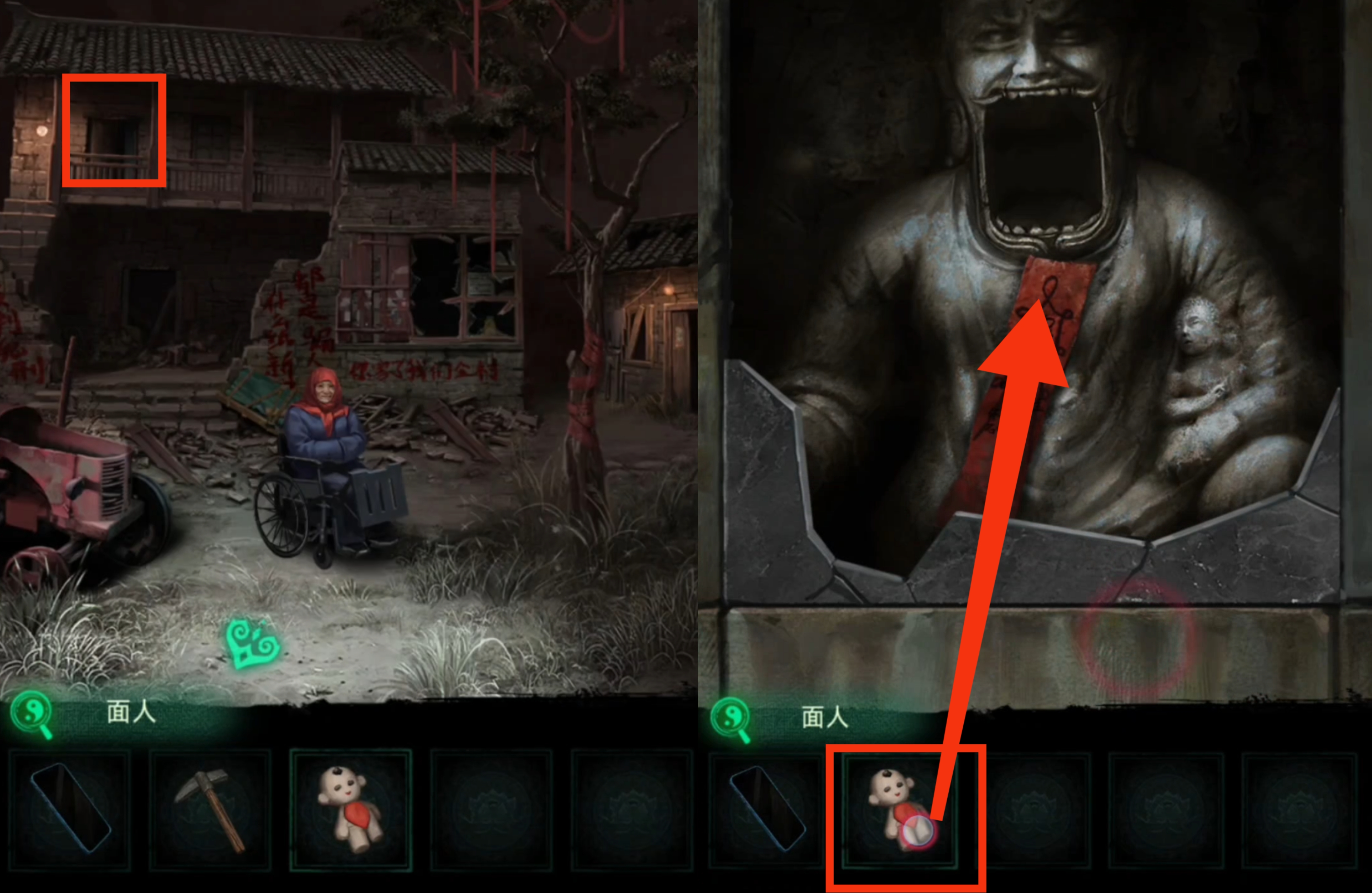 13. 进入弃煞牢场景,点击左后侧木偶,使用【布袋木偶】。拾取【布袋木偶】。