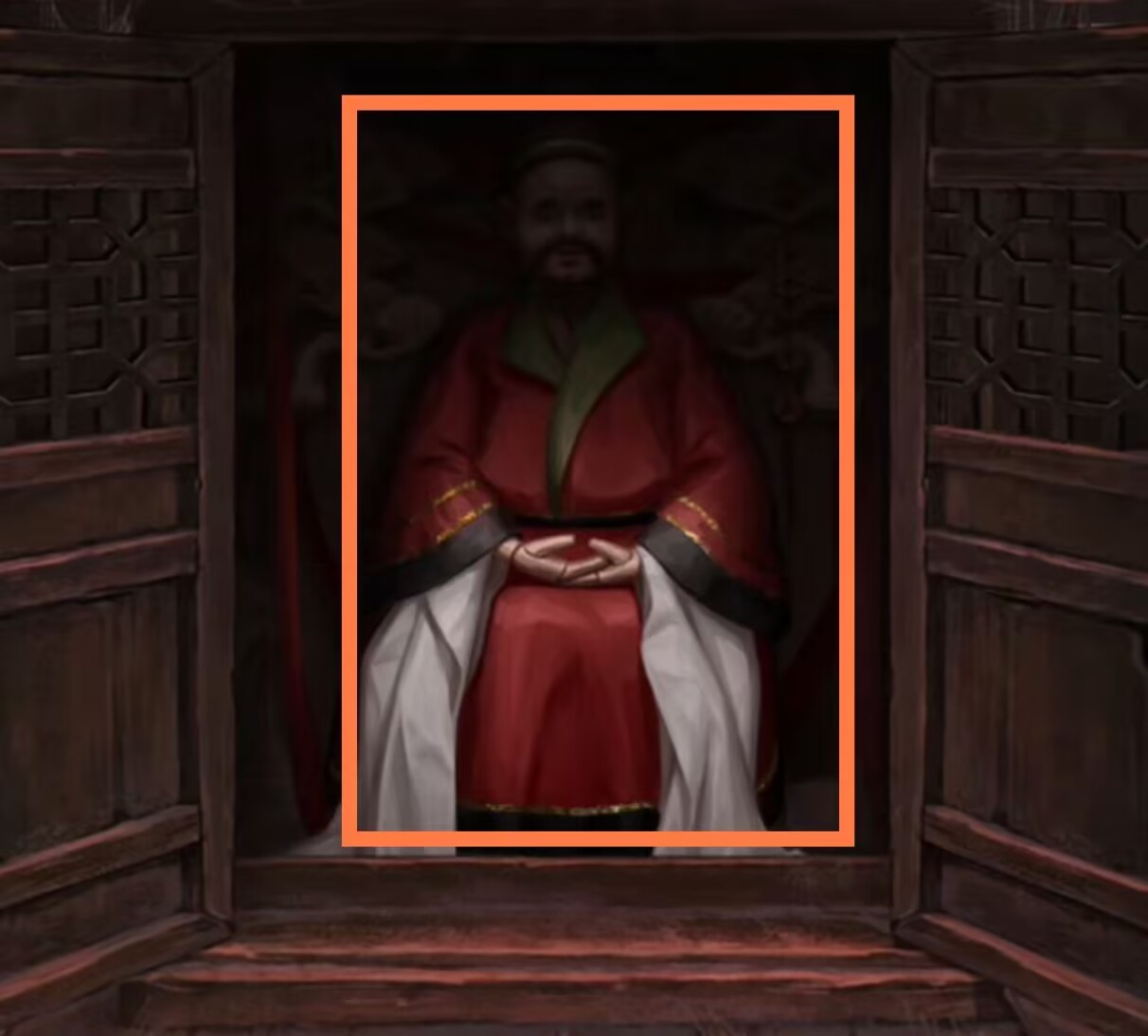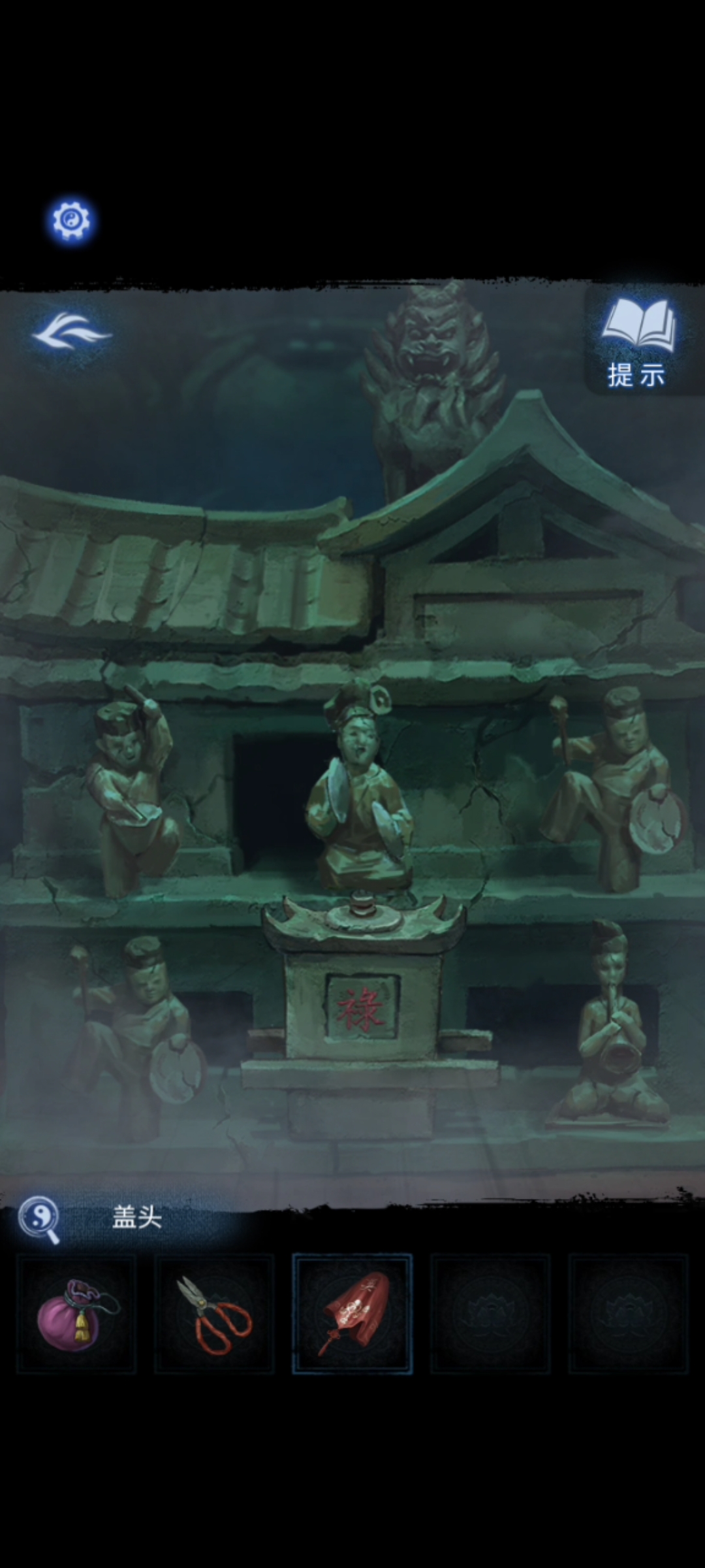 5. 成功进入祠堂后,直接点击中间有六个仕女的部分,根据步骤1的六个祈福牌提示,按顺序把仕女变成【敲鼓的、拿镲的、拿锣的、拿锣的、禄、吹唢呐的】,得到【木雕少女】和【瓷器娃娃】。再记住塌陷的房子上手指方向的提示,并检查右侧符咒石狮子和神像。