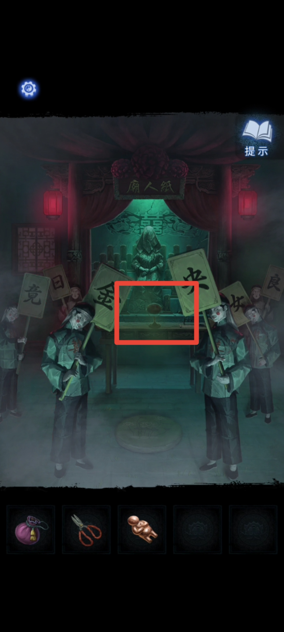 2. 按照剧情走向,从地图中进入六礼轩。先拿走桌上的【纸扎剪刀】,然后检查六礼轩的神像、屏风、抬礼的纸人和房顶上吊着的神龛。