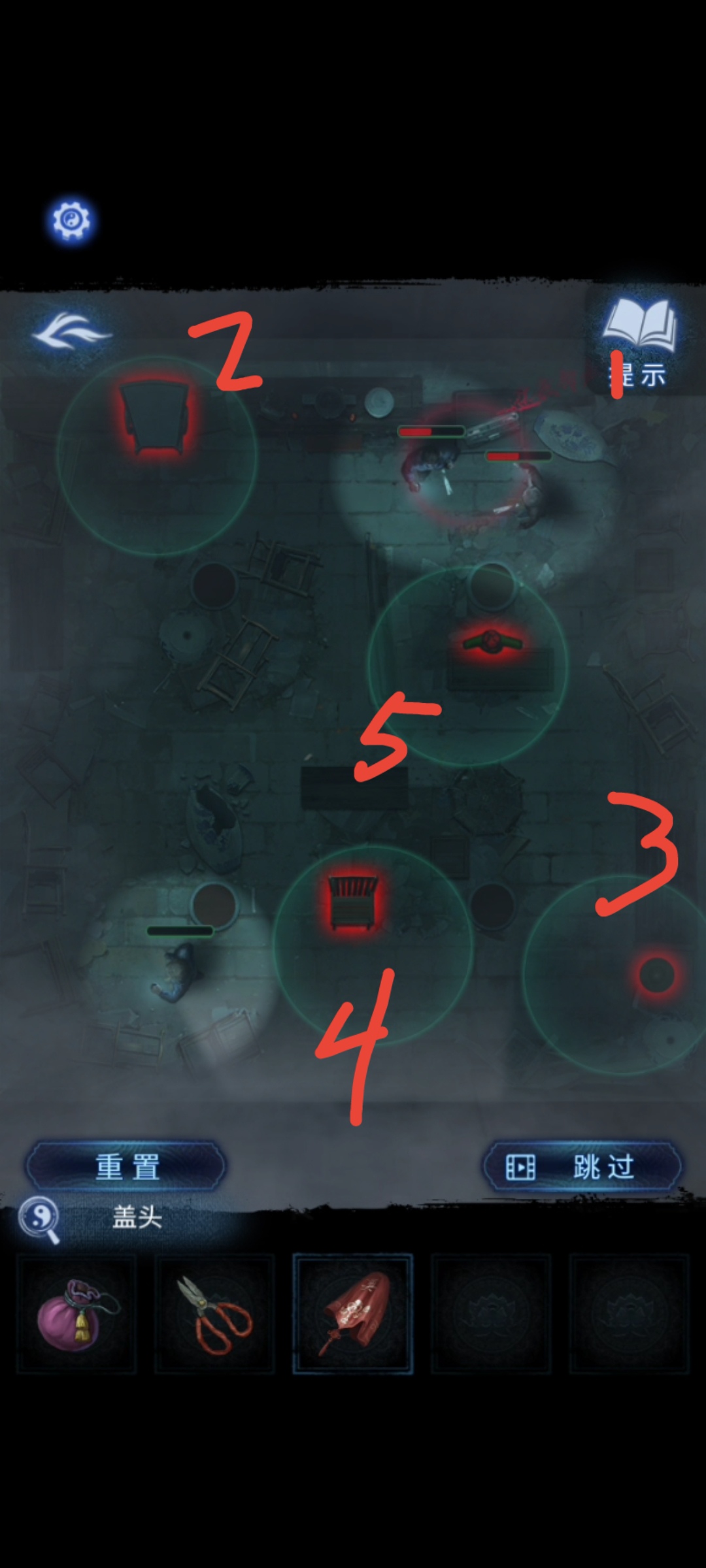 4. 用【盖头】进入小游戏环节,在这里说一下小游戏的诀窍。一个是三人中,有两个人会在路径上有重合部分,多观察一会儿后,可按照两人重合的路径【先触发右上角的收音机→左上角的镜子→右下角的台灯→中下的椅子→最后第三个人身边的纸人】。