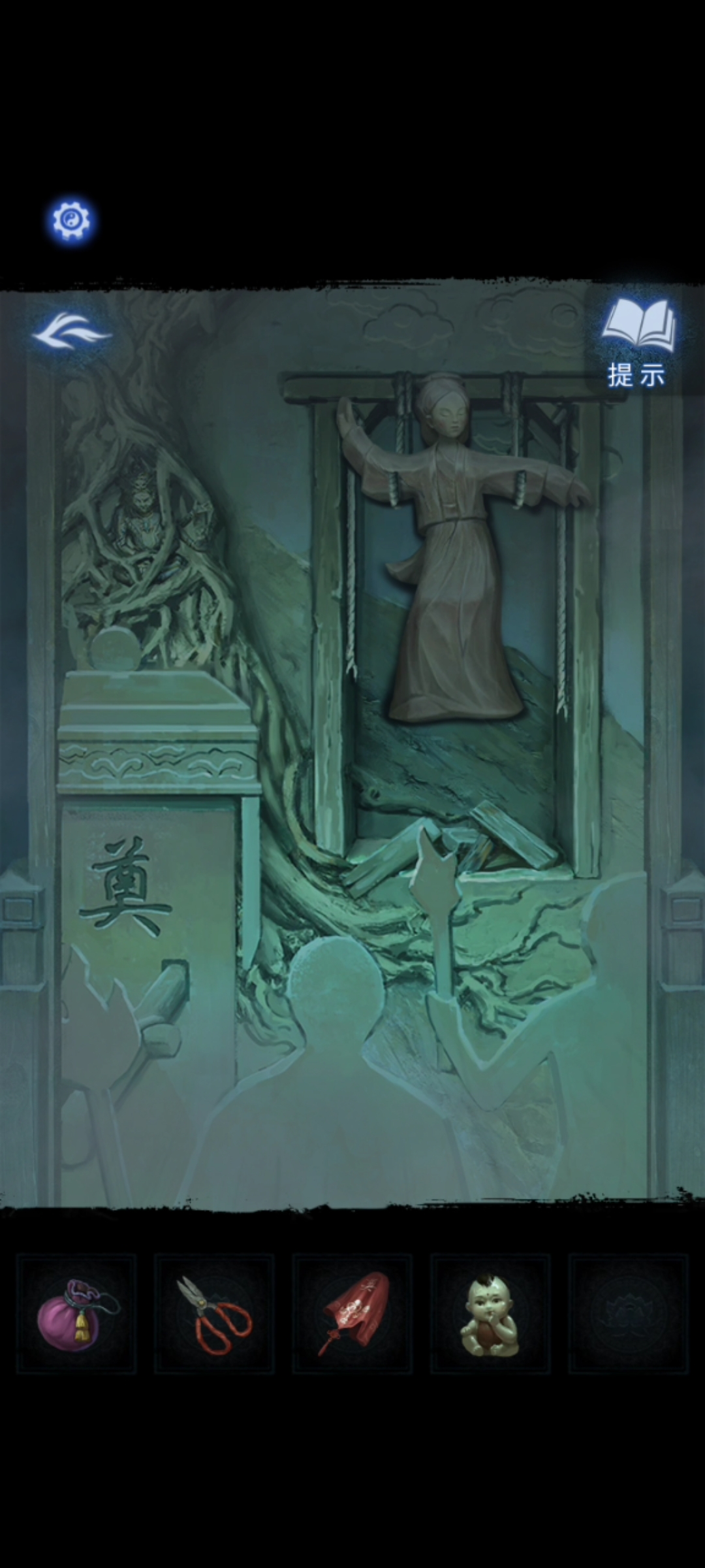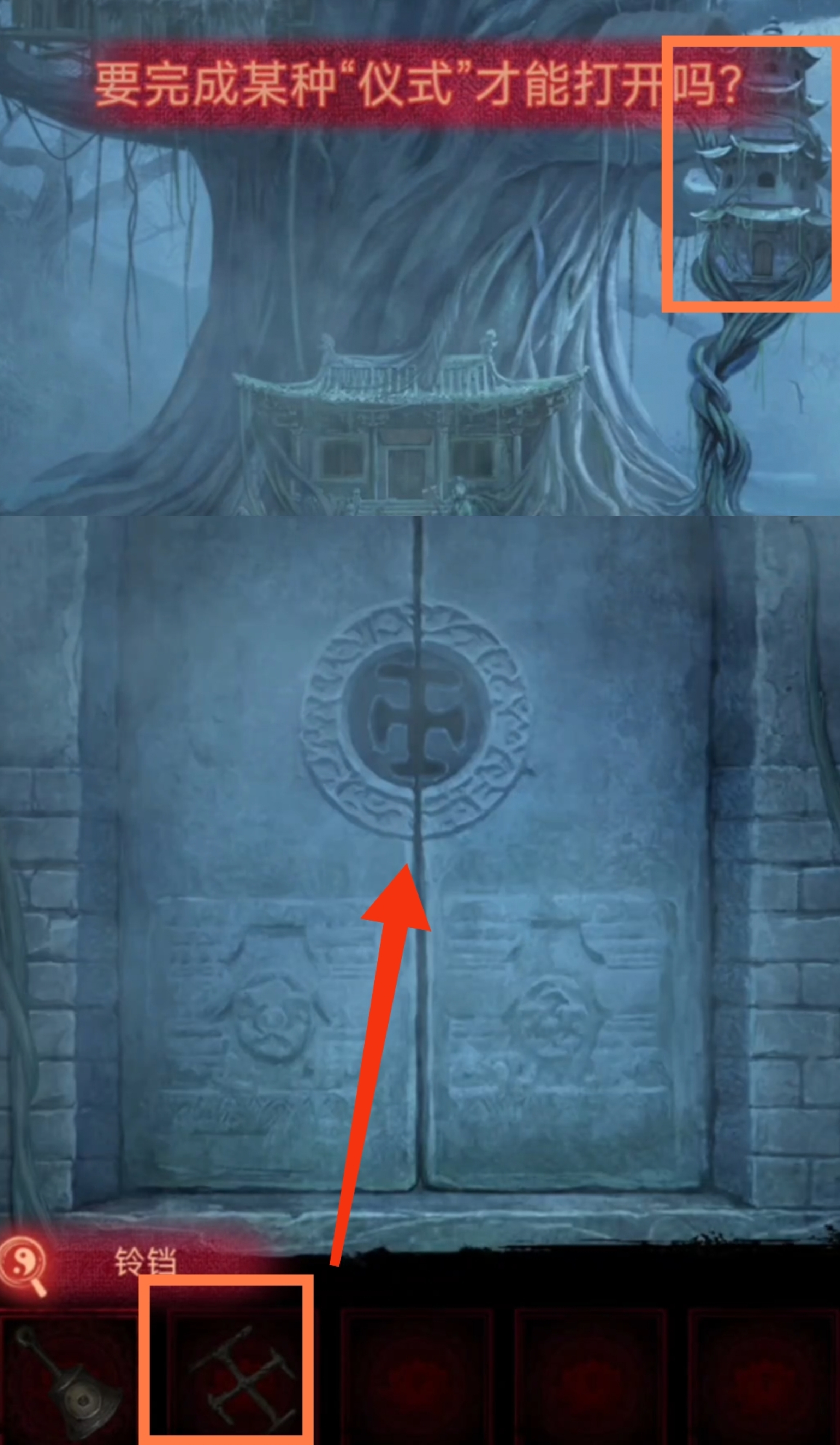 6.返回塔内,调查大钟,放置【铃铛】。调查神坛,点击拾取【铜扇】,【师刀】。调查塔内浮雕墙,注意观察浮雕墙上摊面的位置。返回大树场景,调查树上纸人的位置。