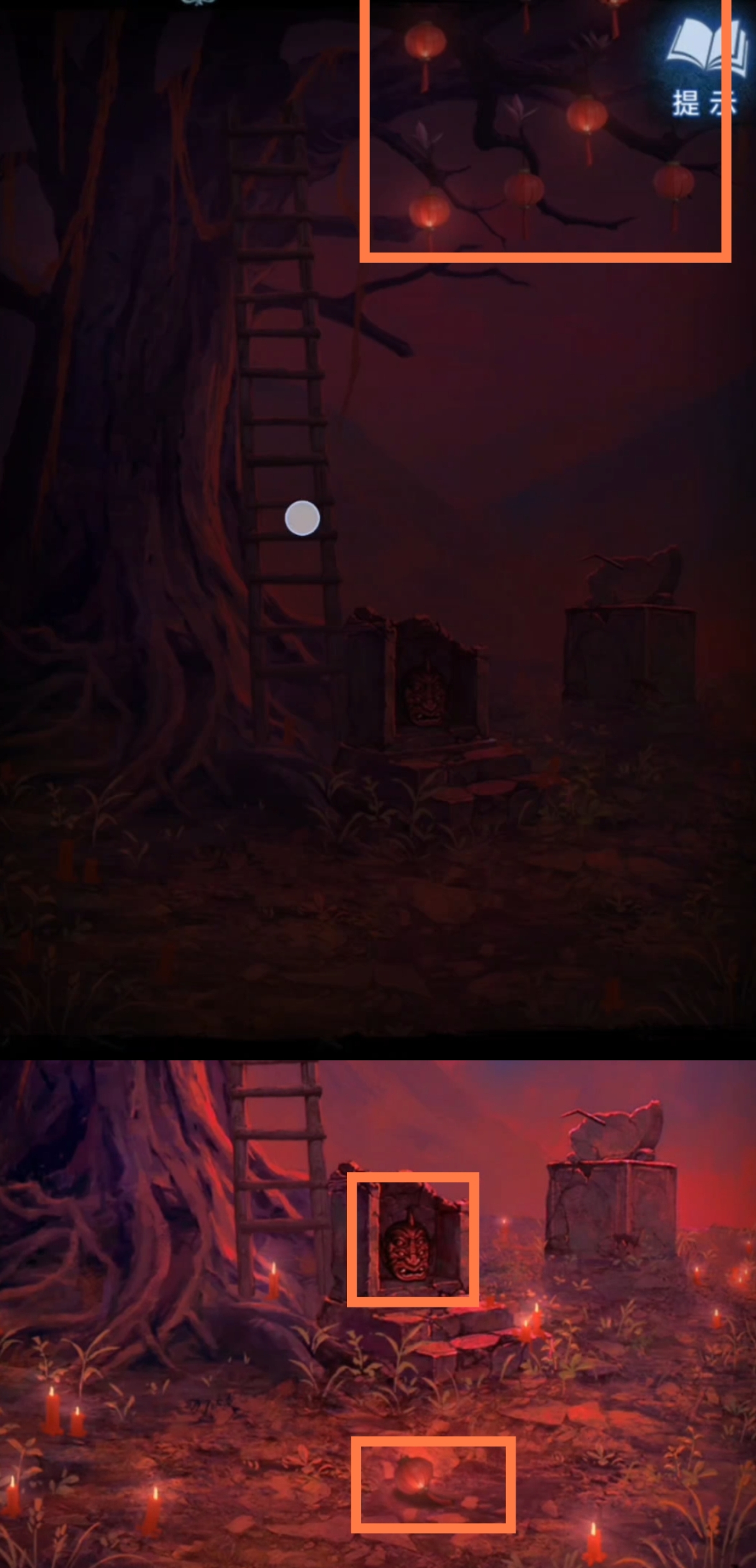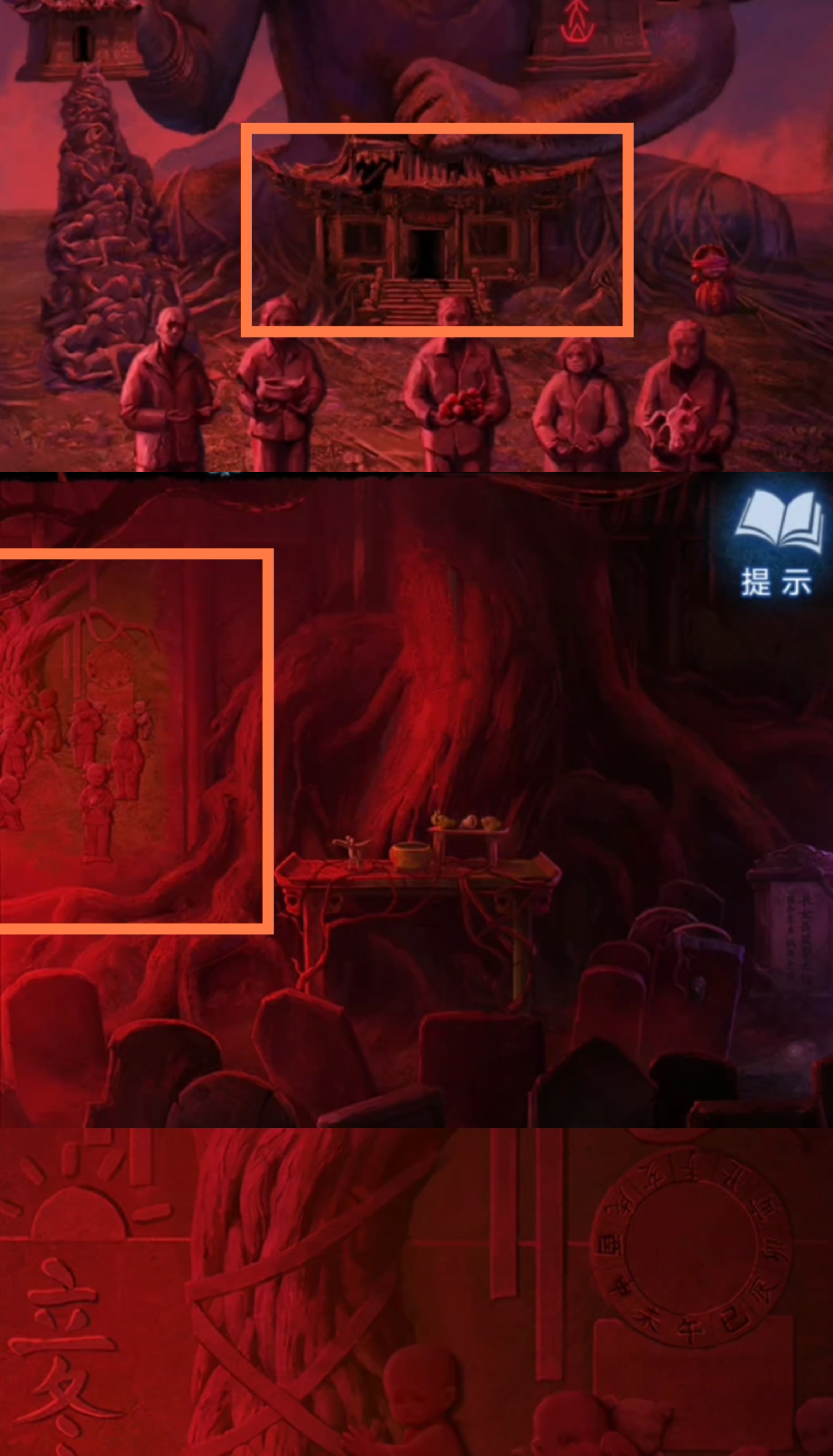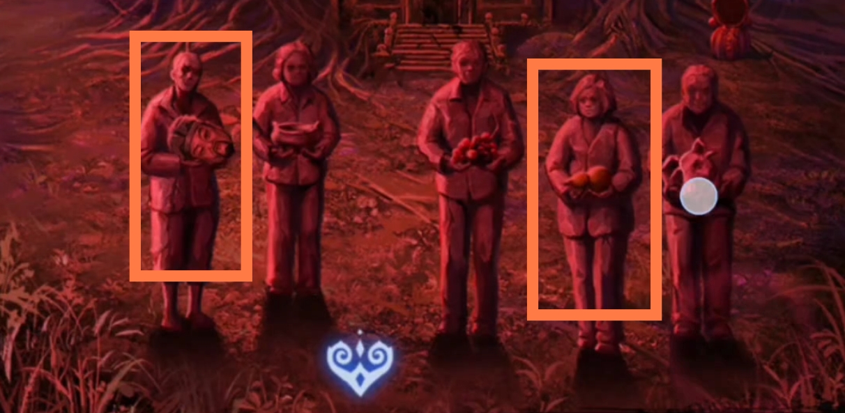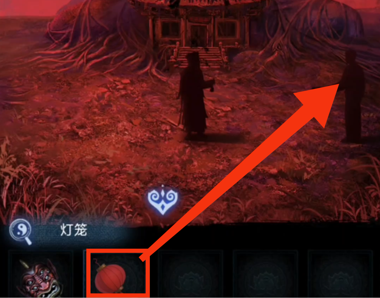 1. 点击树上的灯笼,进入点灯小游戏环节。保持莫琪视角(为方便区分,以下统称为红色视角),拾取【灯笼】和【泥塑头像】。进入六葬菩萨场景,给予黑影灯笼,注意观察五人手捧的祭品类型,从左到右分别为【泥塑人头,香炉,果子,葫芦,牲头】。
