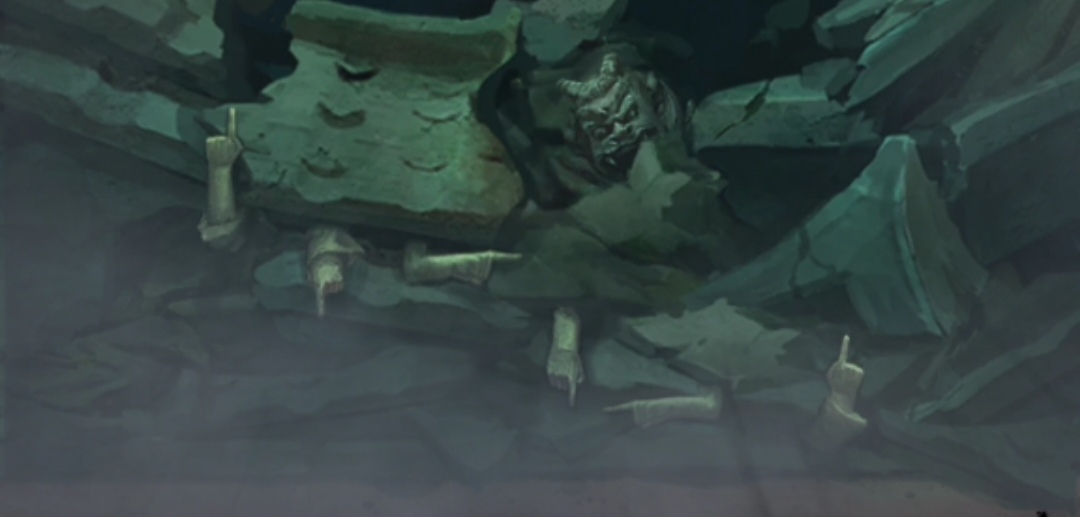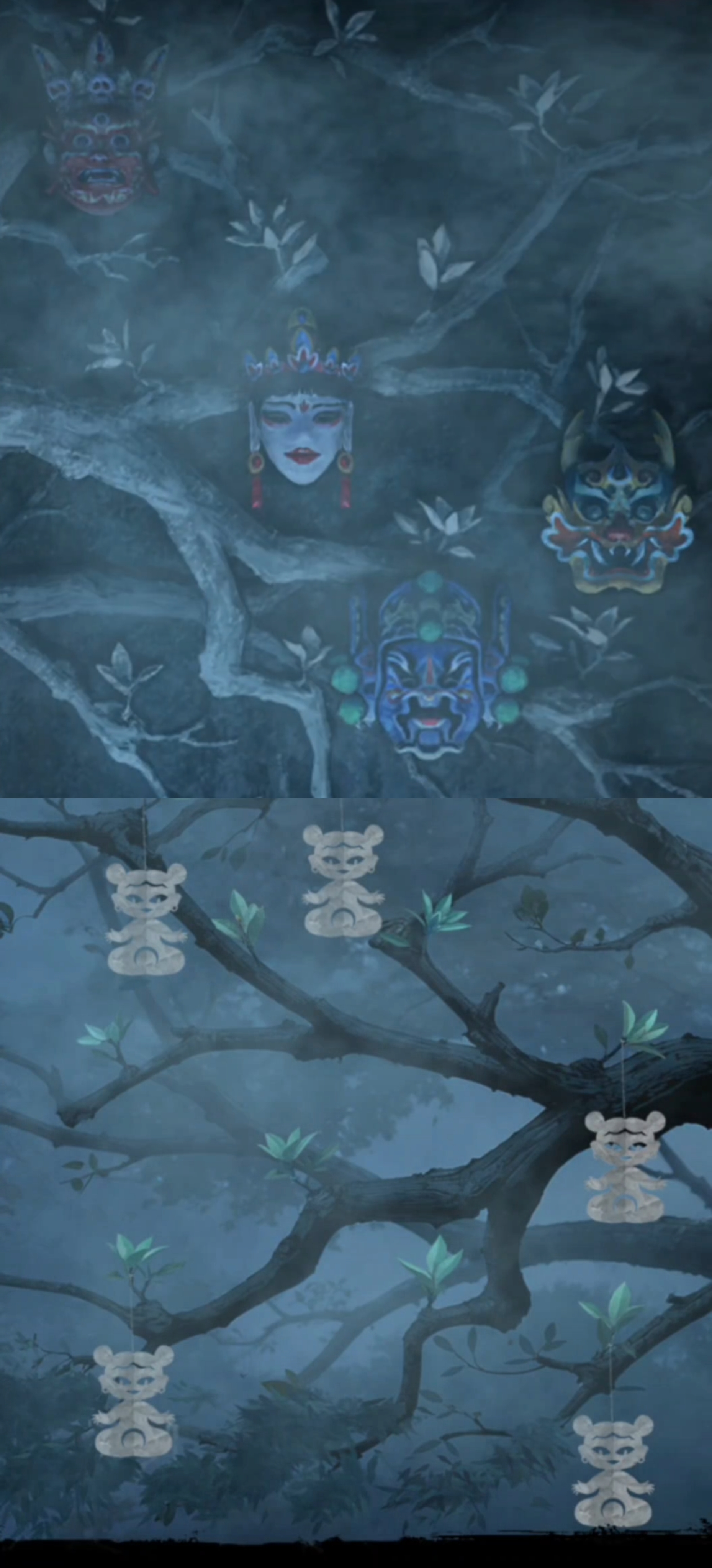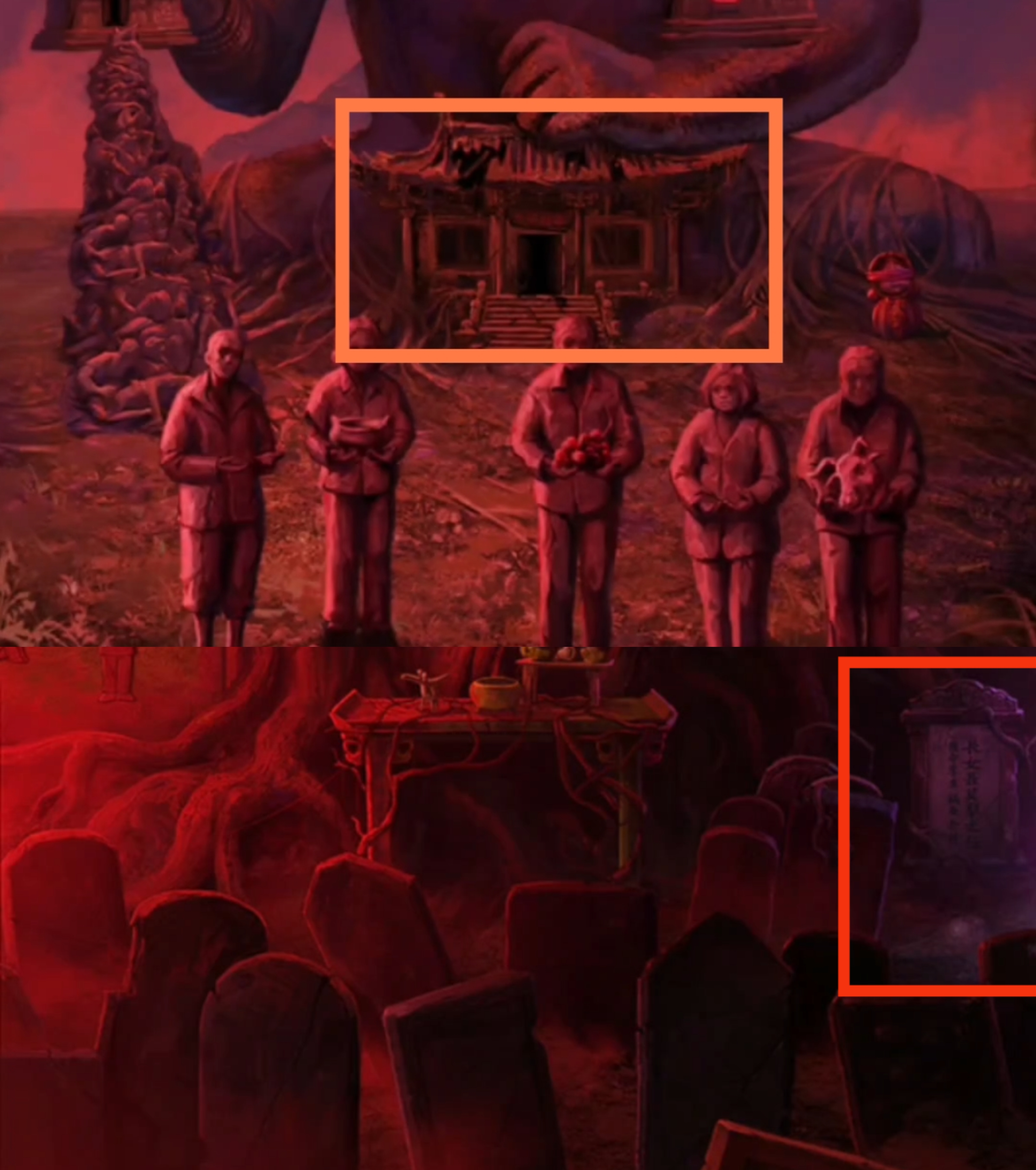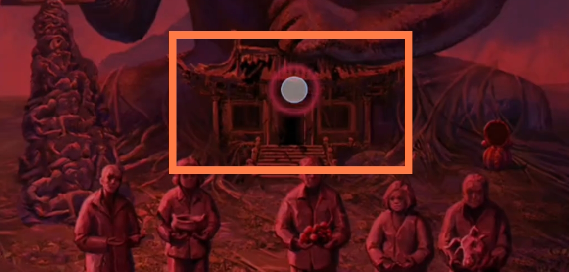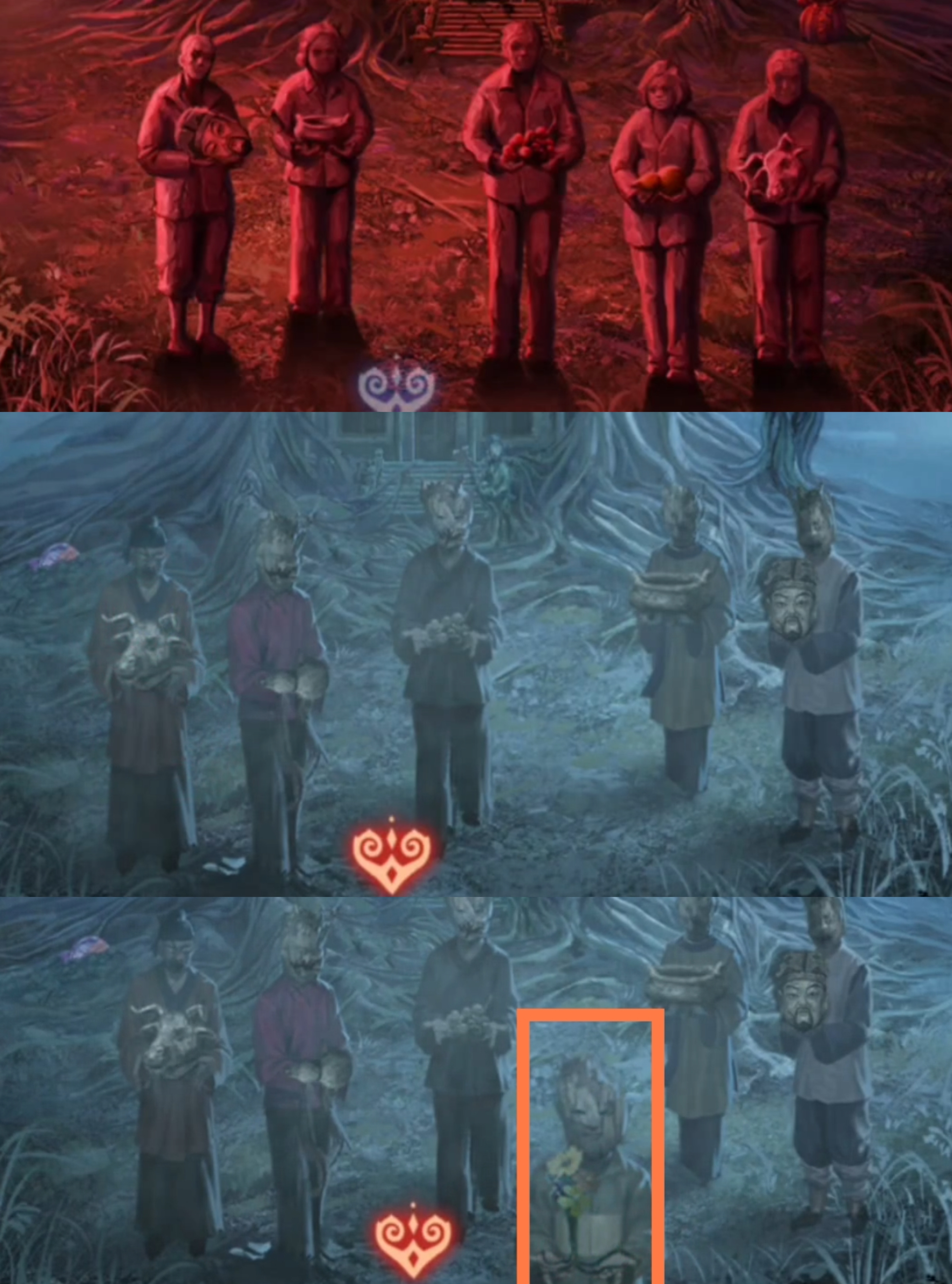 1. 点击树上的灯笼,进入点灯小游戏环节。保持莫琪视角(为方便区分,以下统称为红色视角),拾取【灯笼】和【泥塑头像】。进入六葬菩萨场景,给予黑影灯笼,注意观察五人手捧的祭品类型,从左到右分别为【泥塑人头,香炉,果子,葫芦,牲头】。