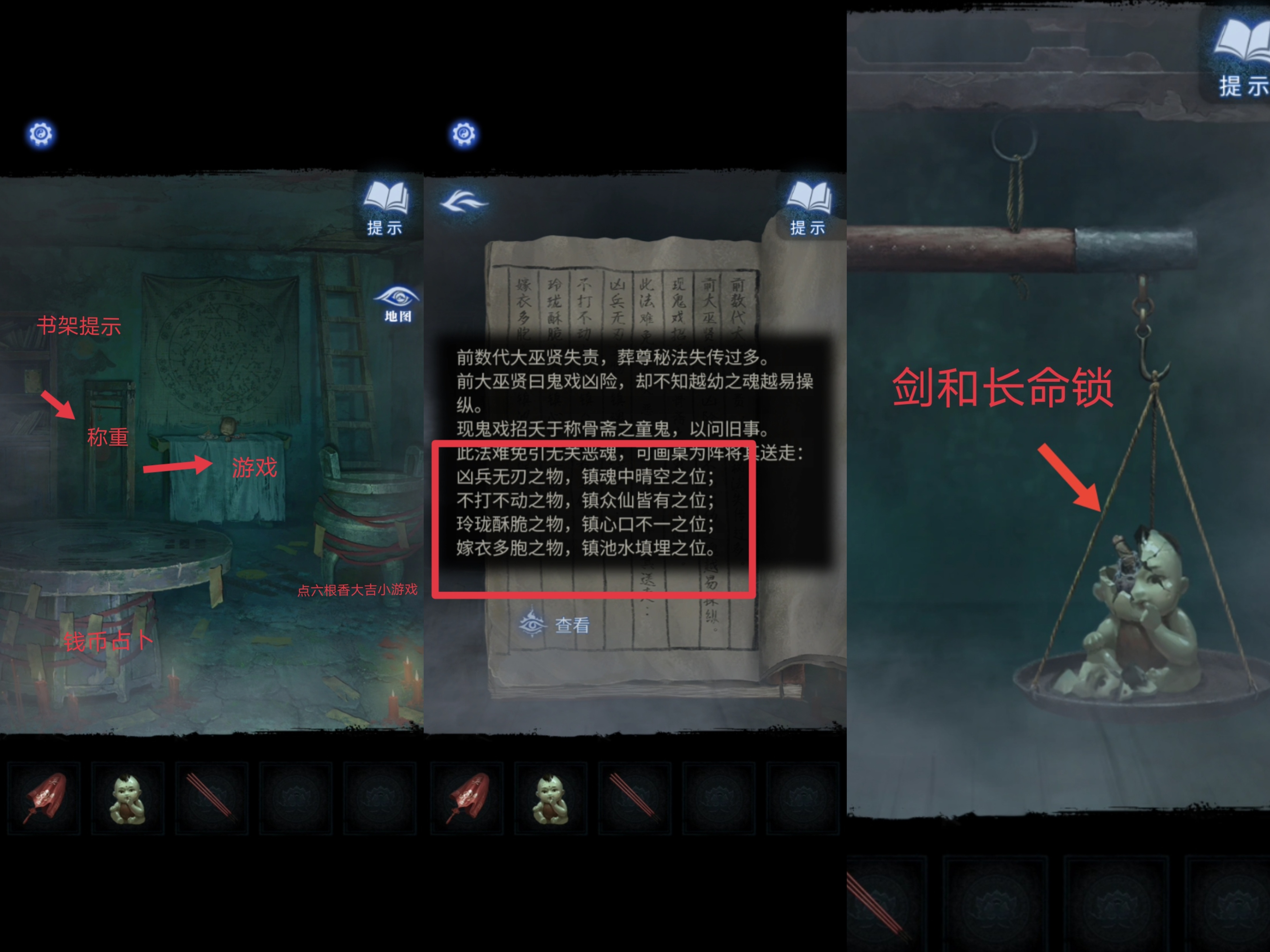9. 从地图进入称骨斋,检查周围场景,点击书架阅读称骨录,得到现鬼戏的解谜线索。然后返回点击旁边的称,把【瓷器娃娃】放上去,得到【纸扎剑和长命锁】。