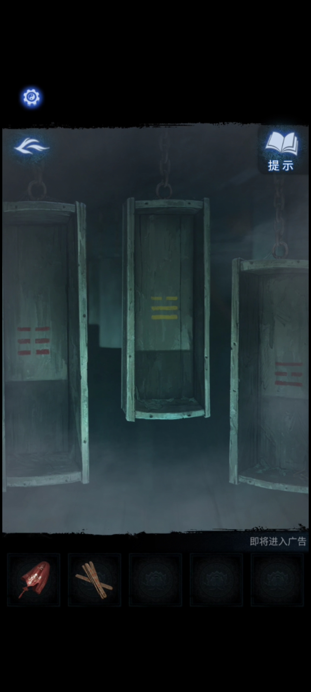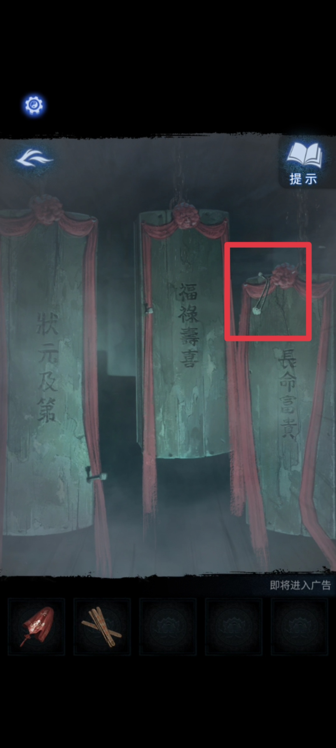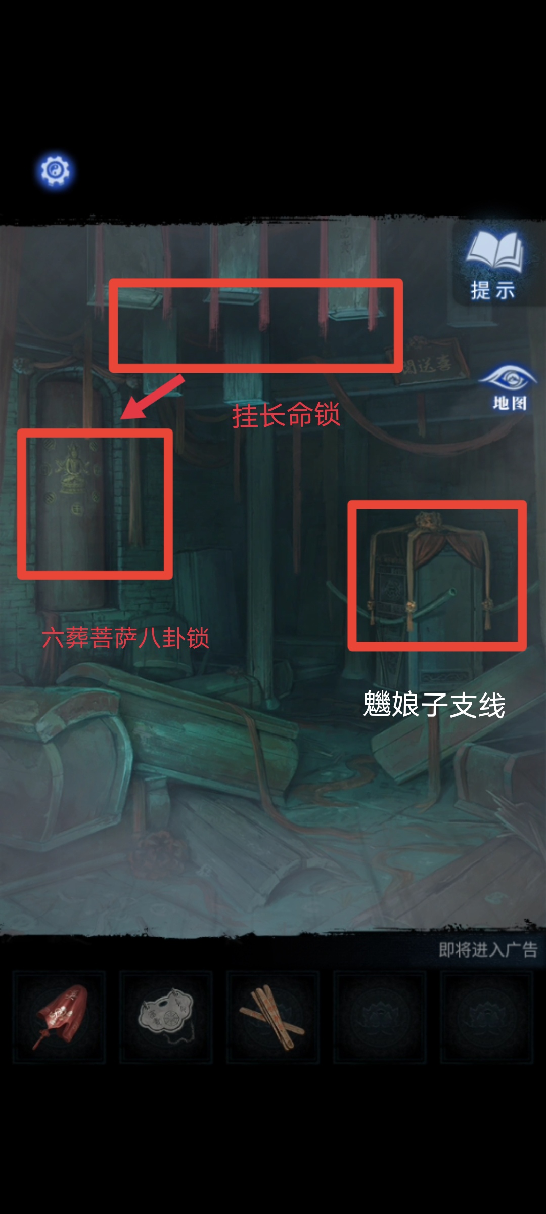 13.地图解锁送喜阁后进入,检查周围事物。再点击挂在空中的棺材,把【长命锁】挂在长命富贵棺材的钉子上,在棺材打开后得到送喜阁墙上六葬菩萨的点八卦提示之一。
